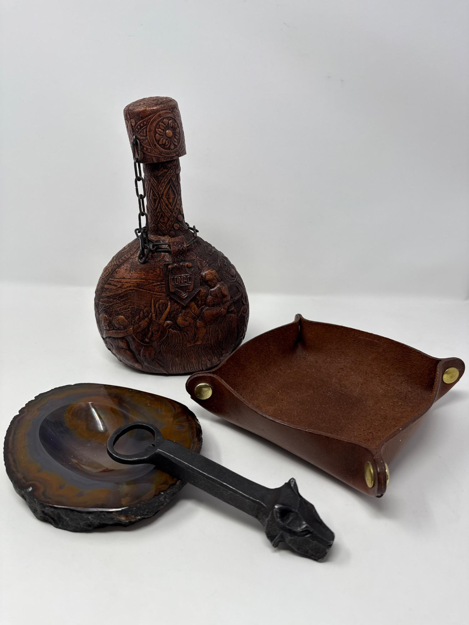 Lot # 16 - Vintage Leather Whisky Bottle, Valet Tray & Agate Trinket Bowl