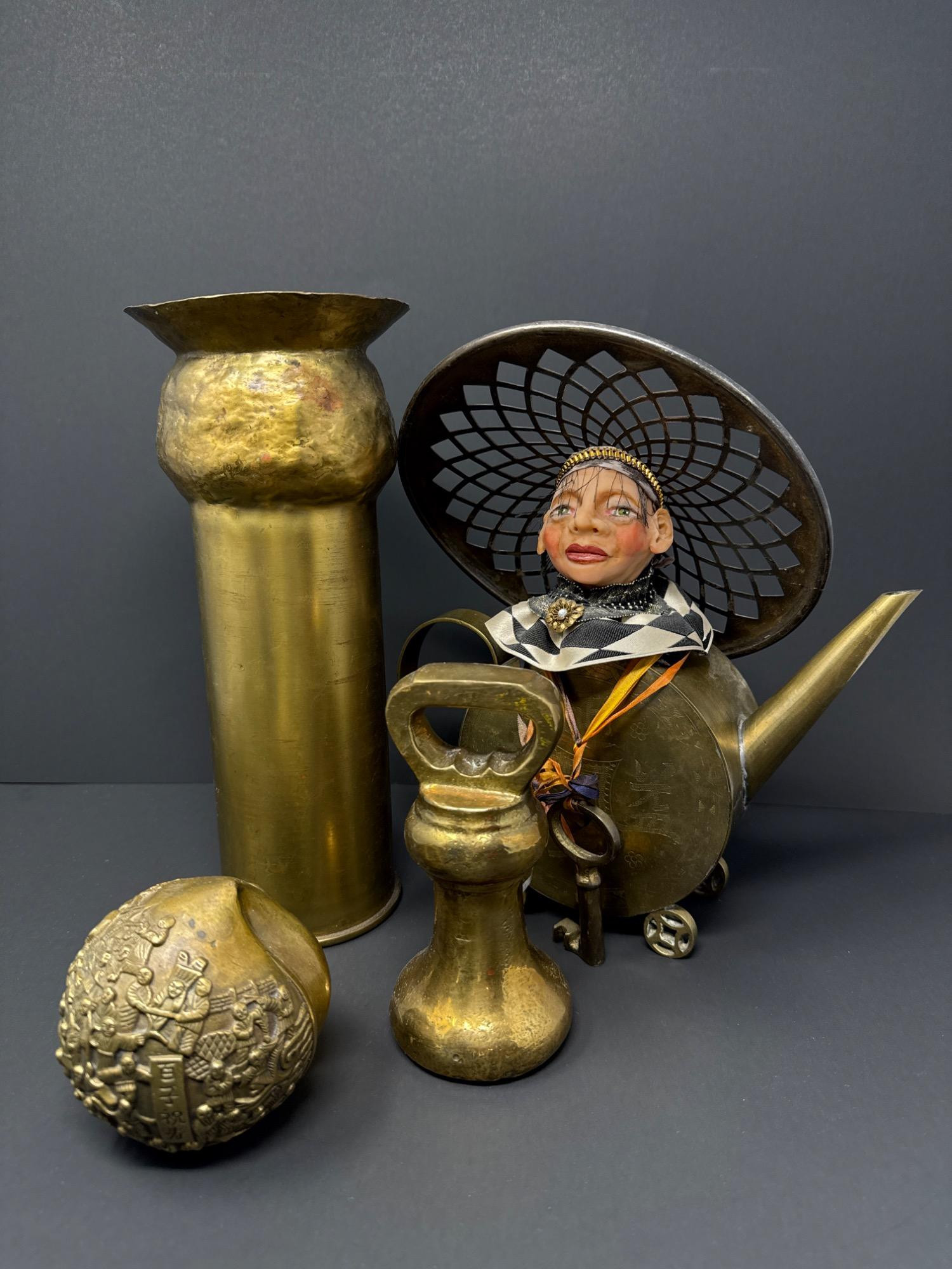 A charming and diverse collection of vintage brass items, including: WWI Trench Art Vase – Repurposed from a 1916 artillery shell casing, featuring beautifully hand-hammered details. Measuring 10.5” H x 5.5” W Solid Brass Grocer’s Weight – Heavy 5.5" tall and 7lb weight with classic handled design. Marked “Warranted / Staffs” on base. Bronze Buddha Paperweight – Ornately detailed with raised relief figures and cultural motifs. Measuring 3.5” diameter. Decorative Brass Kettle – A whimsical piece adorned with a jester/clown head and ribbon collar. Sits on four small wheels and features engraved Asian characters on the body (symbolizing “longevity” and “prosperity”). Topped with an intricate lattice-like dish as a headpiece. Measuring 10” H x 18” W Bonus Items – Includes an oversized vintage key and additional small brass accents.
