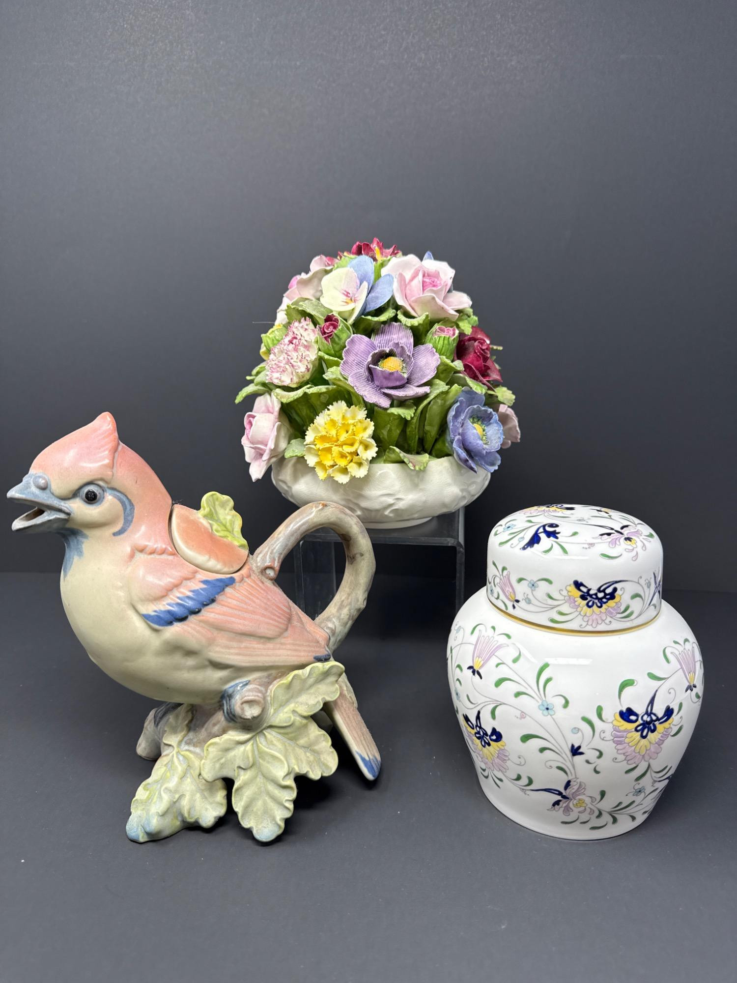 Bring timeless English elegance to your collection with this exquisite 3-piece ceramic set, featuring: Aynsley Floral Bouquet (6.5" H x 6" W) Coalport Ginger Jar (5.5" H x 4" W) Bird Figural Pitcher (7.5" H x 4" W)