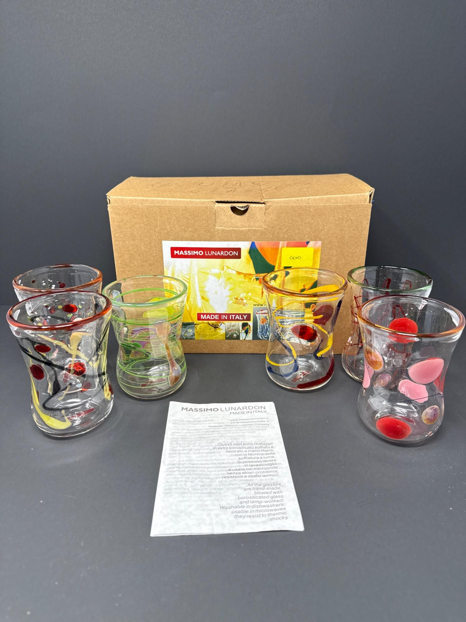 Elevate your glassware collection with this stunning set of six artisan glasses by Massimo Lunardon, handcrafted in Italy. Each piece is individually lamp-worked and made from borosilicate glass, known for its durability and resistance to thermal shock. Set includes: 6 unique glasses Dimensions: Approx. 4.5" Tall x 3.25" Wide Condition: Excellent, appears unused with original box and care insert Features: Dishwasher-safe, microwave-safe, heat-resistant Made in Italy