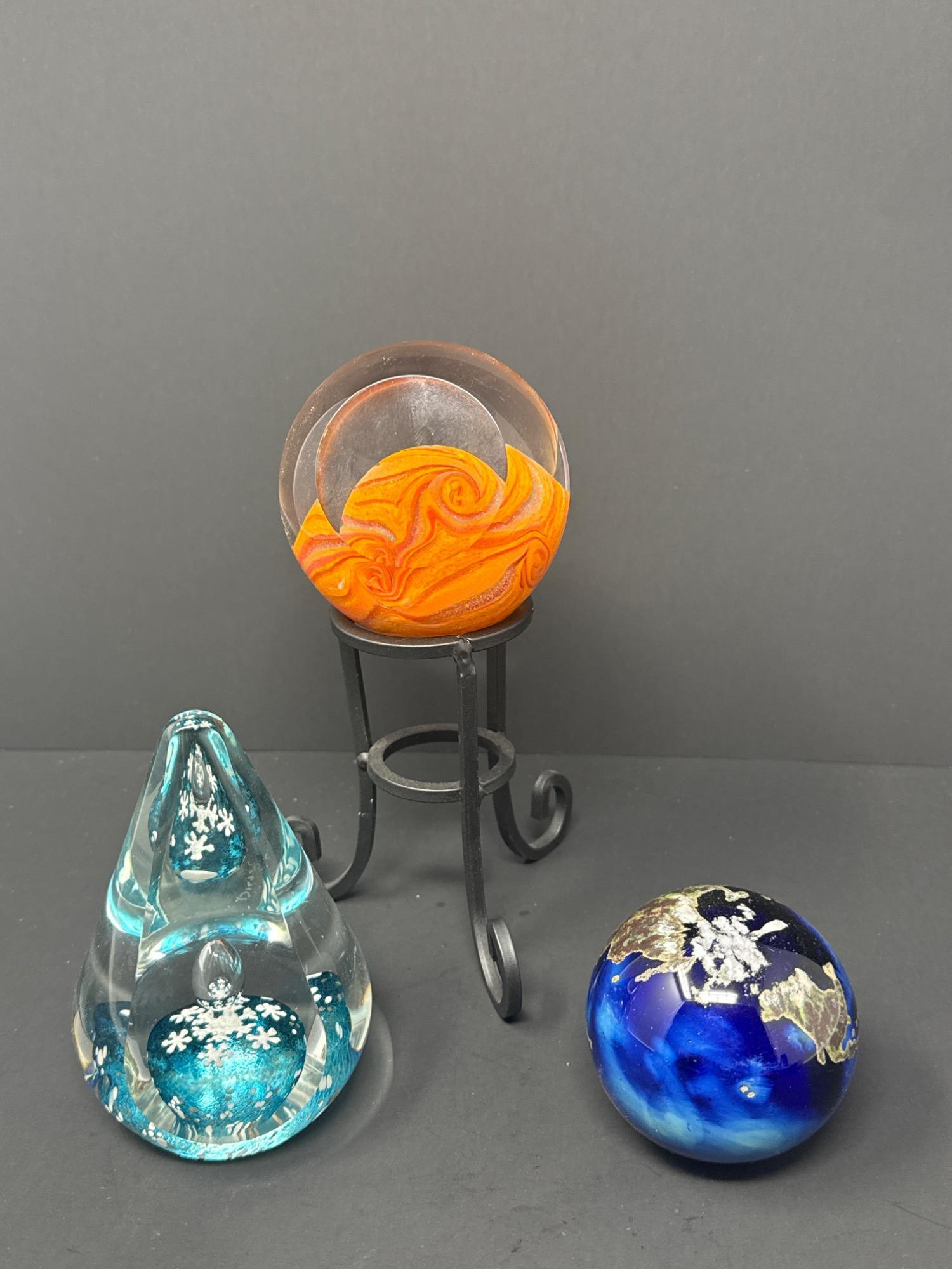 This beautiful trio of signed art glass paperweights includes vibrant and collectible pieces crafted with exceptional artistry: Teardrop Snowflake Paperweight (Four Seasons) Dimensions: 4.5 inches tall x 3 inches wide Design: Clear glass teardrop with internal snowflake and glittering blue core Markings: Signed on the base; from the Four Seasons collection Orange Swirl “Jupiter” Paperweight (GES05) Dimensions: Approx. 3 inches in diameter Design: Swirling orange with shimmering silver accents, inspired by the planet Jupiter Markings: Signed Jupiter GES 05 on the base Glowing Blue Earth Globe Paperweight (Lundberg Studios) Dimensions: Approx. 2.25 inches in diameter Design: Deep cobalt glass with gold-tone continents, resembling Earth Markings: Signed Lundberg Studios 062790 on the base