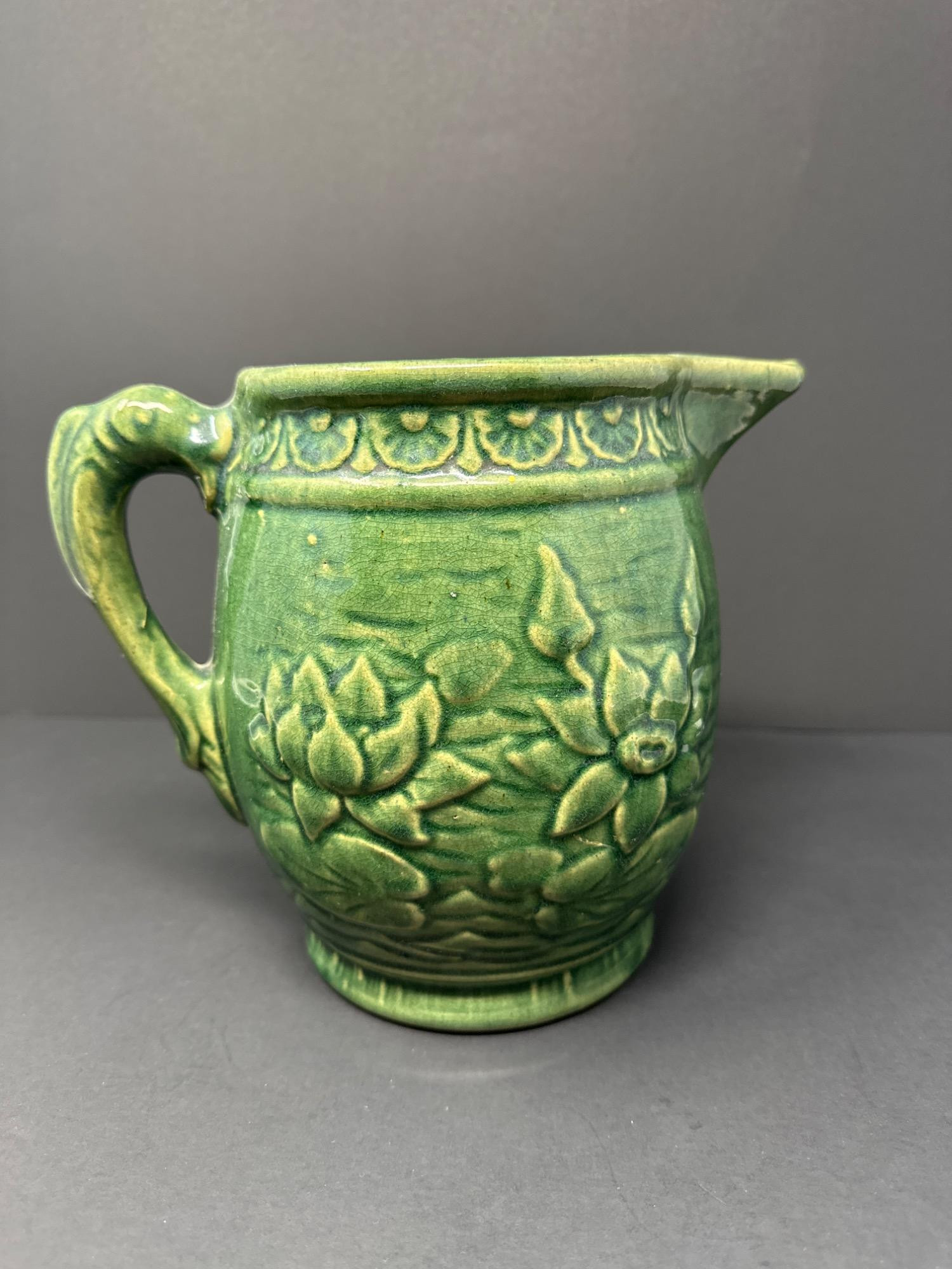 Vintage McCoy stoneware pitcher, produced circa 1935, featuring a classic green glaze with a raised lily pad floral motif and a stylized fish handle. This pitcher is a larger variation of the well-known McCoy “Lily Pad” line. Details: Manufacturer: McCoy Pottery Year: c.1935 Color: Glossy green glaze with rich tonal variation Design: Raised lily pad floral pattern with decorative rim border Handle: Sculpted with fish-tail or leaf-like styling Base Marking: Stamped “30” on the underside Material: Stoneware Dimensions: 7.5"H x 9"W