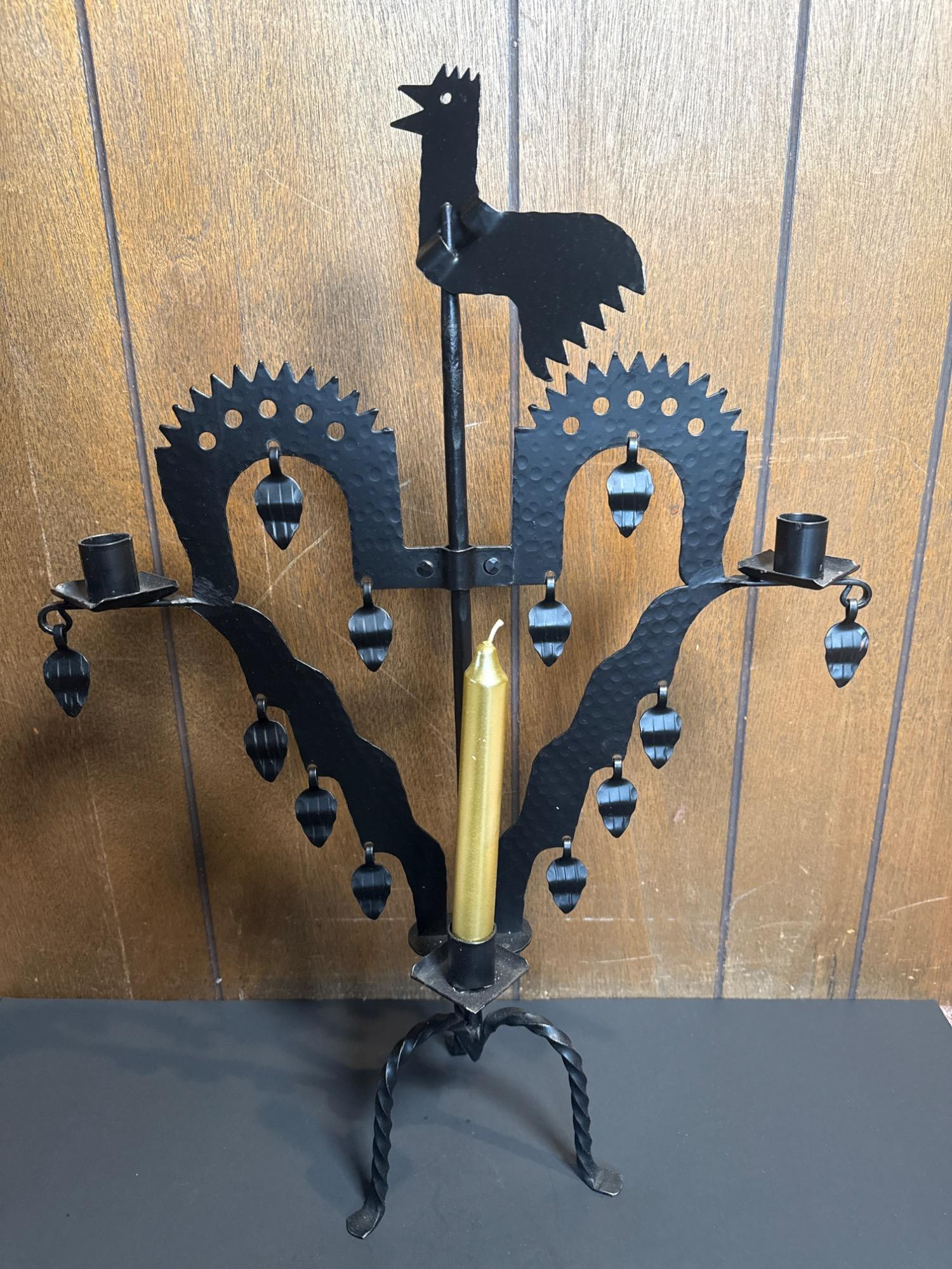 This striking candlestick stands an impressive 36 inches tall, designed to make a statement in any room, entryway, or outdoor setting. Crafted from hand-forged iron, the piece features a detailed rooster figure perched proudly atop a sturdy post, symbolizing vigilance and rural charm. Material: Solid wrought iron or forged steel, often finished with a distressed or blackened patina to enhance its vintage appeal. Design: The base is wide and stable, sometimes embellished with scrollwork or rustic textures. The rooster is sculpted with realistic feather detailing, comb and beak raised as if mid-crow. Function: The candlestick holder (or holders, if multi-arm) may be mounted at the top near the rooster or along the shaft, accommodating taper or pillar candles. Style: Perfect for farmhouse, country, or French provincial decor. It adds vertical interest and a touch of whimsy with an old-world feel.Forged Rooster Post Candlestick – 3 Feet Tall