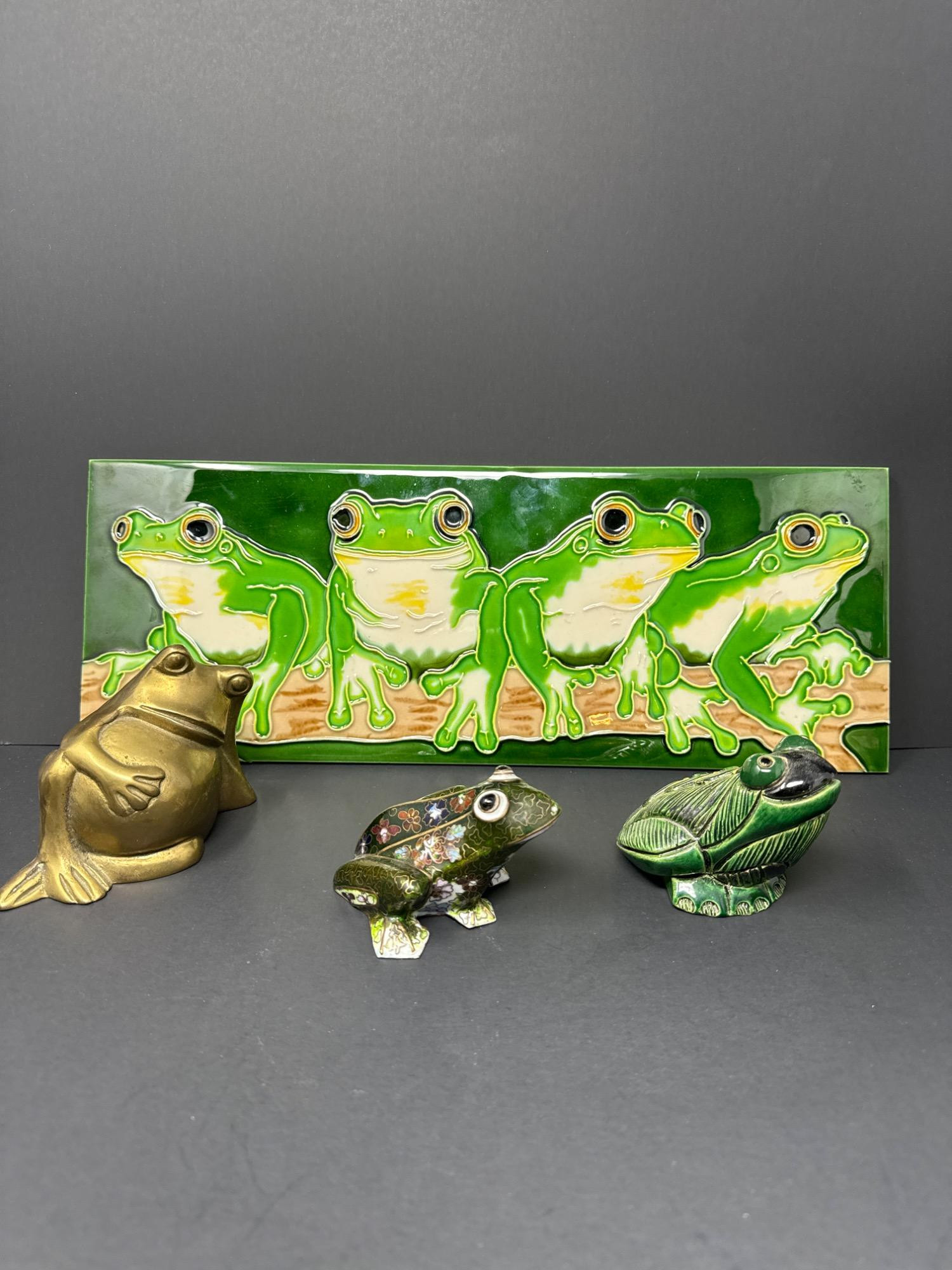 Hop into a whimsical world of collectibles with this charming frog-themed décor set! Featuring a bright EnVogue ceramic wall tile and three distinct frog figurines—each with unique materials and personality—this set brings playful character to any space. Set Includes: EnVogue Ceramic Frog Tile Wall Hanging (Made in Taiwan) Measures 6 inches tall by 16 inches wide Glossy ceramic tile with five vivid green frogs Felt backing with two hanging hooks Label shows EnVogue and size, no origin noted Brass Frog Figurine – Quality Sun (Made in Taiwan) Measures 3 inches tall by approx. 4 inches long Solid brass with a charming, rotund shape Sticker reads: “Quality Sun Products – Made in Taiwan” Cloisonné Enamel Frog Figurine Measures 4 inches wide by 2.5 inches tall Intricate floral and geometric patterns on a green base Blue enameled underside with exposed metal foot accents Handcrafted Pottery Frog Figurine Measures 2.5 inches tall by 4 inches wide Green/black glaze with a chevron pattern on the back Base marked with numbered “129”