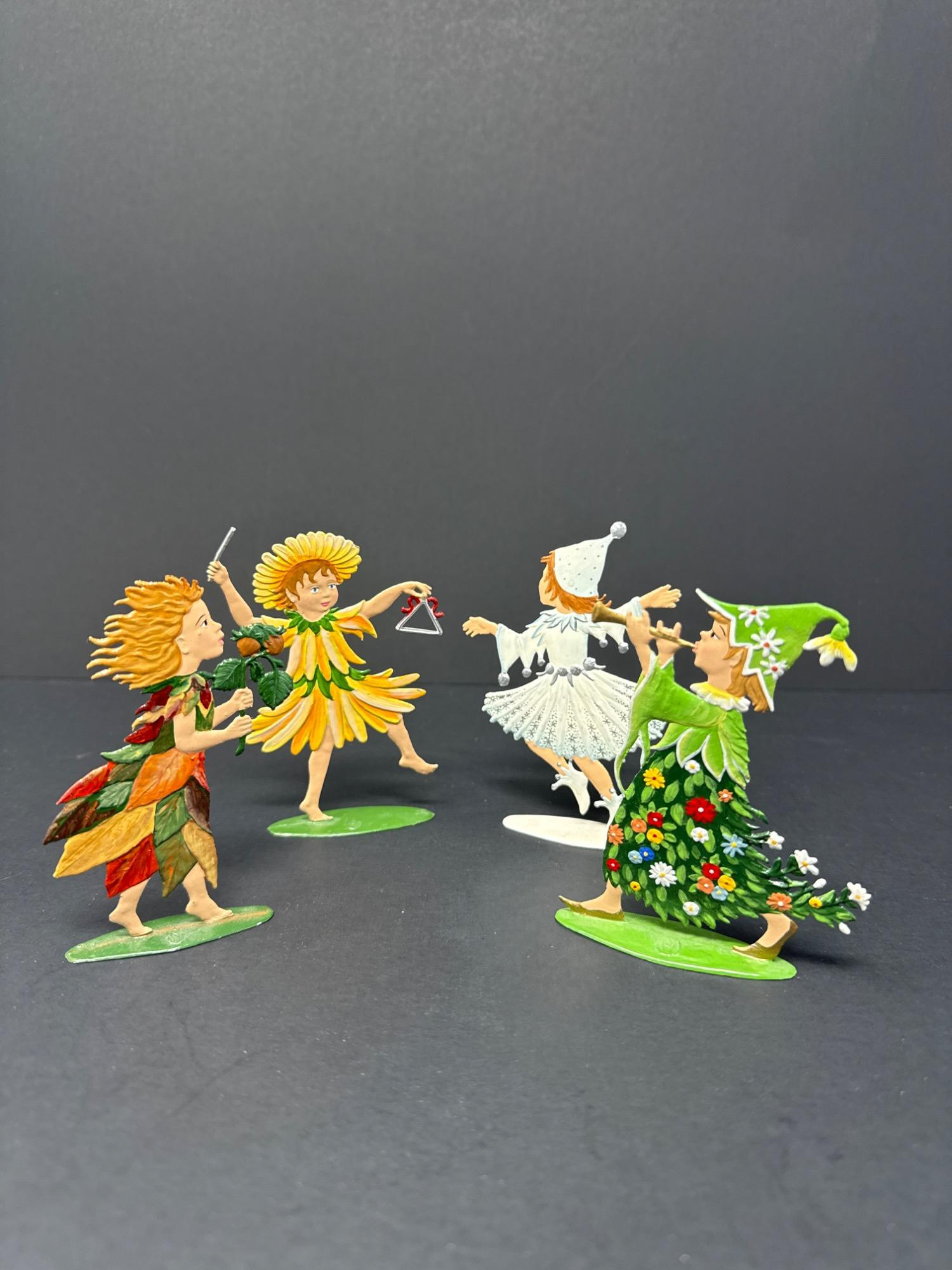 Add charm and elegance to your collection with this delightful set of Wilhelm Schweizer hand-painted pewter miniatures. This whimsical group features four seasonal fairy figures, each exquisitely detailed and hand-painted in vibrant colors. Details: Brand: Wilhelm Schweizer (authentic red seal stamp visible on the base) Material: Hand-cast pewter Hand-painted in Germany Theme: Seasonal Fairies / Flower Elves Quantity: 4 individual figurines Approximate Size: 4" x 3" Figures include: Autumn fairy in earthy tones Spring/Summer fairy dressed in a sunflower petal skirt with a triangle Winter fairy in a frosty white outfit with a pom-pom hat Green fairy adorned with flowers, playing a horn