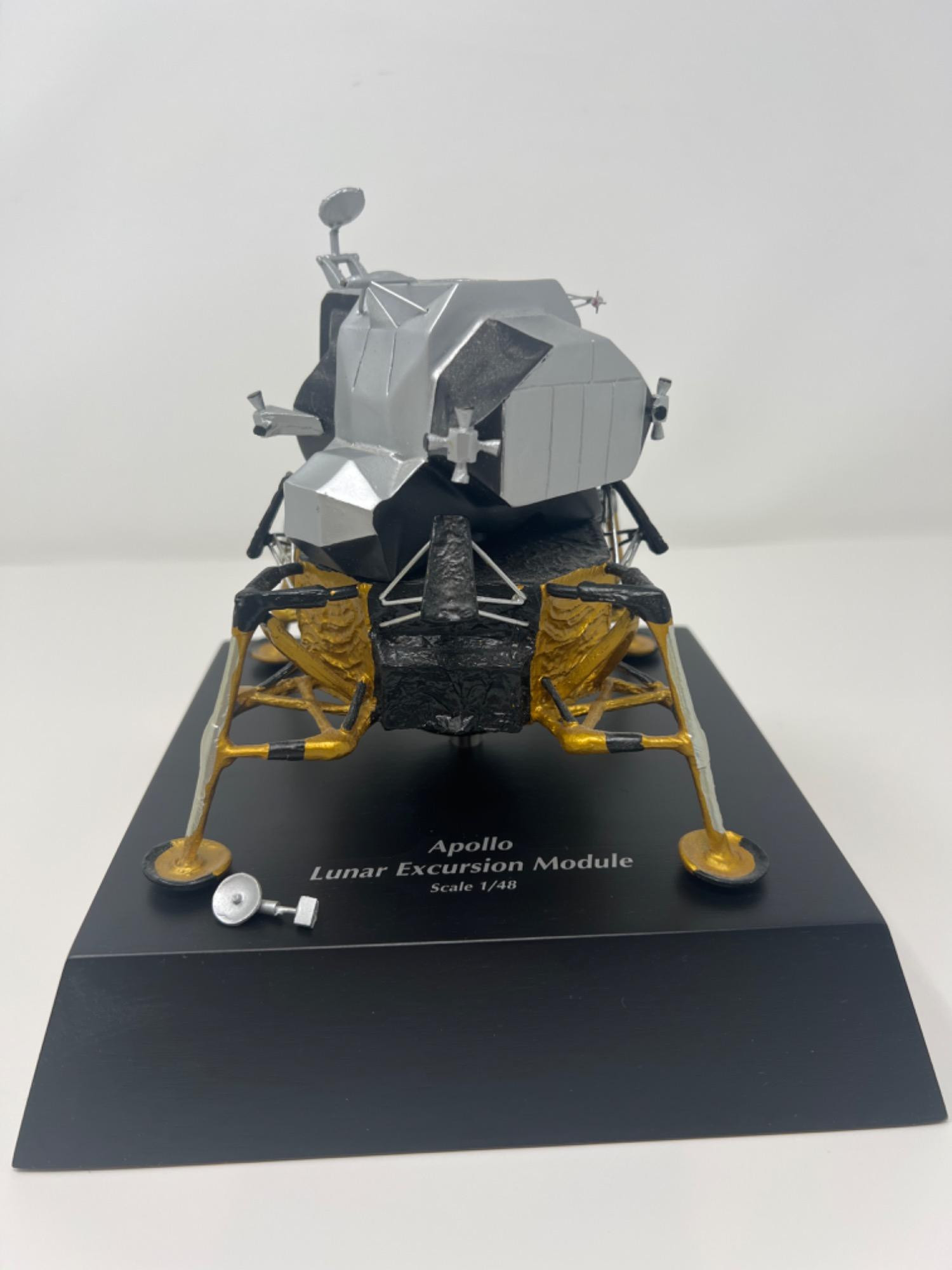 Own a piece of space history with this precision-crafted Apollo Lunar Excursion Module model, scaled at 1/48 and meticulously hand-painted by Executive Series for collectors and space enthusiasts alike. Model Details: Model Size: Approximately 5 1/2 inches tall by 4 1/2 inches wide Base Dimensions: 8 x 8 inches with a 2-inch height Scale: 1/48 Material: Handcrafted and hand-painted composite Manufacturer: Executive Series by Daron Item No.: E3848 Made in the Philippines Special Features: Highly detailed representation of the historic Apollo Lunar Module Beautifully finished in silver, gold, and black tones Displayed on a sleek black stand with etched labeling Comes in original custom foam packaging for safe storage and shipping