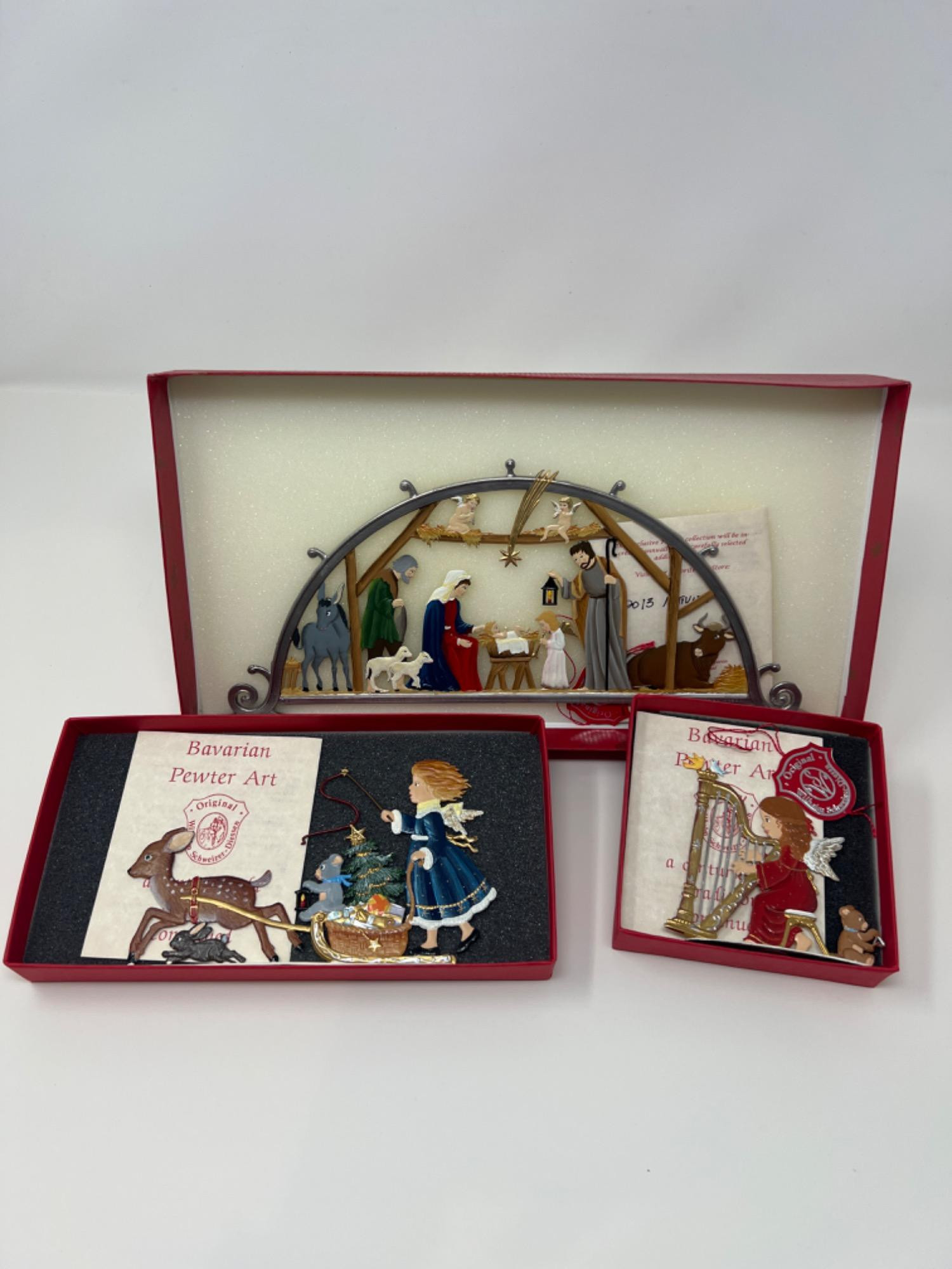 This exquisite 3-piece collectible set by Wilhelm Schweizer showcases the timeless charm and craftsmanship of traditional hand-painted Bavarian pewter art. Each piece is cast from solid pewter and painted by hand on both sides — a signature of Schweizer’s artistry, made in Diessen, Germany. Set Includes: Wilhelm Schweizer "Nativity Arch" Wilhelm Schweizer Angel with Sled & Deer Wilhelm Schweizer Angel Harpist