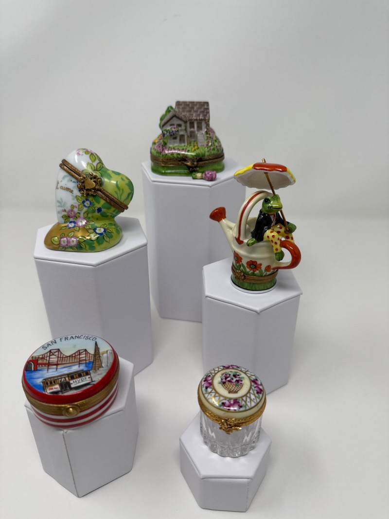 A 5-piece collection of hand-painted Limoges France Peint Main porcelain trinket boxes, each featuring unique designs and fine detailing. All boxes are marked on the underside and include functioning brass clasps and hinges. Included in this set: Frog in Watering Can – A whimsical frog figure holding an umbrella sits inside a teapot-style watering can. Interior features a painted green leaf. Garden Cottage Box – A house and garden scene with a removable miniature turnip. Interior painted with a floral motif. Heart-Shaped Floral Box – Decorated with blue and pink flowers, opens to a golden heart and the message “Je t’aime.” San Francisco Cable Car – Round red and white striped box with painted San Francisco scene. Includes a porcelain heart insert with the message “I left my heart ♥.” Crystal & Porcelain Floral Round Box – Clear faceted crystal base with a hand-painted porcelain lid featuring pink flowers and gold detailing. Size: Each piece measures between 2 to 3 inches