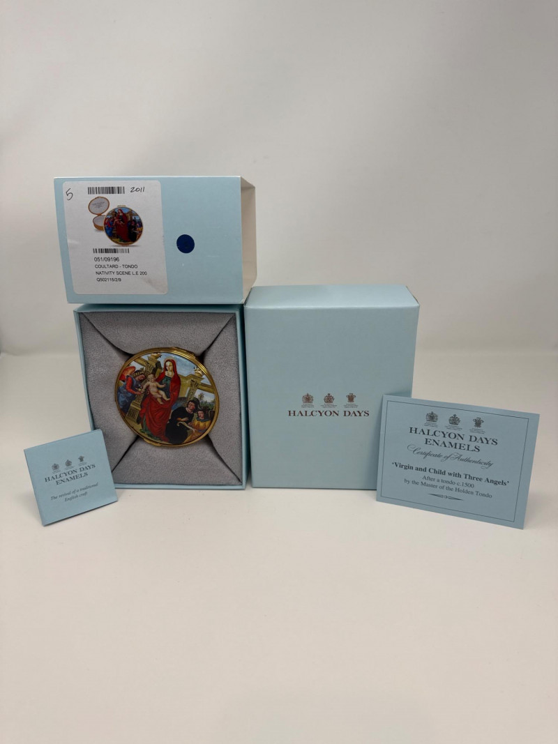 This Halcyon Days Enamels trinket box features a detailed enamel painting titled "Virgin and Child with Three Angels," inspired by a c.1500 tondo by the Master of the Holden Tondo. The artwork is beautifully recreated on a round enamel lid, surrounded by an elegant gold-tone trim. This collectible piece comes from a limited edition of only 200 and is individually numbered—this one being number 5. It was created in collaboration with The Samuel Courtauld Trust, London, and includes a certificate of authenticity. Features: Diameter: 3 inches Height: 1 inch Year: 2011 Edition: No. 5 of 200 Includes original box and certificate of authenticity Interior lid inscription referencing the artwork and gallery collection
