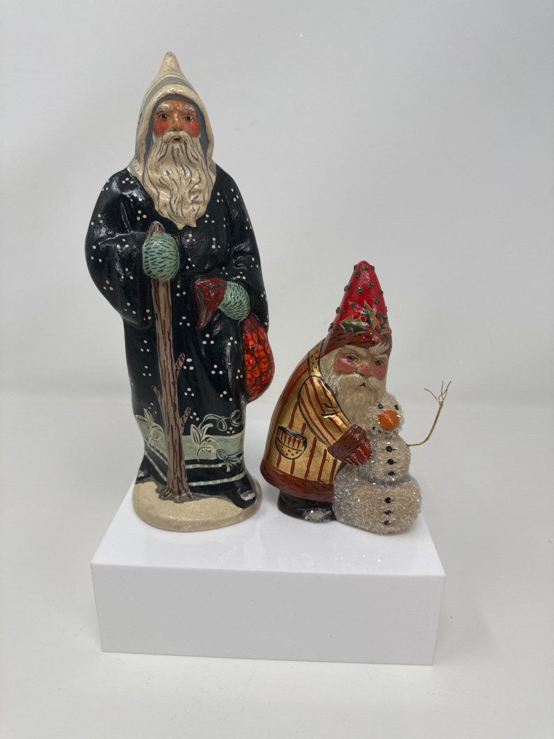 A delightful set of two hand-painted Santa figurines by Vaillancourt Folk Art, known for their collectible chalkware pieces made in Sutton, Massachusetts. Each figure is intricately detailed and individually signed on the base. Set Includes: Tall Santa (2011 – #209): Height: 8 inches tall Outfit: Black coat with green mittens and cream hood Accessories: Wooden staff and red sack Markings: Signed on base, marked 2011, copyright 2007 Santa with Snowman (2014 – #269): Height: 5 inches tall Outfit: Red and gold striped coat with red hat adorned with holly Accessories: Holding a glittery snowman with twig arms Markings: Signed on base, marked 2014, copyright 2016 Features: Made of chalkware Hand-painted in the USA Individually numbered and dated