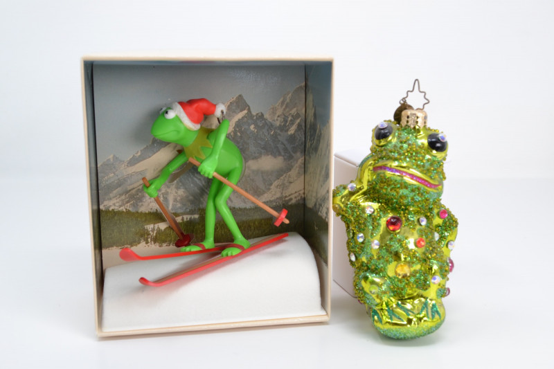 A charming Frog Ornament Collection featuring two unique holiday pieces: The 1982 Hallmark Kermit the Frog Keepsake Ornament, designed by artist Donna Lee, showcases Kermit skiing in a festive Santa hat. It comes in its original Hallmark display box with scenic background. The Christopher Radko “Froggy Sparkle” Christmas Ornament is a vibrant hand-blown glass frog adorned with colorful glitter and jewel accents, topped with a signature Radko star crown. Kermit Ornament: 3 3/16" H Radko Ornament: 4 1/2" H