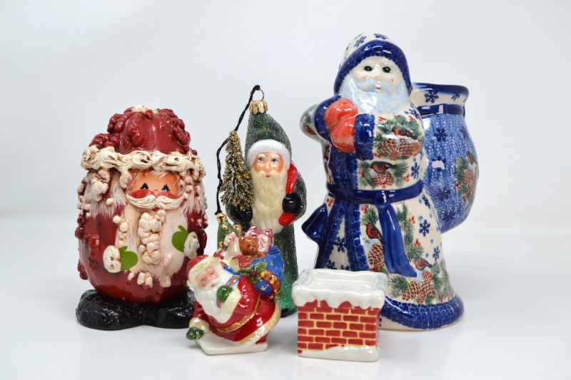 This festive Santa Collection includes a charming mix of handcrafted and collectible pieces: "Santa in Chimney" Salt & Pepper Shaker Set – A playful ceramic duo featuring Santa with a toy sack and a snow-topped brick chimney. Ino Schaller 2010 Green Santa – Made in Germany, this glittered Belsnickel-style Santa ornament is finished with a red sack and bottle brush tree. E. Barrett Gourd Santa – A folk-art style figure with sculpted textures and painted accents, crafted from a gourd form. Kalich Polish Santa in Blue Robe – Hand-painted ceramic Santa by Kalich (Unikat pattern by Anna K.), decorated with pinecones, birds, and snowflakes. Marked and signed on base, made in Poland. Size range: Approx. 1 3/4" to 9" tall