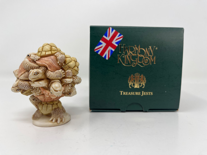 An intricately sculpted collectible by Harmony Kingdom, titled “Weight of the World”, designed by Master Carver Peter Calvesbert. This whimsical piece features a detailed stack of turtles, each uniquely carved with lifelike textures and expressions. Despite its compact size, the craftsmanship is exceptional and full of character. Details: Artist: Peter Calvesbert Brand: Harmony Kingdom Title: Weight of the World Year: 2007 Origin: Made in England Size: Approx. 3" tall × 2 1/2" wide Material: Cold cast resin Markings: Artist’s signature on base; original label intact Includes: Original ID card