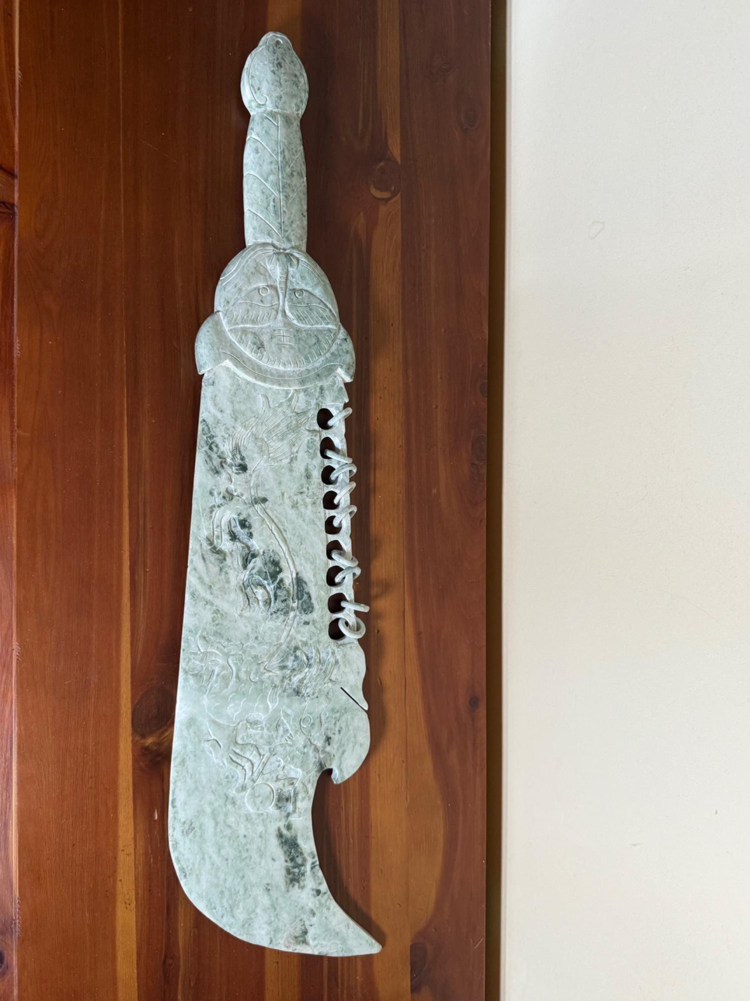 Beautifully carved Chinese jade dragon sword crafted from jadeite or jade-like stone with soft green-white marbling. Features a detailed dragon in relief, representing strength and protection in Chinese culture. The pierced spine adds visual depth, while the hilt displays a mythical guardian face and stylized leaf pommel, enhancing its ceremonial style. Details: Material: Chinese jade or jade-like stone Dimensions: 31.5” long x 8” wide Style: Chinese ceremonial/ornamental sword