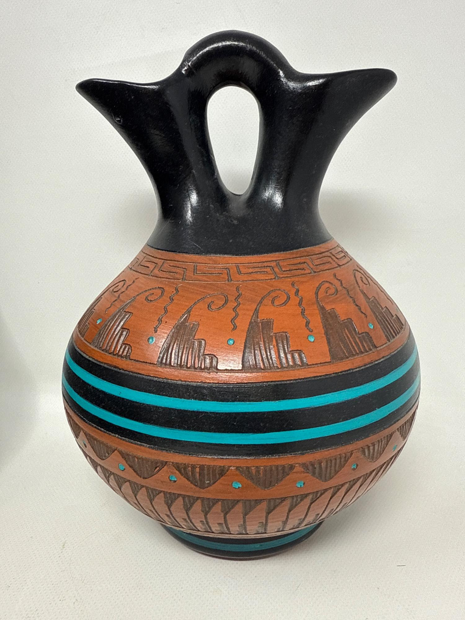 This stunning Navajo Marriage Pot is a testament to tradition and artistry, handcrafted by Dee Nelson of the Tangle clan of the Navajo tribe. Dee, a seasoned potter who has honed her skills alongside her sisters, brings decades of experience and cultural heritage into every piece she creates. This double-spouted vessel—an iconic symbol of Navajo wedding ceremonies—features rich terracotta tones, deeply carved geometric and symbolic motifs, and striking turquoise and black accent bands. The design signifies the union of two individuals, with the joined center representing their shared journey. Highlights: Artist: Dee Nelson (Signed base) Tribe: Navajo (Tangle Clan) Style: Traditional Marriage Pot Size: 11" Tall × 7.5" Wide Features: Hand-etched detailing, turquoise inlay, black-on-red contrast, symbolic patterns