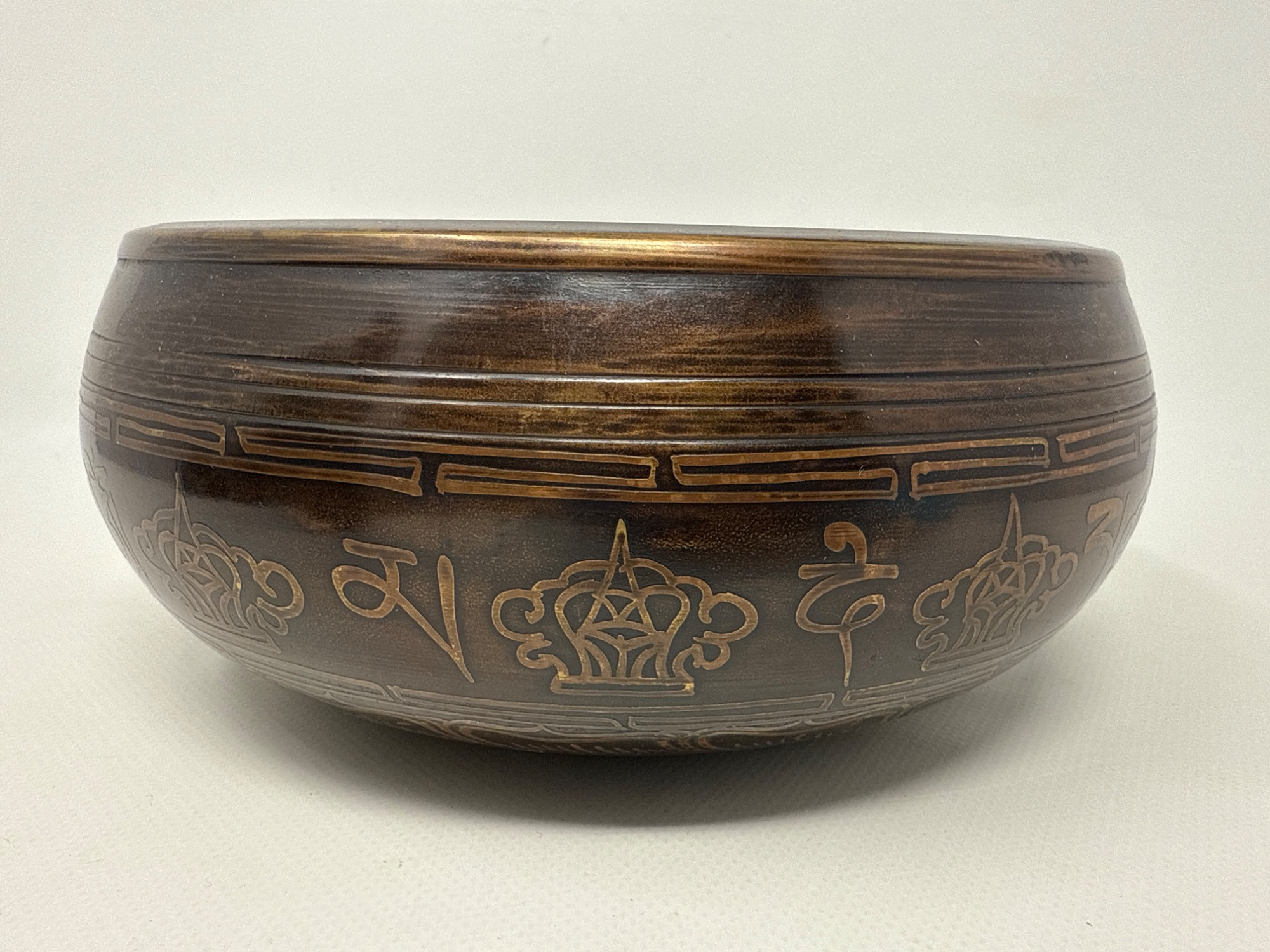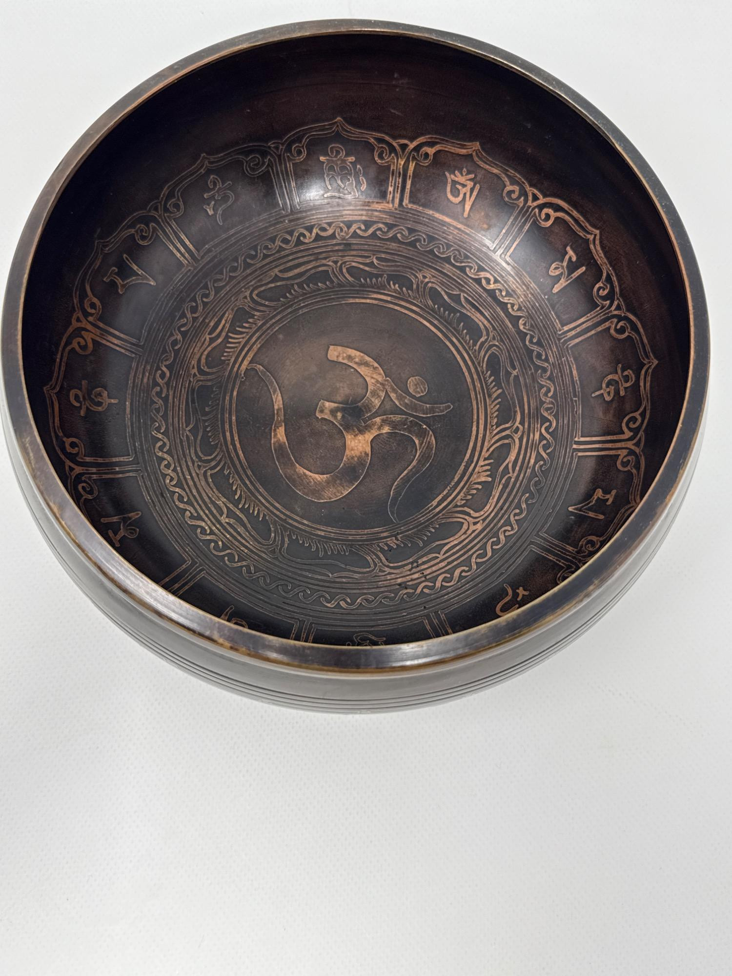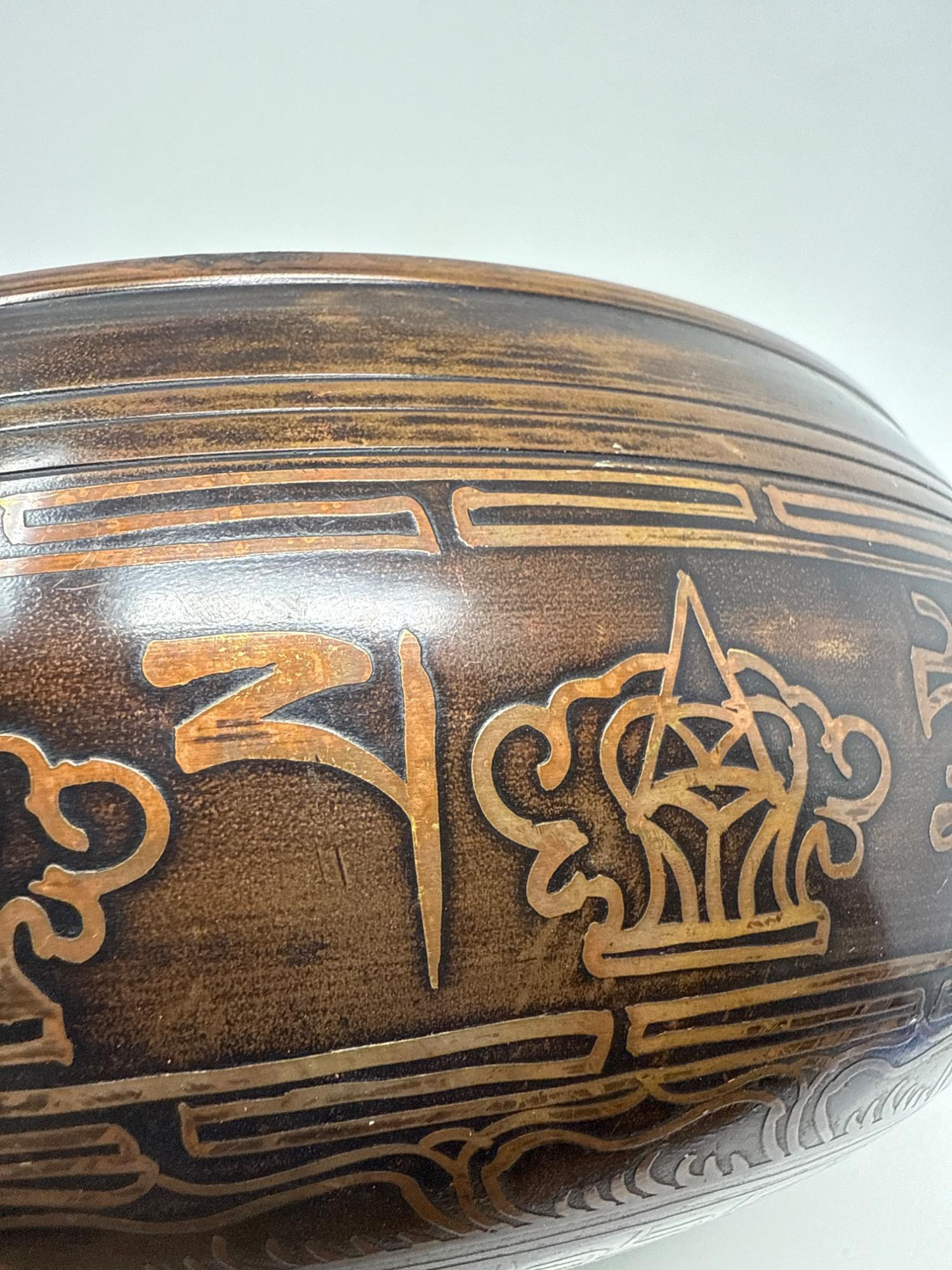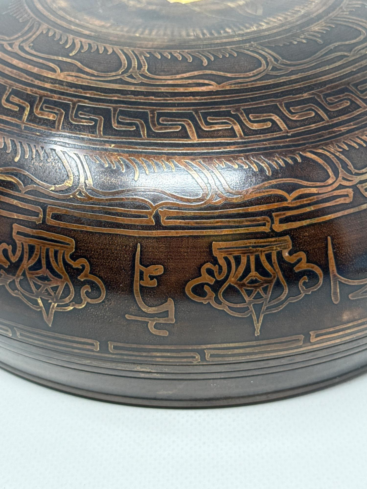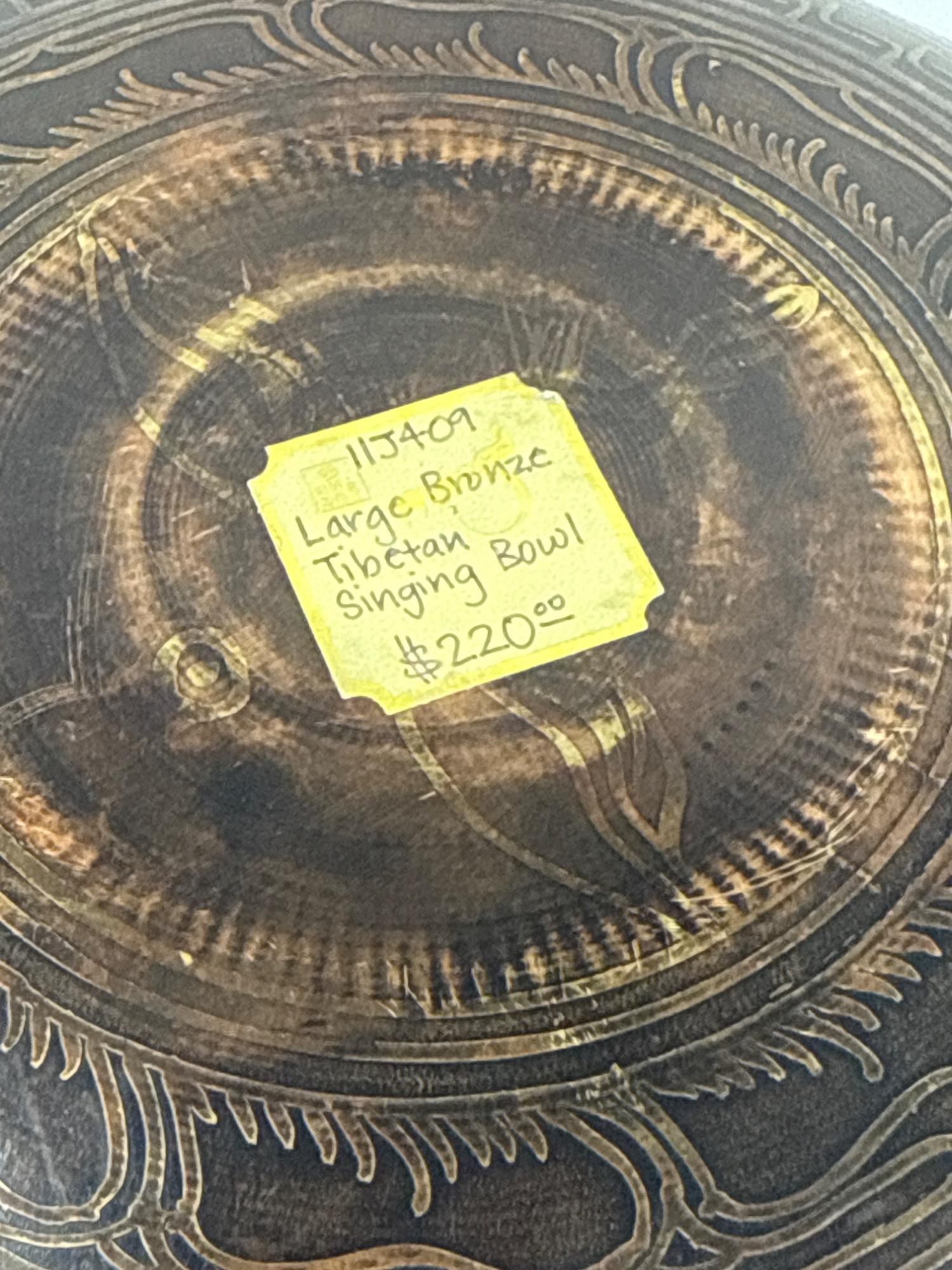 This beautifully hand-etched Tibetan Singing Bowl is a stunning piece of craftsmanship, ideal for meditation, sound healing, or as a decorative centerpiece. Made from bronze, the bowl features intricate designs and symbols, including traditional mantras and sacred motifs. Dimensions: 9 inches wide and 4.75 inches tall Material: Bronze Includes: Original wooden mallet Retail Price: $220 (as labeled on the base)