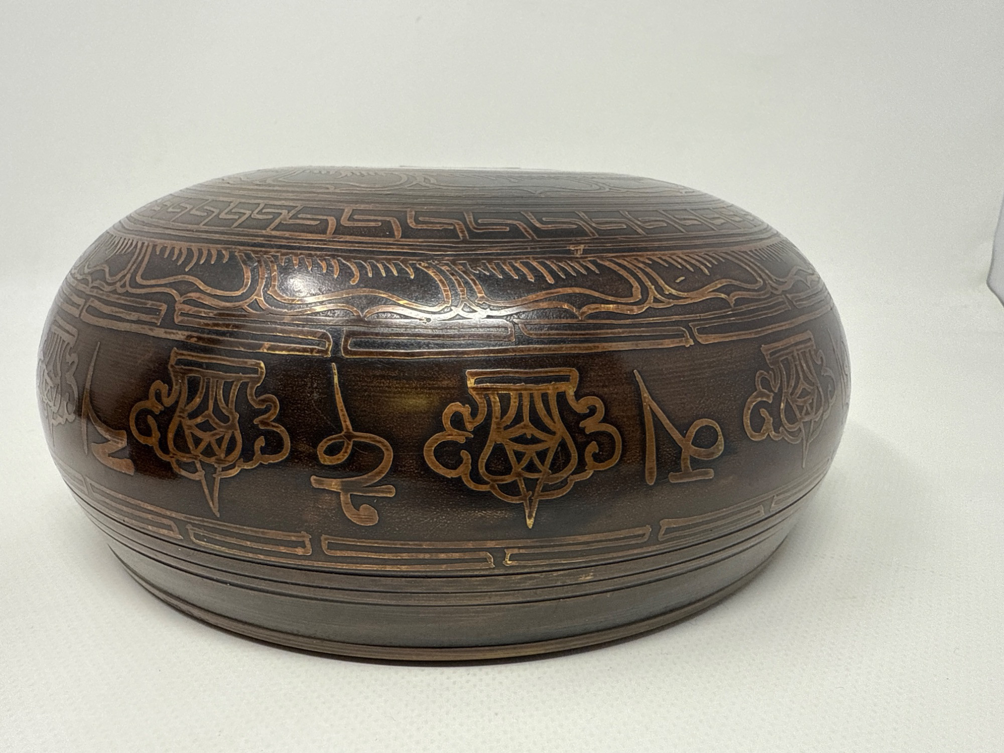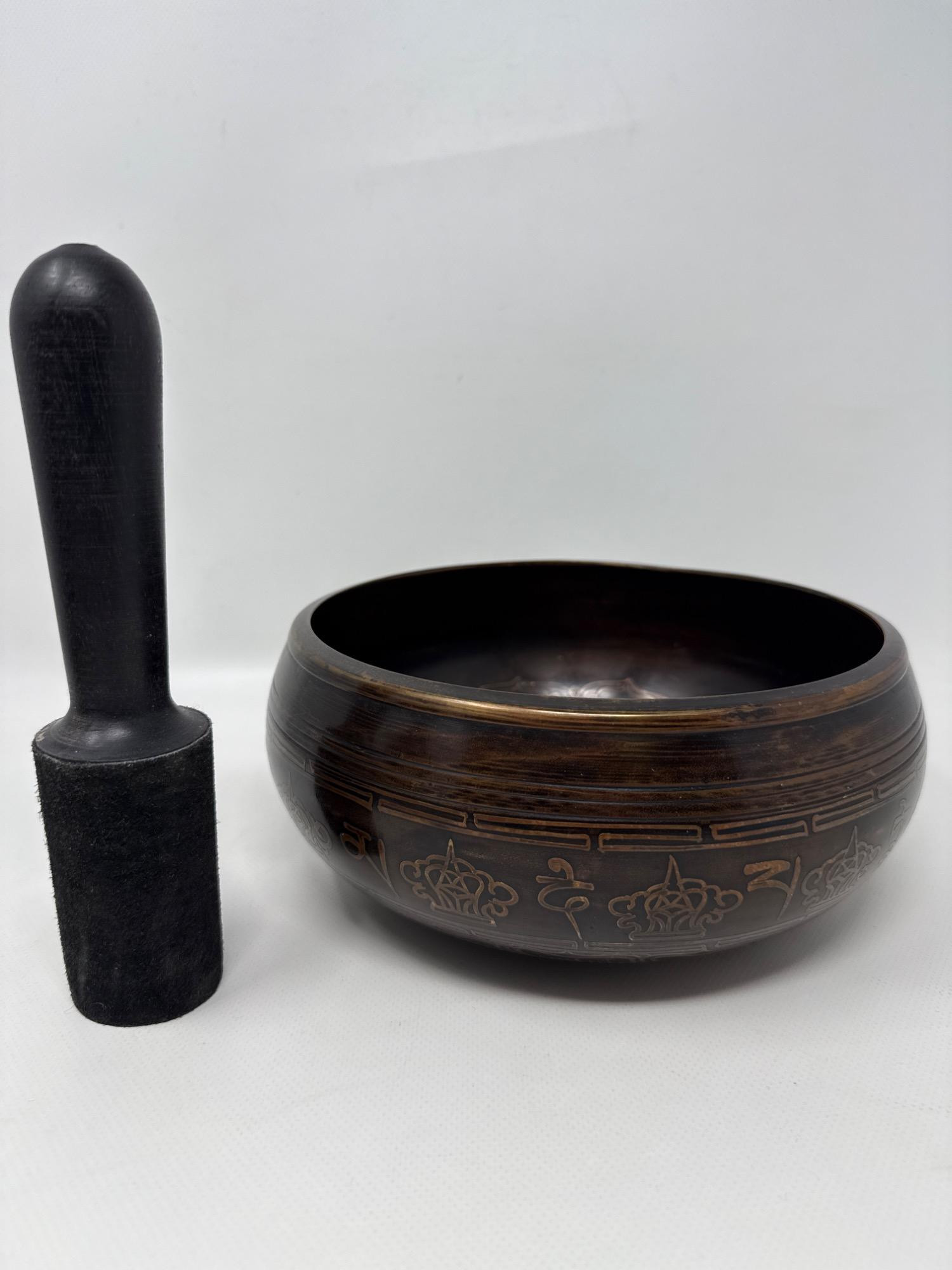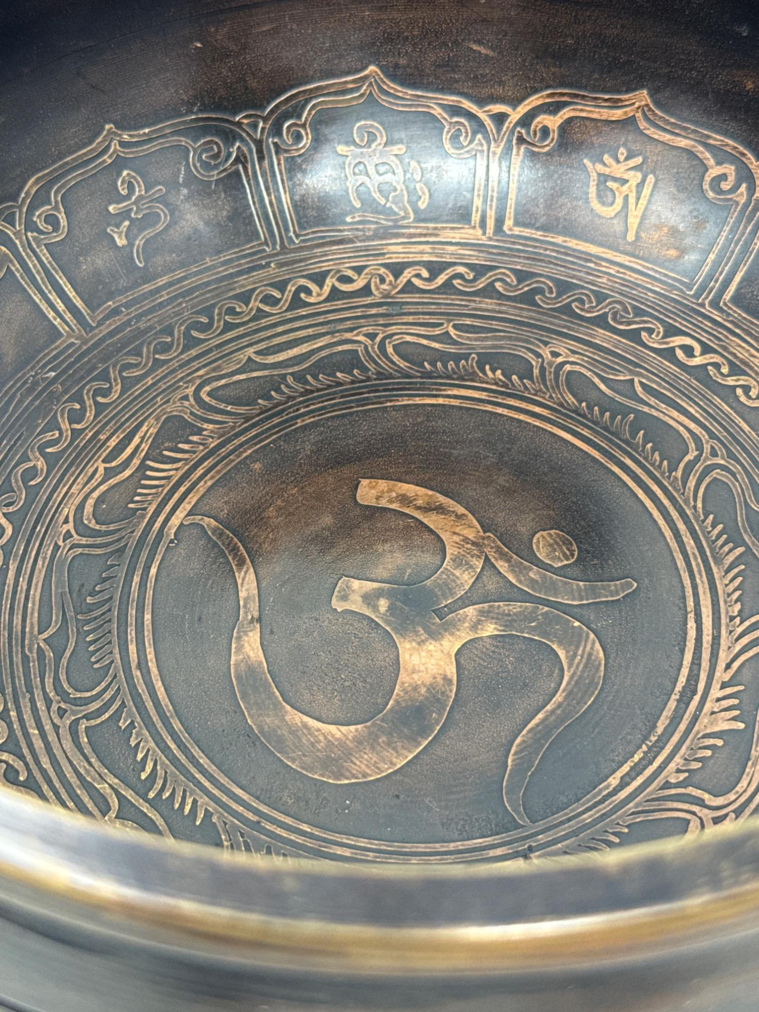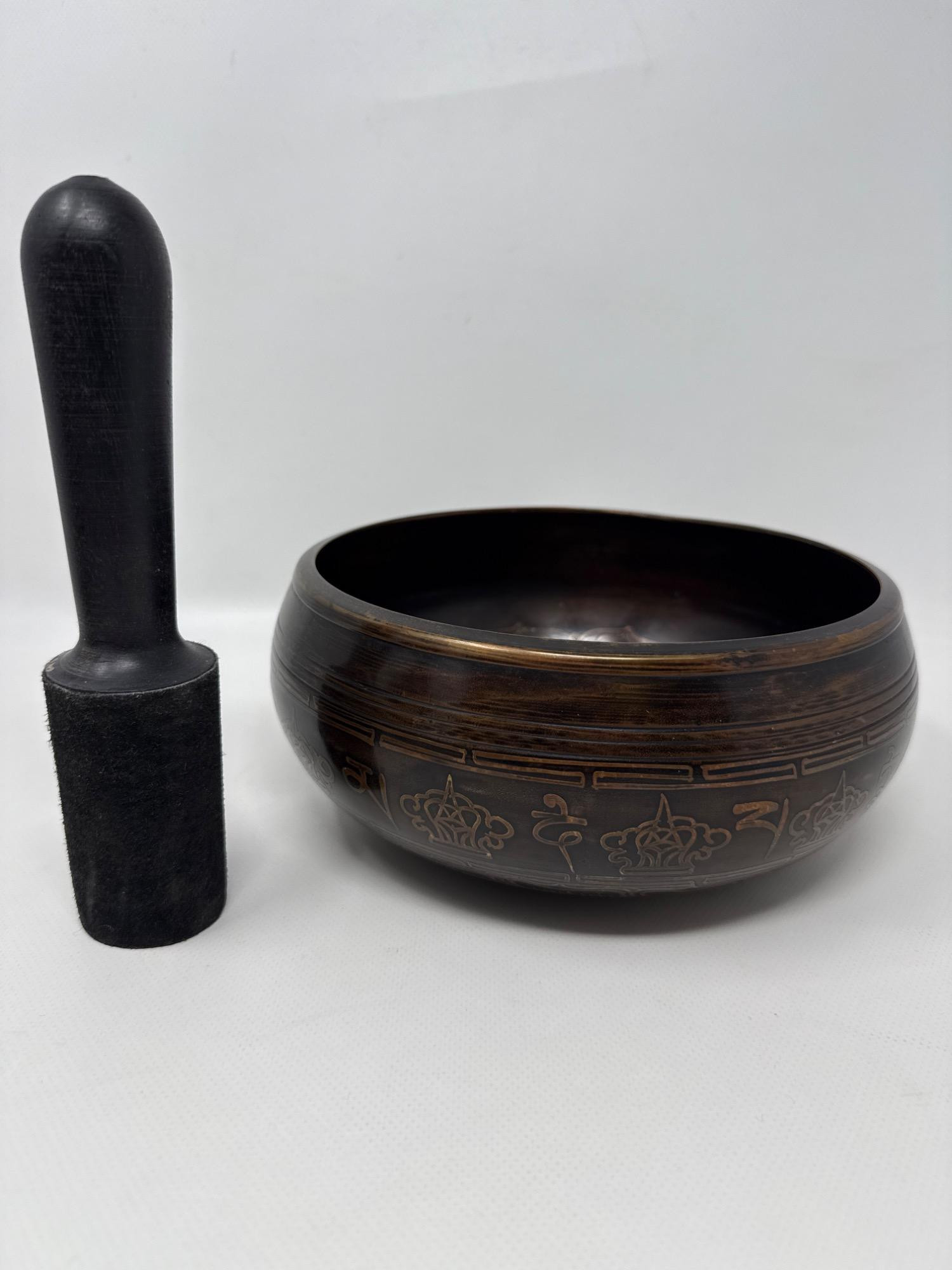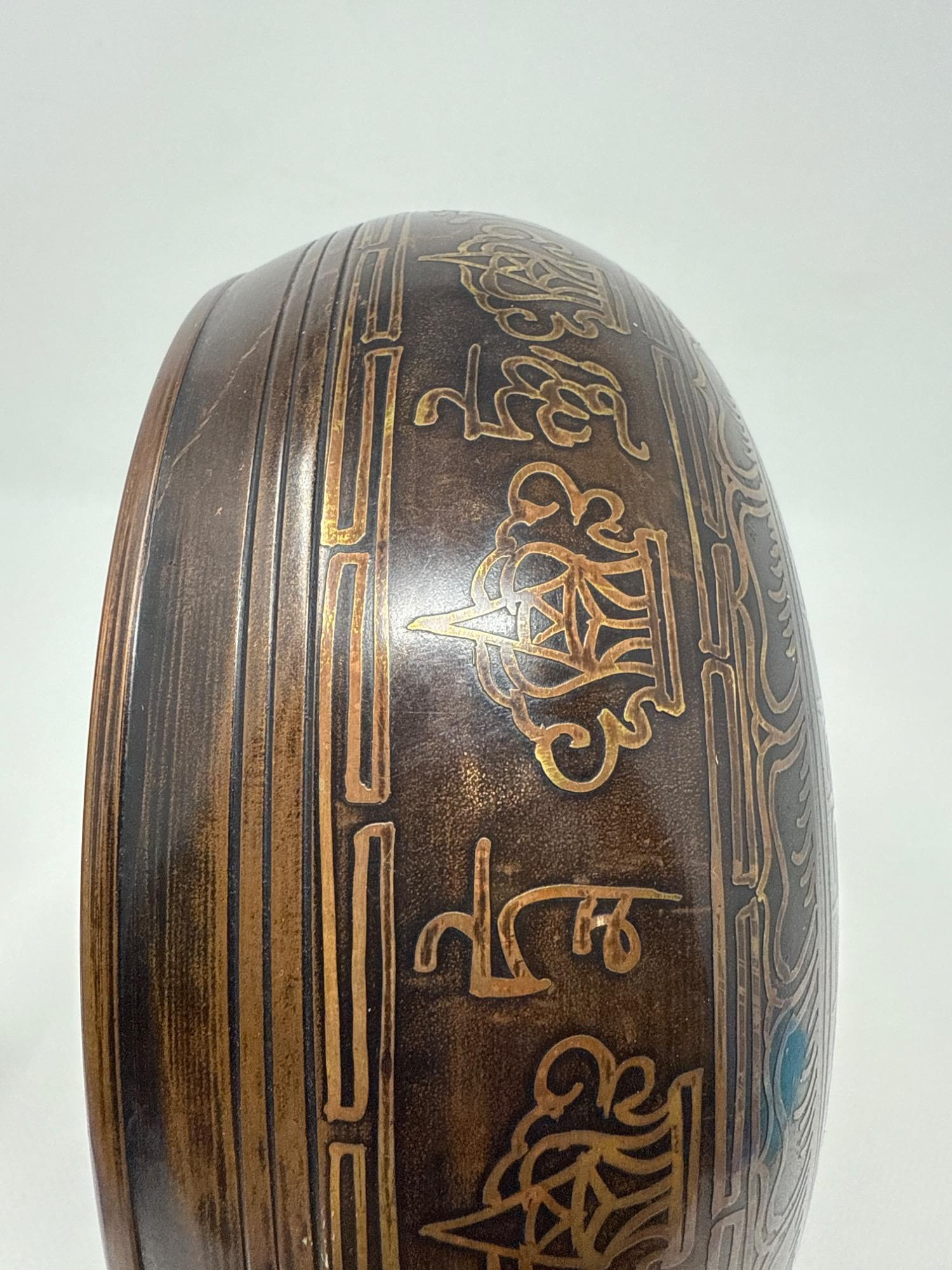 This beautifully hand-etched Tibetan Singing Bowl is a stunning piece of craftsmanship, ideal for meditation, sound healing, or as a decorative centerpiece. Made from bronze, the bowl features intricate designs and symbols, including traditional mantras and sacred motifs. Dimensions: 9 inches wide and 4.75 inches tall Material: Bronze Includes: Original wooden mallet Retail Price: $220 (as labeled on the base)