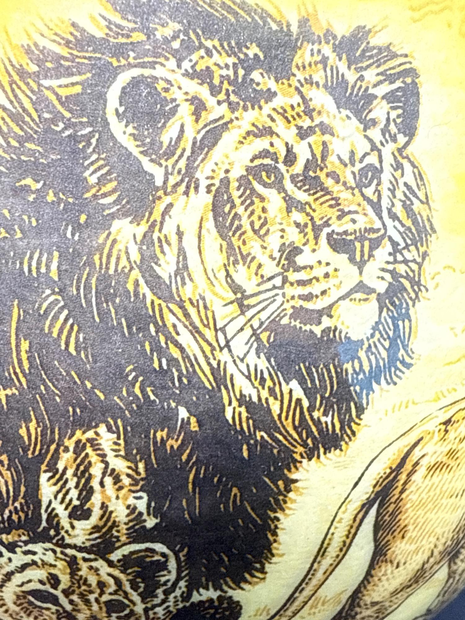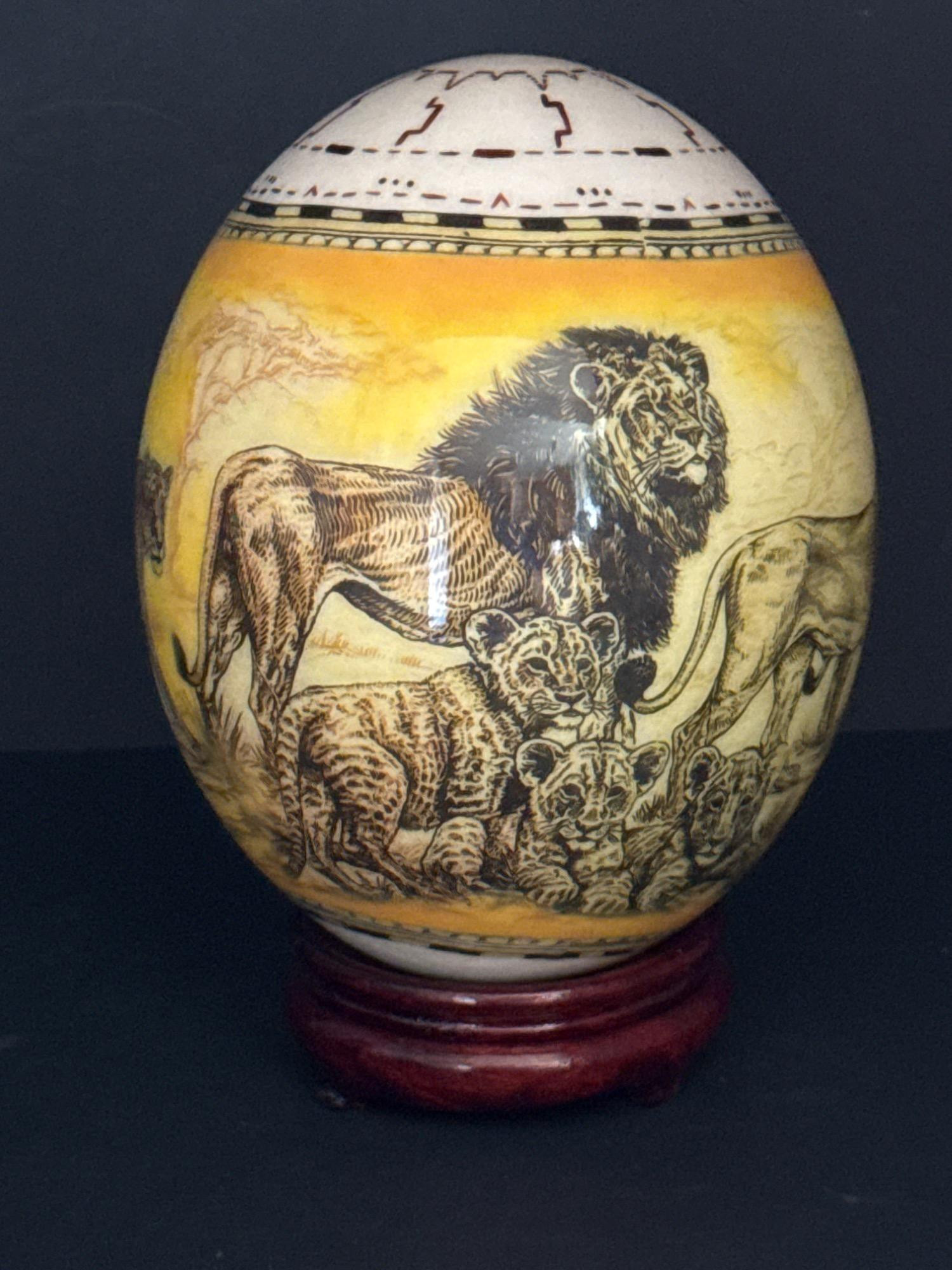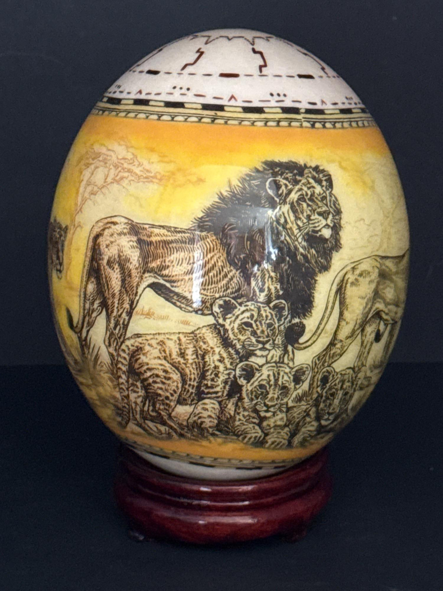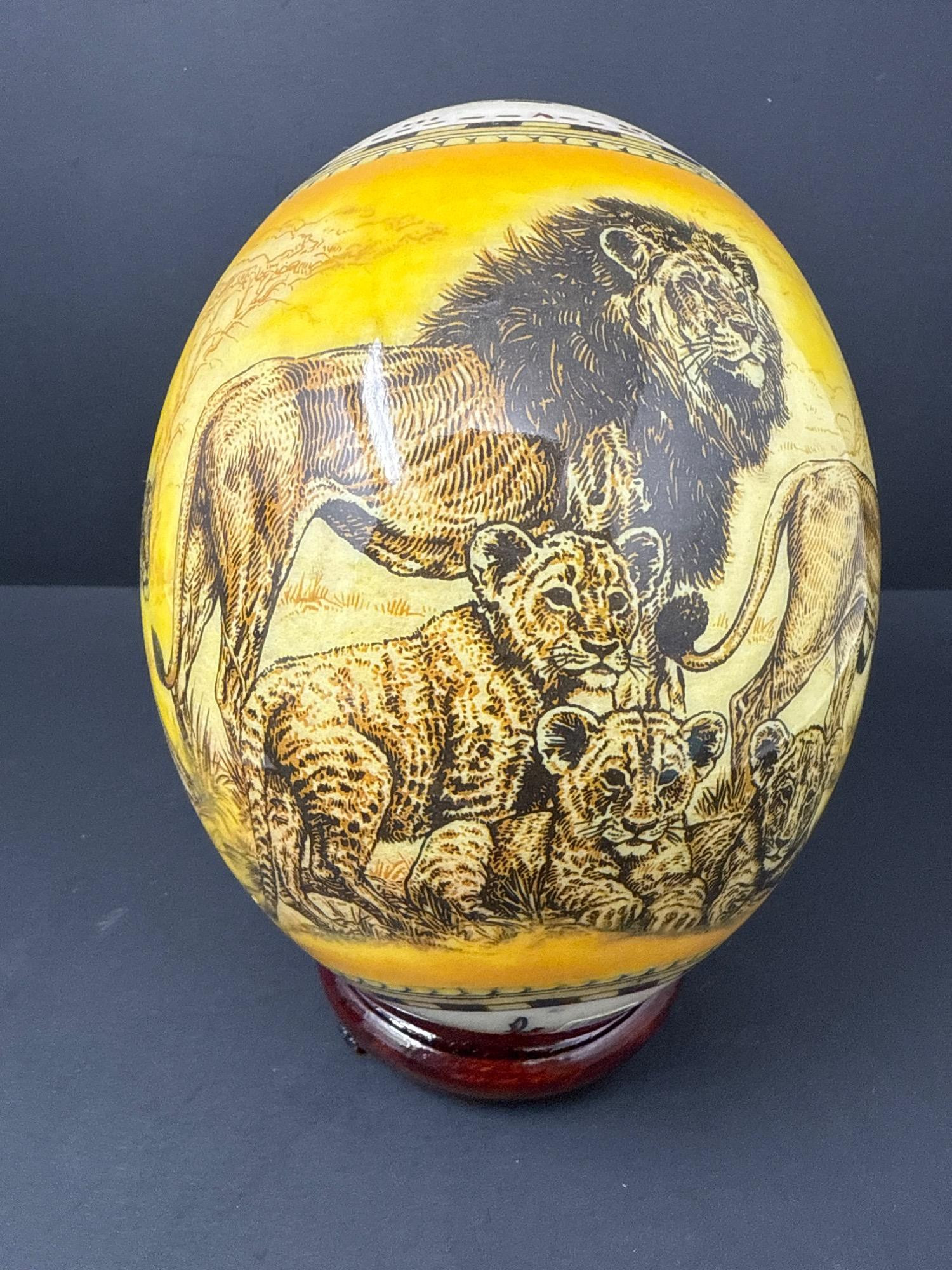 Bring the wild beauty of the African savanna into your space with this striking hand-decorated ostrich egg, showcasing a breathtaking safari scene. Beautifully illustrated with a regal lion, lionesses, and playful cubs, the egg captures the majesty of wildlife in remarkable detail. The rich yellow and earthy tones create a warm backdrop for the finely etched animals, while tribal-style accents adorn the top edge of the egg. This authentic ostrich egg comes with a glossy, deep-red wooden stand, making it a perfect centerpiece or conversation piece. The bottom bears the original Haus Design sticker and is hand-signed by the artist, confirming its authenticity and craftsmanship. Item Details: Title: African Safari Decorated Ostrich Egg & Stand Medium: Real ostrich egg Artwork: Detailed wildlife illustration featuring lions Artist: Signed (see photos) Origin: Haus Design Includes: Custom-fitted wooden display stand Dimensions: Approx. 10" tall (with stand), 5" wide