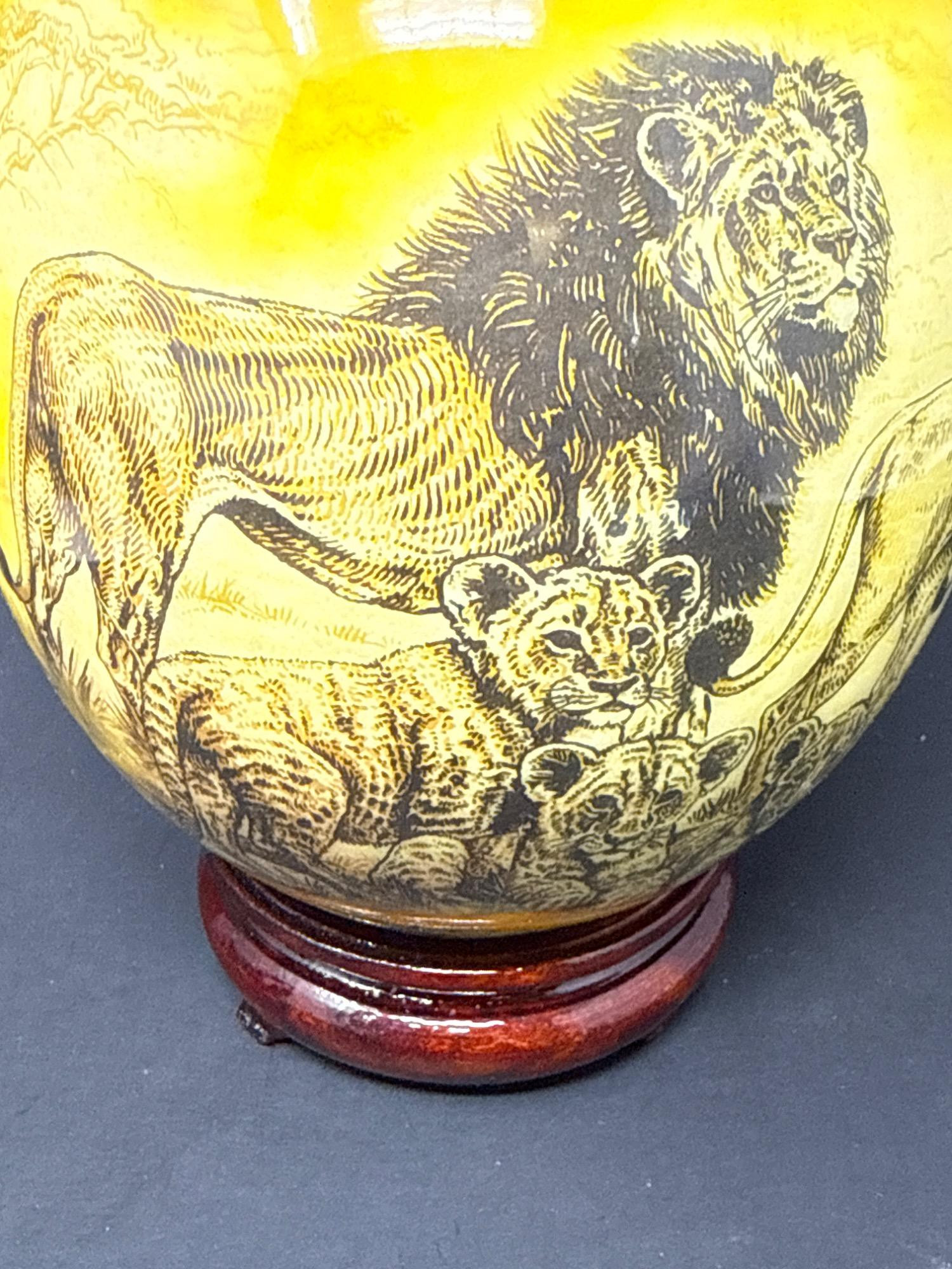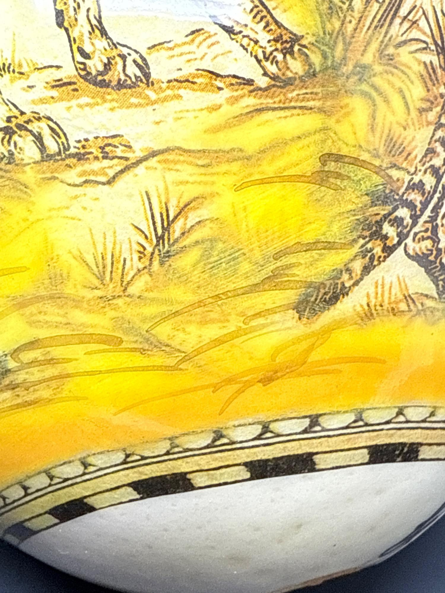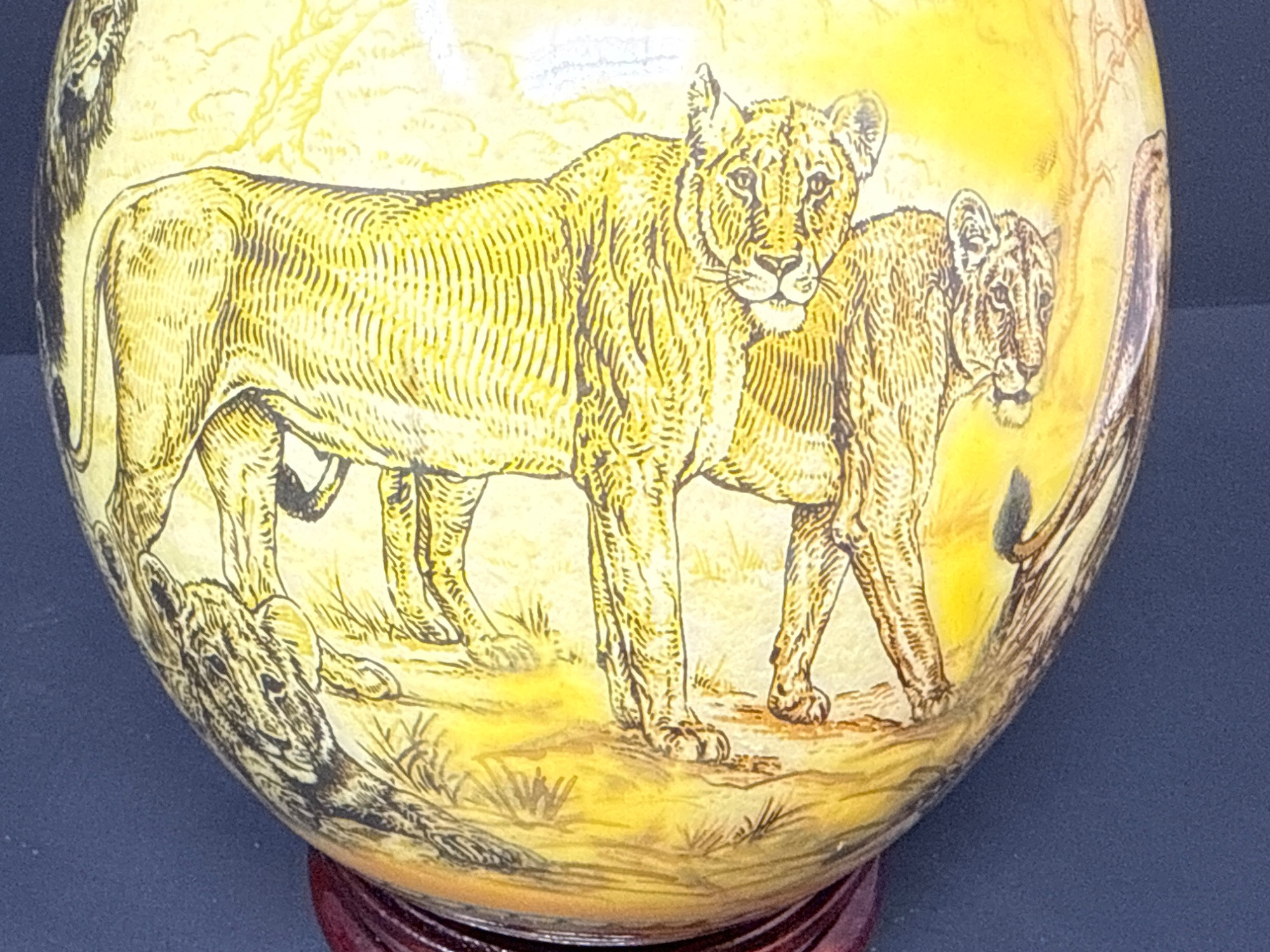 Bring the wild beauty of the African savanna into your space with this striking hand-decorated ostrich egg, showcasing a breathtaking safari scene. Beautifully illustrated with a regal lion, lionesses, and playful cubs, the egg captures the majesty of wildlife in remarkable detail. The rich yellow and earthy tones create a warm backdrop for the finely etched animals, while tribal-style accents adorn the top edge of the egg. This authentic ostrich egg comes with a glossy, deep-red wooden stand, making it a perfect centerpiece or conversation piece. The bottom bears the original Haus Design sticker and is hand-signed by the artist, confirming its authenticity and craftsmanship. Item Details: Title: African Safari Decorated Ostrich Egg & Stand Medium: Real ostrich egg Artwork: Detailed wildlife illustration featuring lions Artist: Signed (see photos) Origin: Haus Design Includes: Custom-fitted wooden display stand Dimensions: Approx. 10" tall (with stand), 5" wide