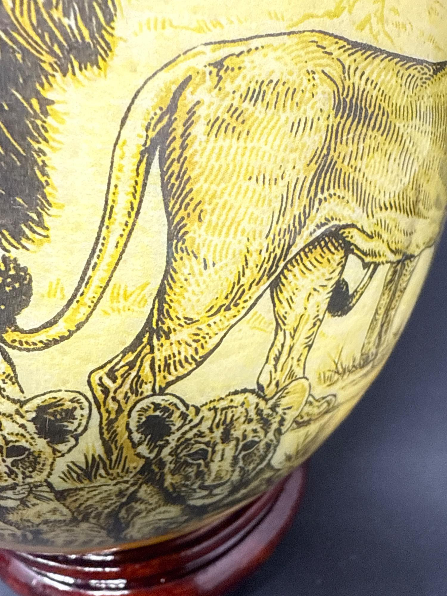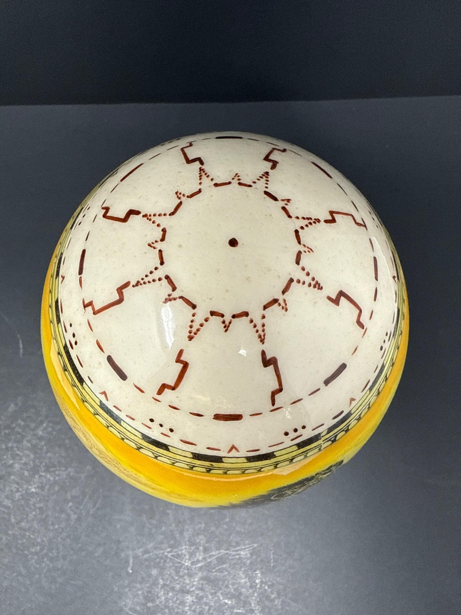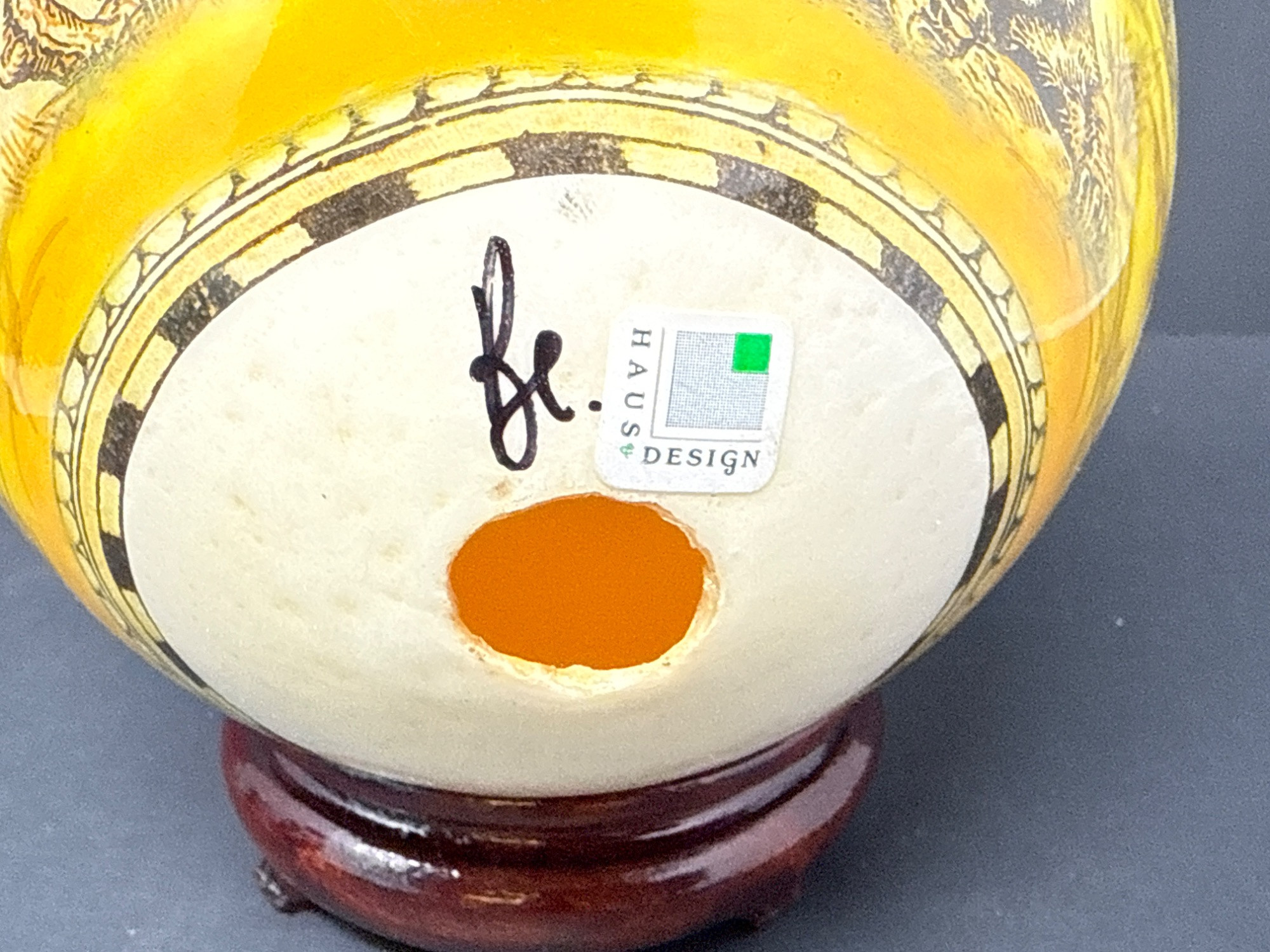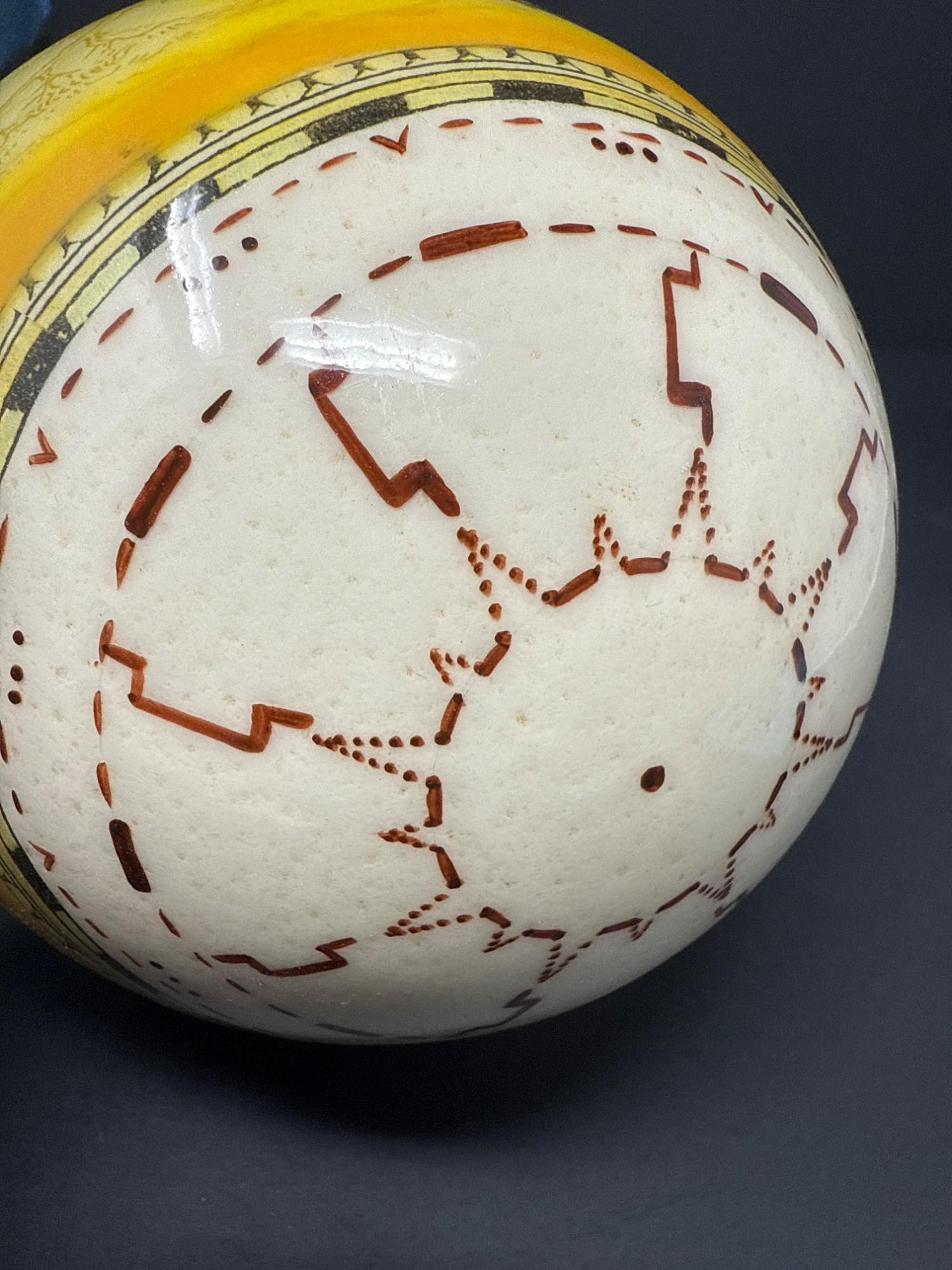 Bring the wild beauty of the African savanna into your space with this striking hand-decorated ostrich egg, showcasing a breathtaking safari scene. Beautifully illustrated with a regal lion, lionesses, and playful cubs, the egg captures the majesty of wildlife in remarkable detail. The rich yellow and earthy tones create a warm backdrop for the finely etched animals, while tribal-style accents adorn the top edge of the egg. This authentic ostrich egg comes with a glossy, deep-red wooden stand, making it a perfect centerpiece or conversation piece. The bottom bears the original Haus Design sticker and is hand-signed by the artist, confirming its authenticity and craftsmanship. Item Details: Title: African Safari Decorated Ostrich Egg & Stand Medium: Real ostrich egg Artwork: Detailed wildlife illustration featuring lions Artist: Signed (see photos) Origin: Haus Design Includes: Custom-fitted wooden display stand Dimensions: Approx. 10" tall (with stand), 5" wide