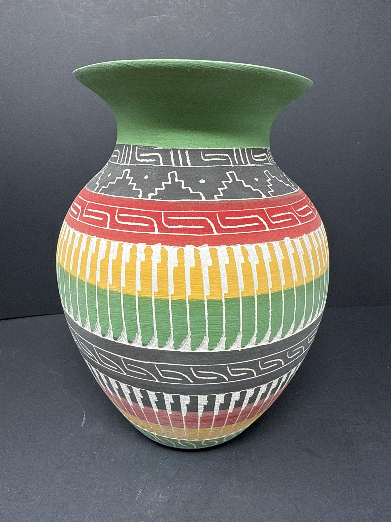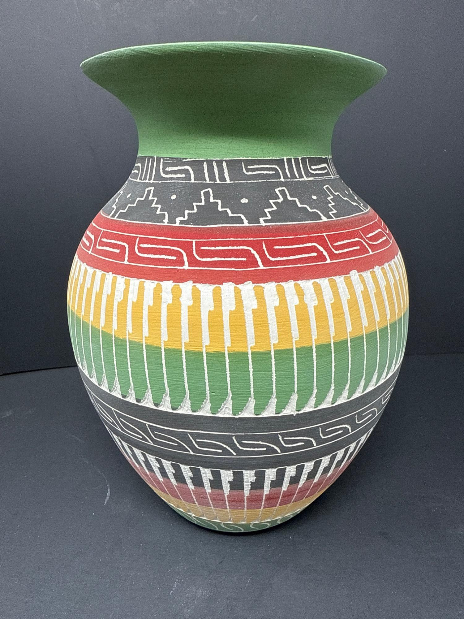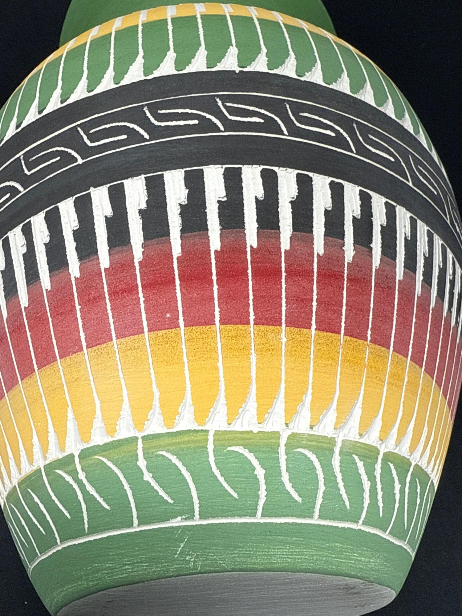 A striking handcrafted vase inspired by Indigenous artistry, featuring a beautifully flared rim and vibrant earth-tone bands. The surface is adorned with intricate geometric and linear patterns in black, red, yellow, green, and white—each detail etched and painted with care. Features: Material: Painted ceramic Dimensions: 8.2" Tall × 5.5" Wide Design: Hand-etched tribal motifs and geometric patterns Finish: Matte texture with carved detailing