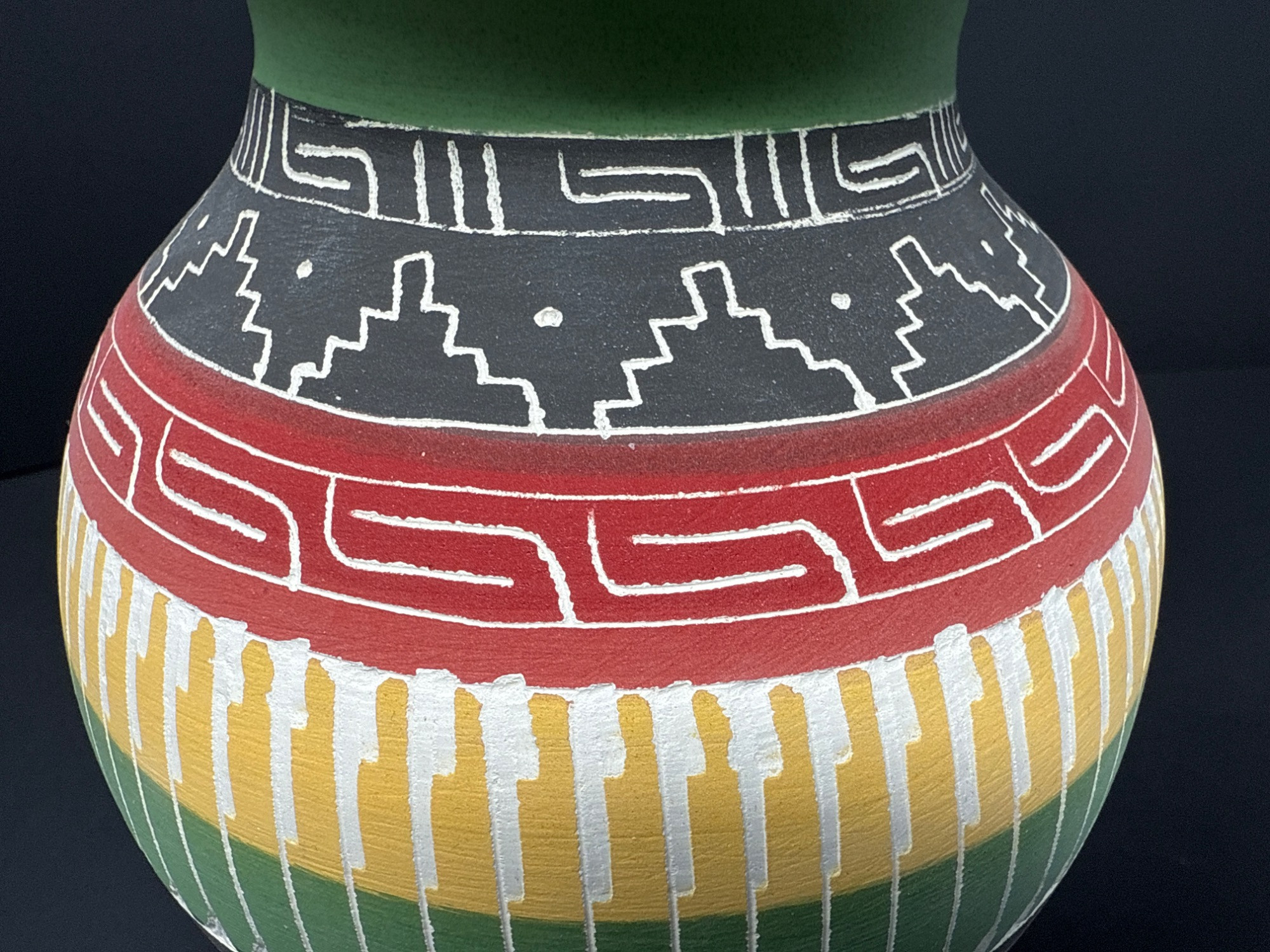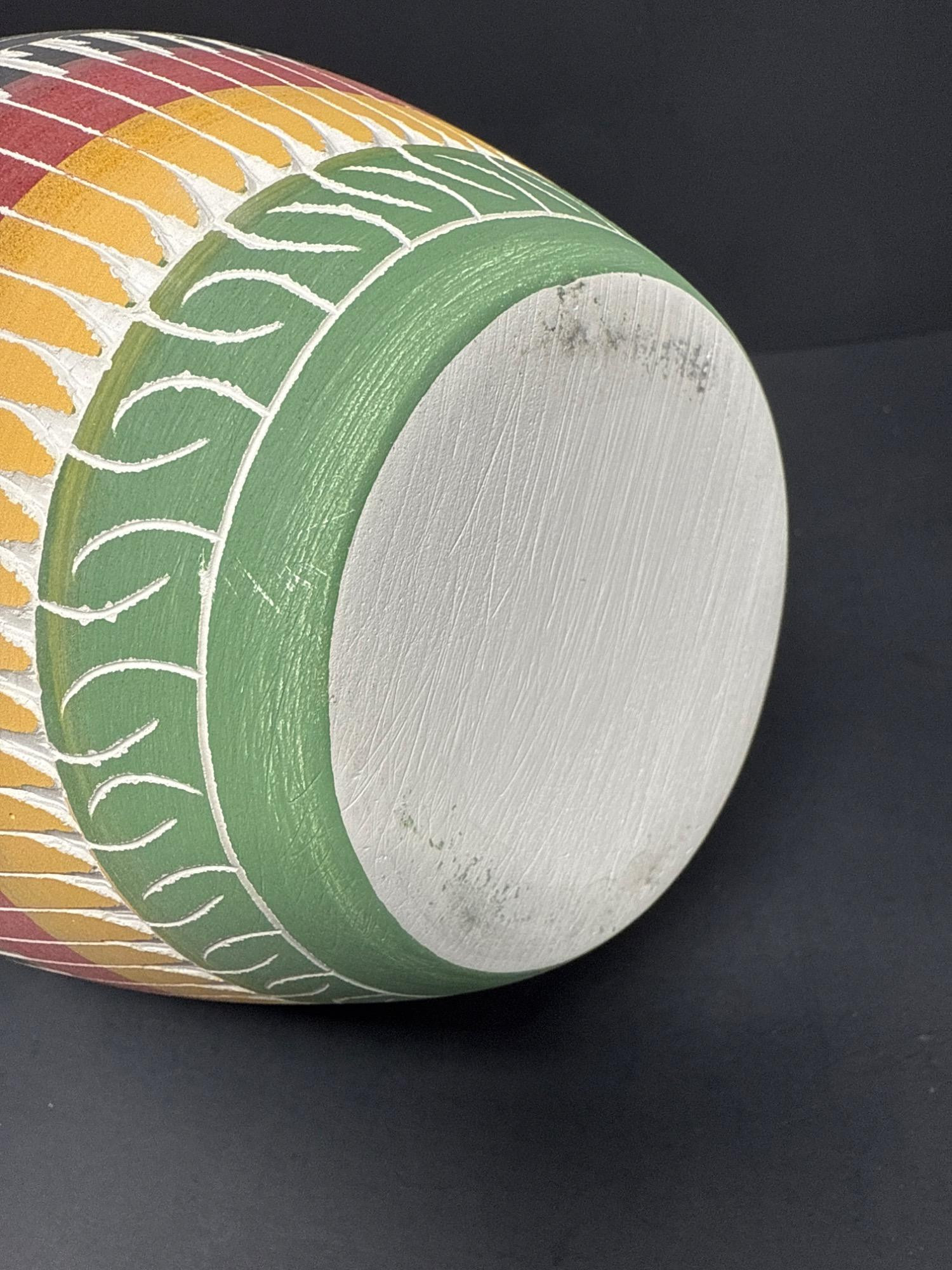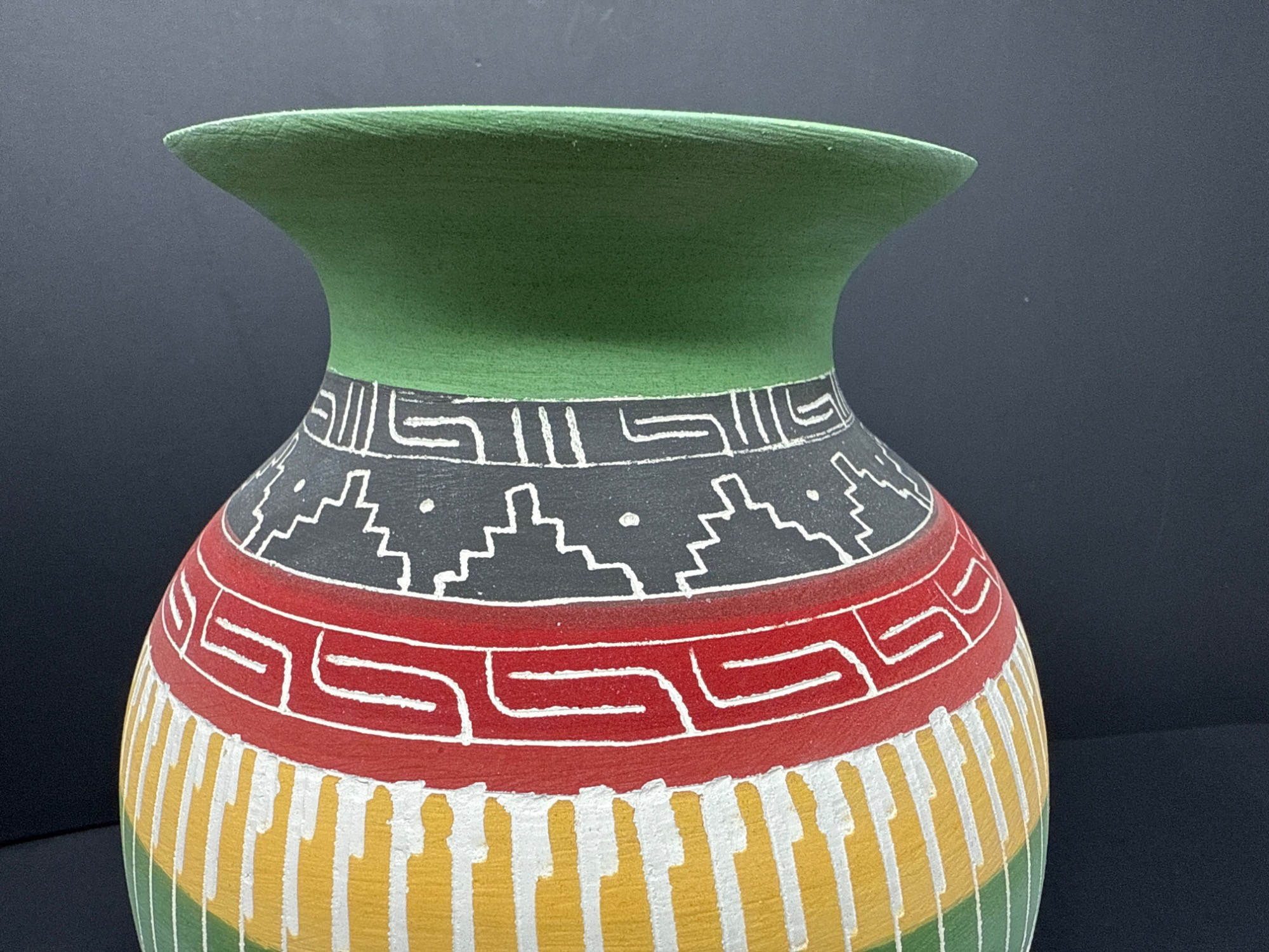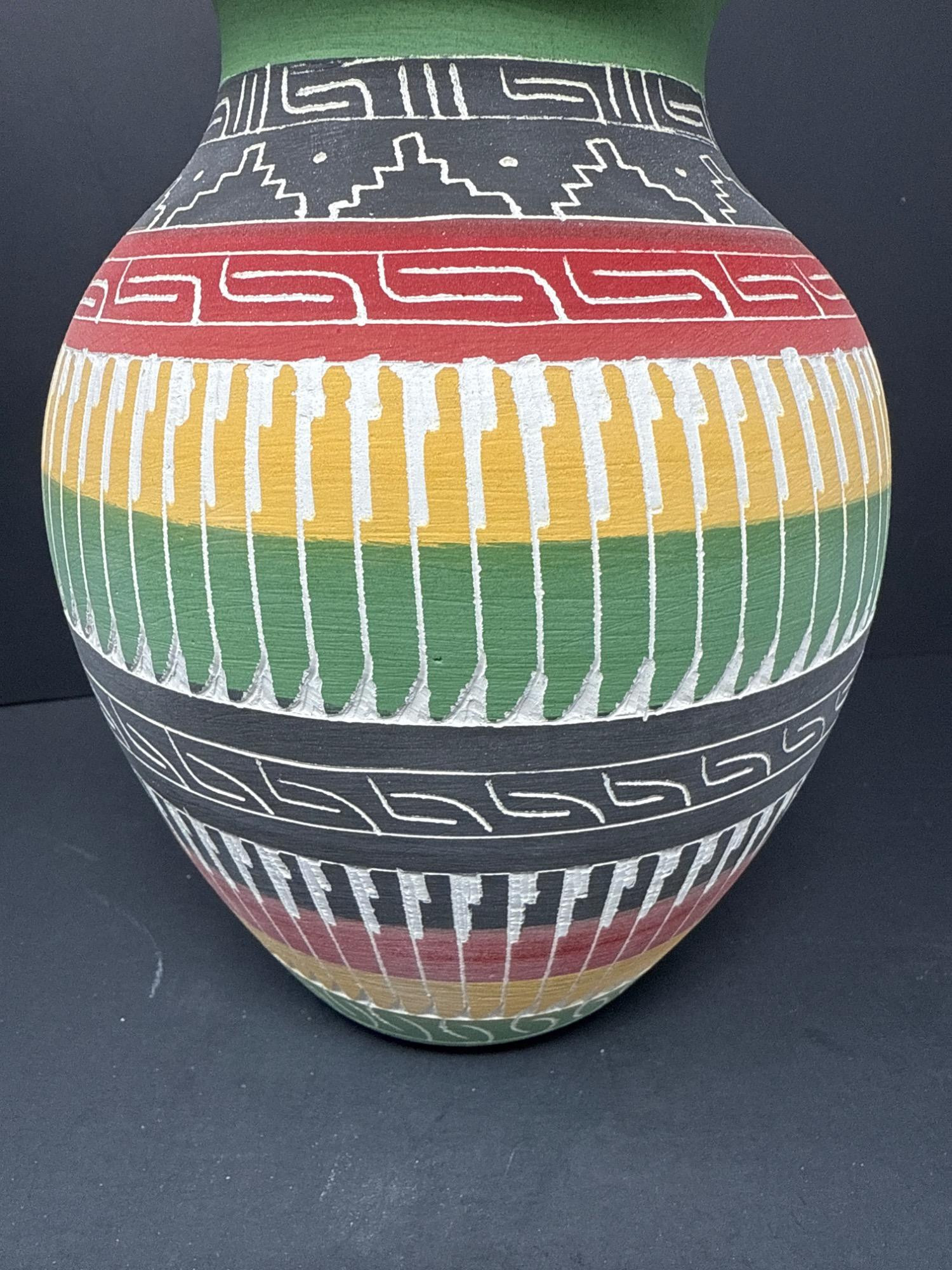 A striking handcrafted vase inspired by Indigenous artistry, featuring a beautifully flared rim and vibrant earth-tone bands. The surface is adorned with intricate geometric and linear patterns in black, red, yellow, green, and white—each detail etched and painted with care. Features: Material: Painted ceramic Dimensions: 8.2" Tall × 5.5" Wide Design: Hand-etched tribal motifs and geometric patterns Finish: Matte texture with carved detailing