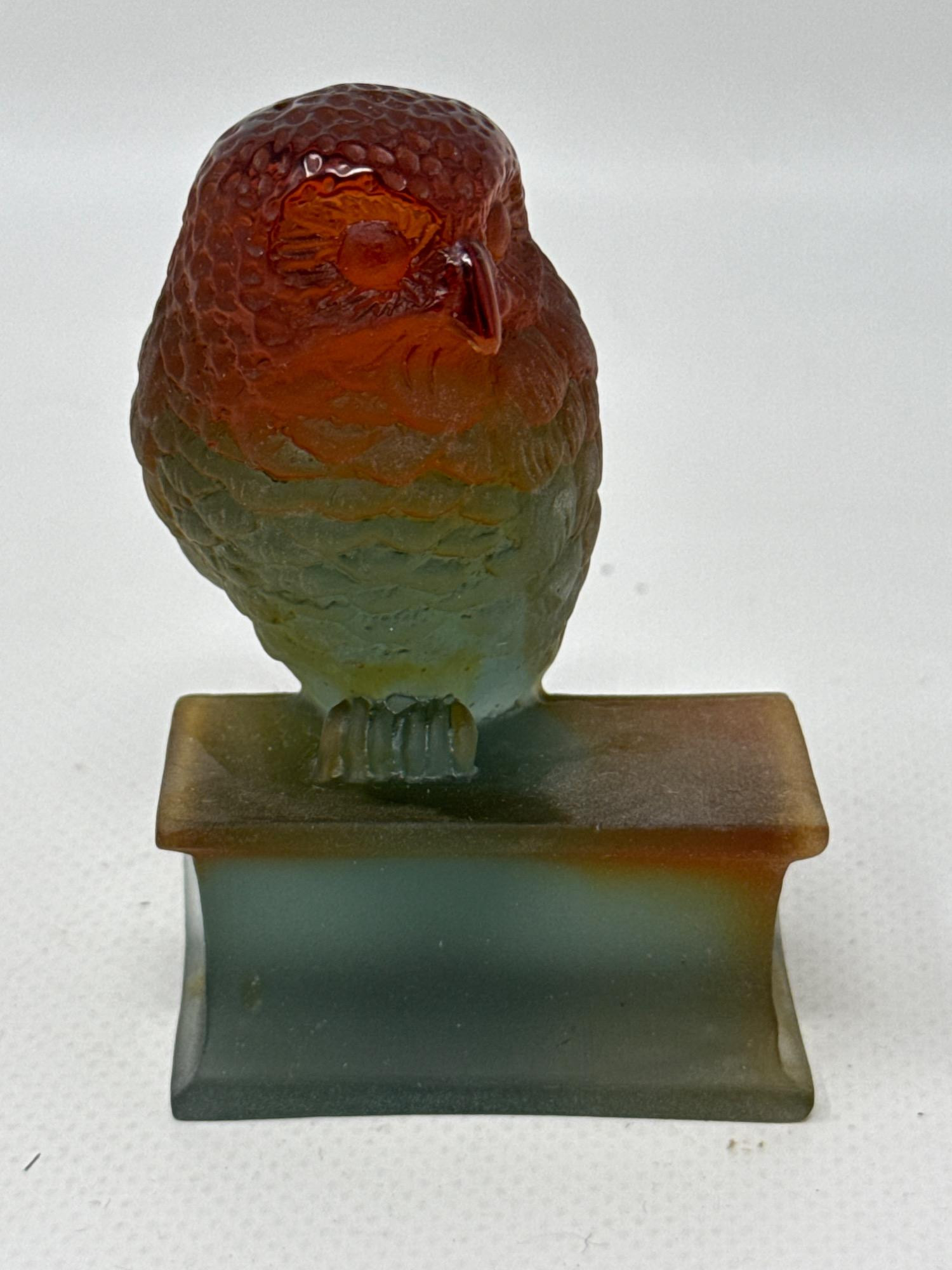 This striking multicolored glass sculpture features a finely detailed owl perched atop a stylized book. Crafted in France and signed Duam France 256, the piece showcases a rich ombré effect with hues of amber, olive, and deep green. The frosted finish adds a matte elegance that beautifully catches the light. Dimensions: 3.2" Tall x 2.2" Long x 1.2" Wide