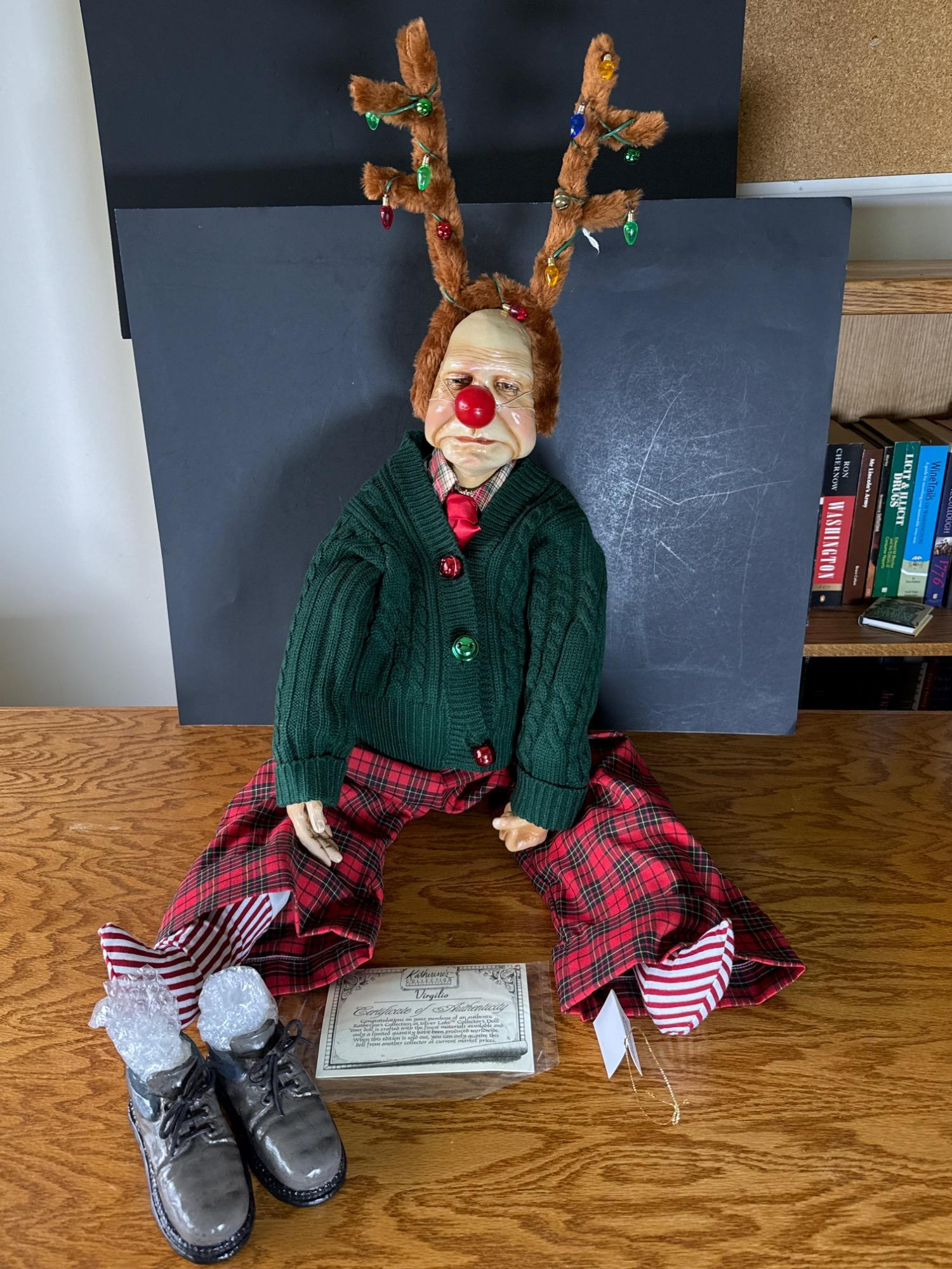 Add a touch of unique whimsy and holiday charm to your collection with "Virgilio the Clown" by Katherine’s Collection at Silver Lake. This rare, seated collector’s doll showcases the distinct craftsmanship and expressive artistry Katherine’s Collection is known for. Item Details: Name: Virgilio the Clown Brand: Katherine’s Collection at Silver Lake Edition Date: December 2004 Includes: Original Certificate of Authenticity Original collector’s box Pair of detailed realistic shoes (removable) Festive attire: plaid pants, a green knit cardigan with red/green buttons, a red tie, and whimsical striped socks Reindeer antlers adorned with tiny lights and ornaments (adds a holiday twist) Classic clown red nose (removable elastic strap) Size: Seated figure, 20" tall.