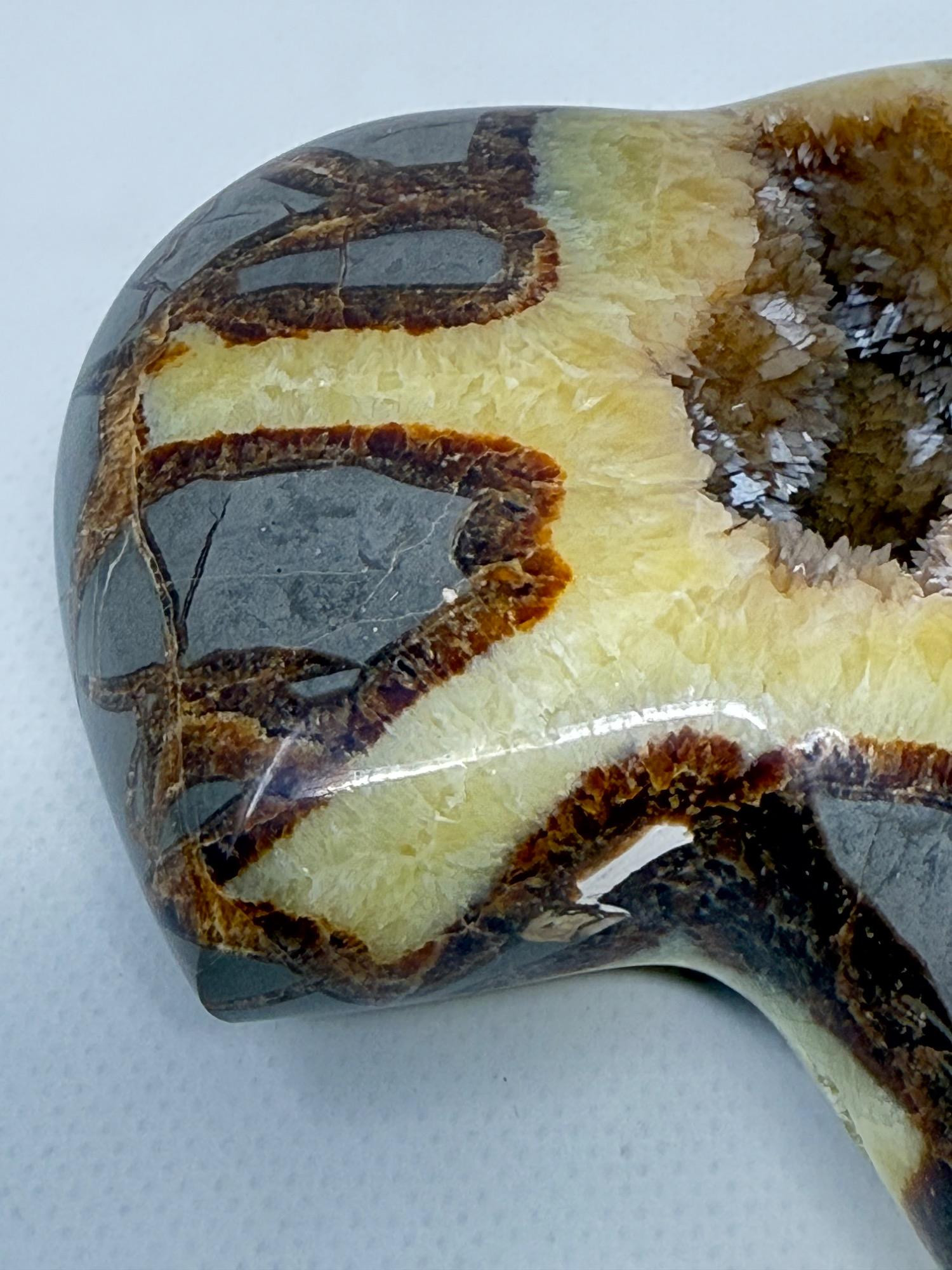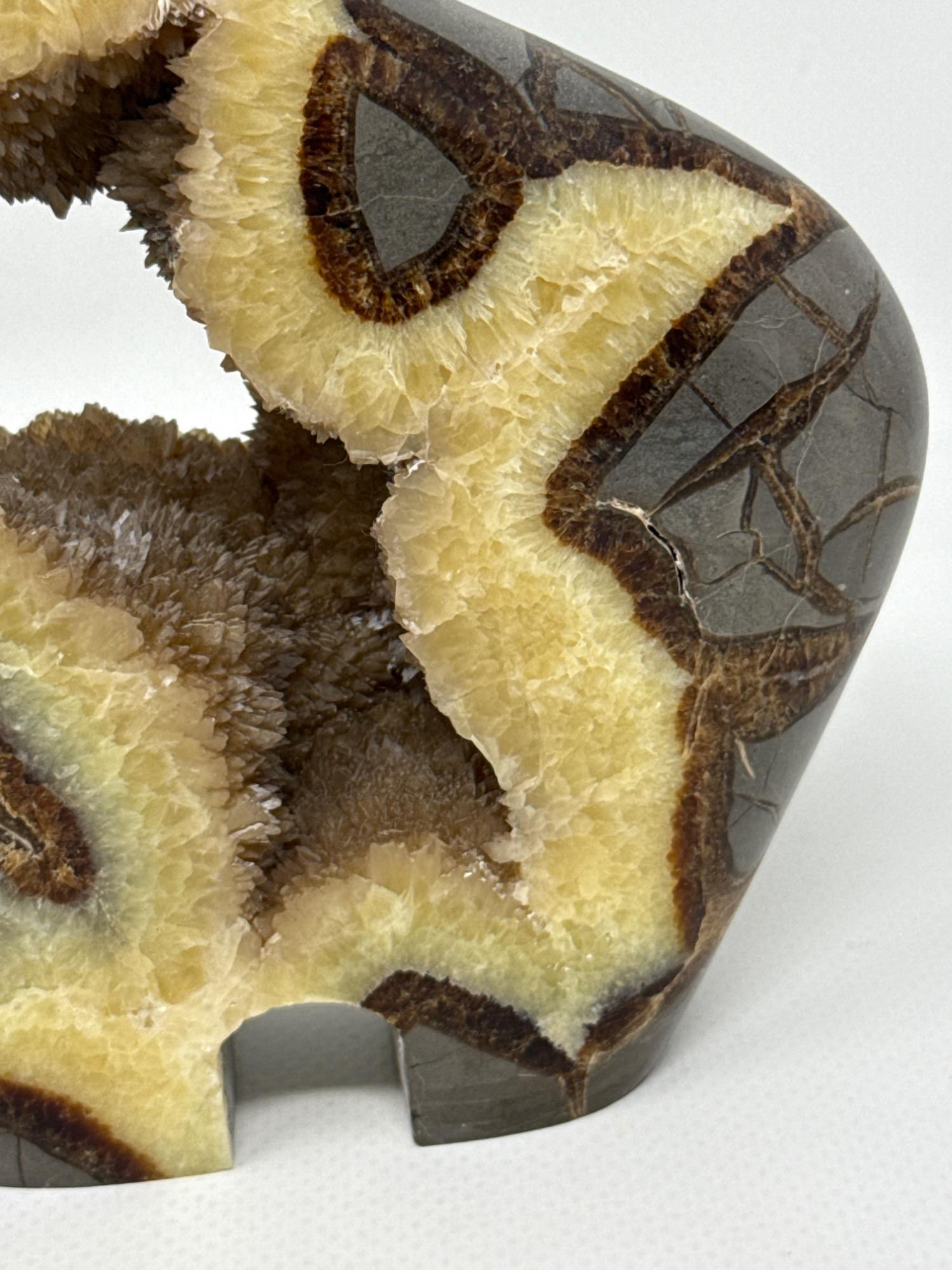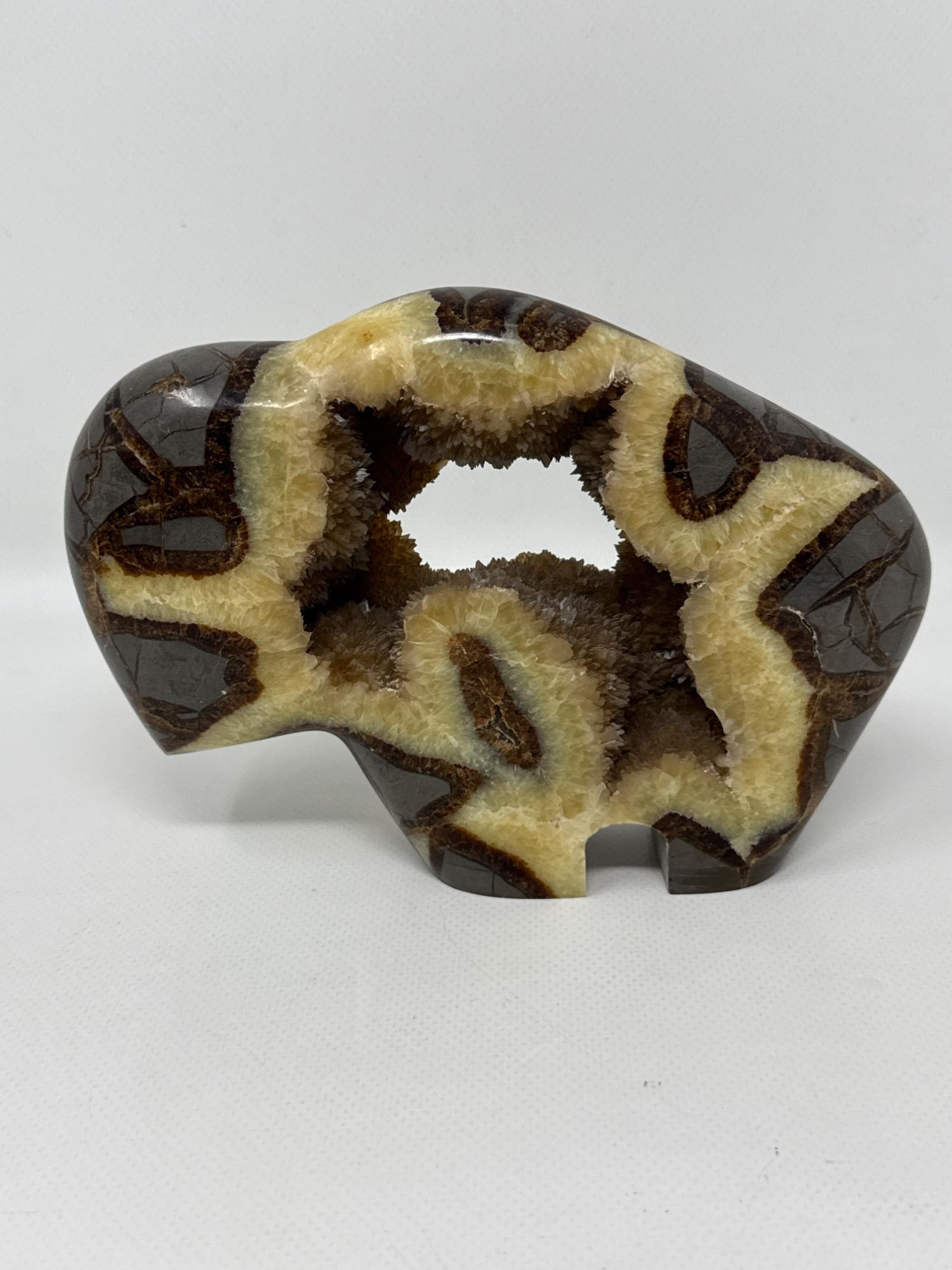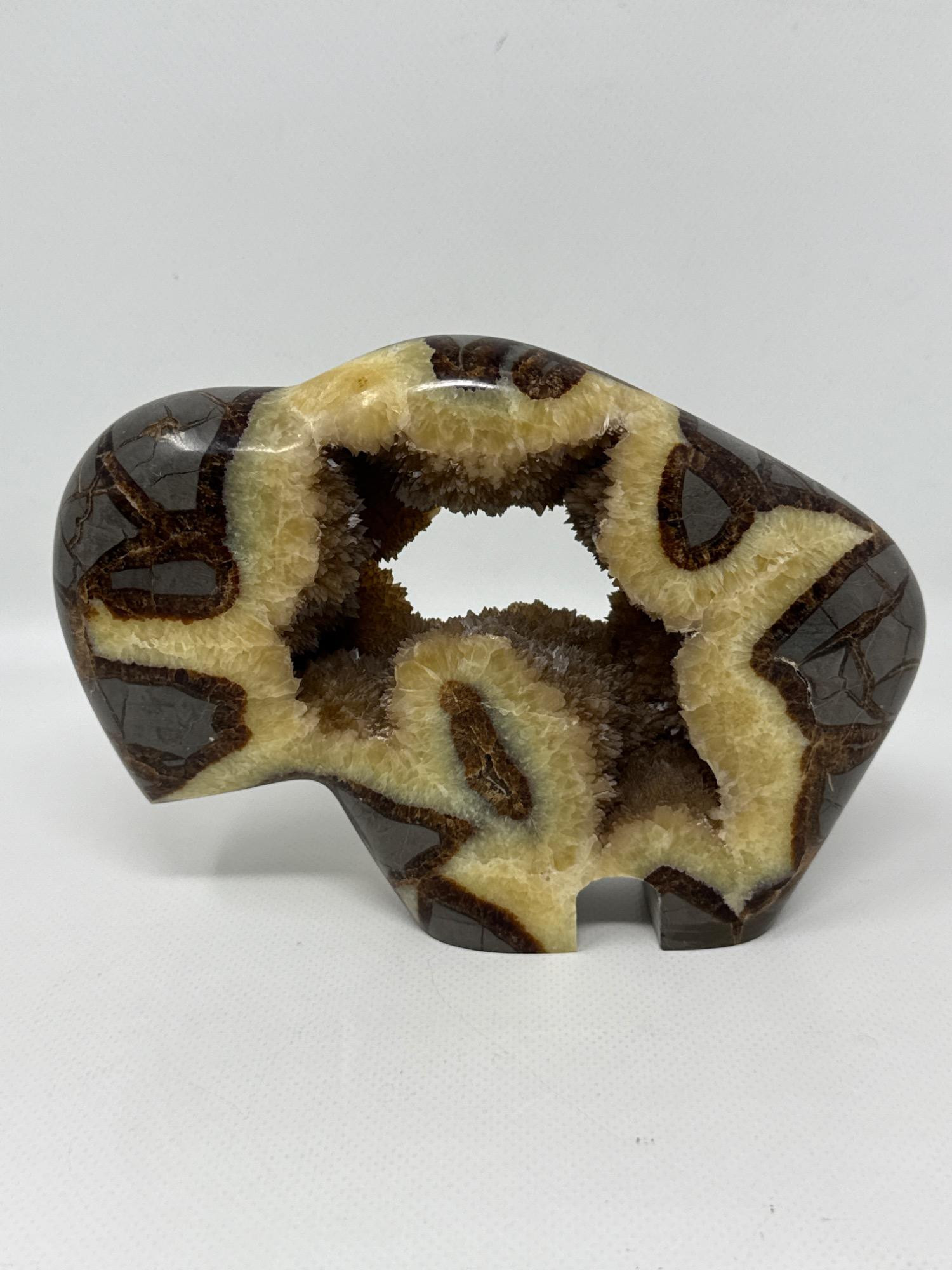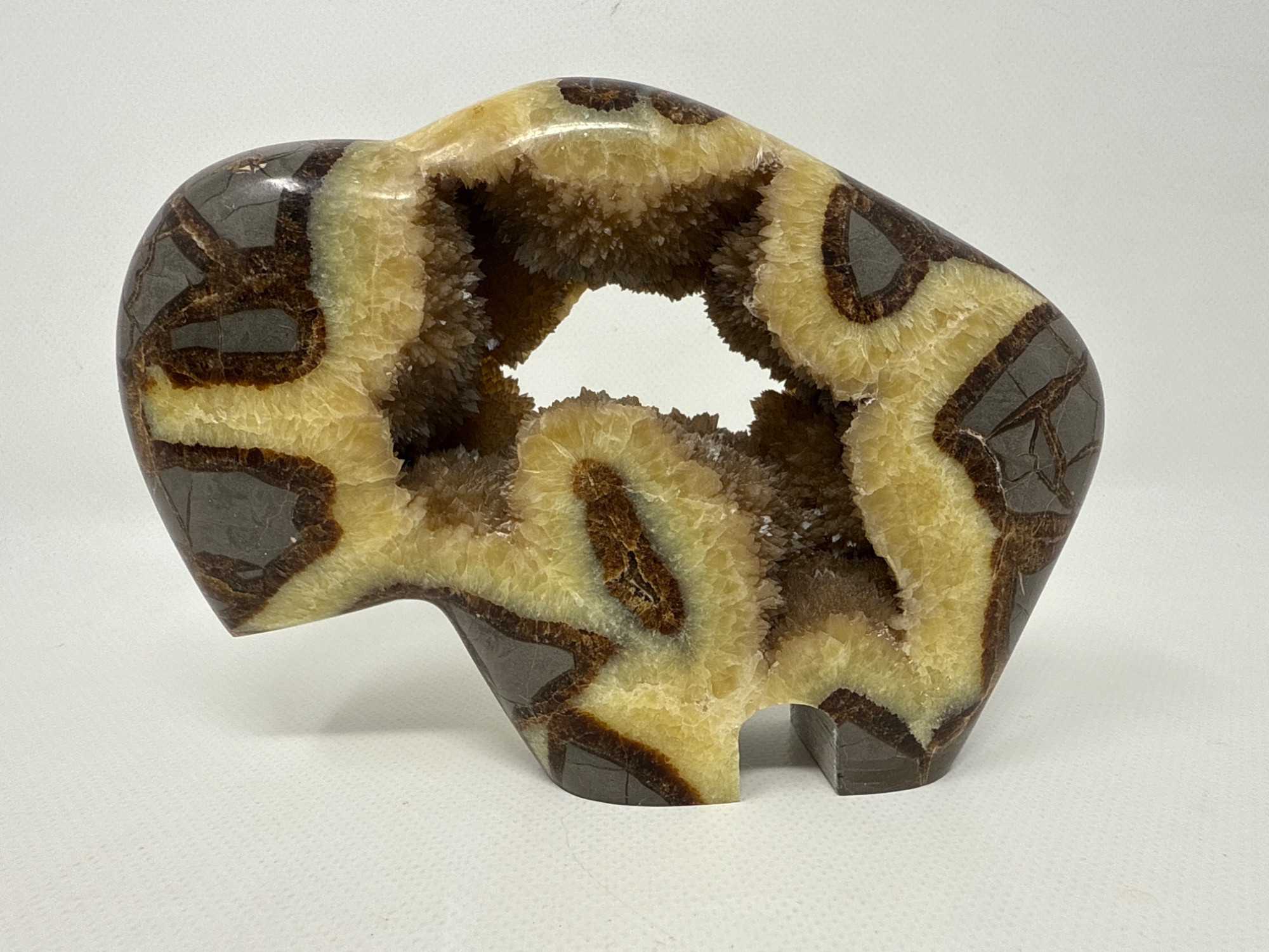 A breathtaking hand-carved bison sculpture made from natural Septarian stone, featuring vibrant golden Calcite crystal formations. This piece displays the signature earthy browns and creamy yellows of Septarian, with a stunning geode-like cavity at the center filled with sparkling Calcite crystals. Material: Natural Septarian Stone with Calcite Crystals Highlights: Unique honeycomb and lightning-like patterns Naturally polished stone with raw crystal interior Beautiful balance of organic texture and polished surfaces