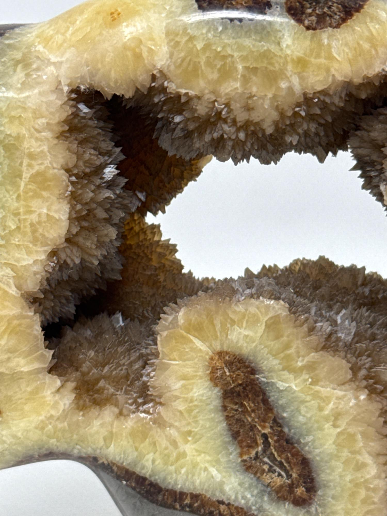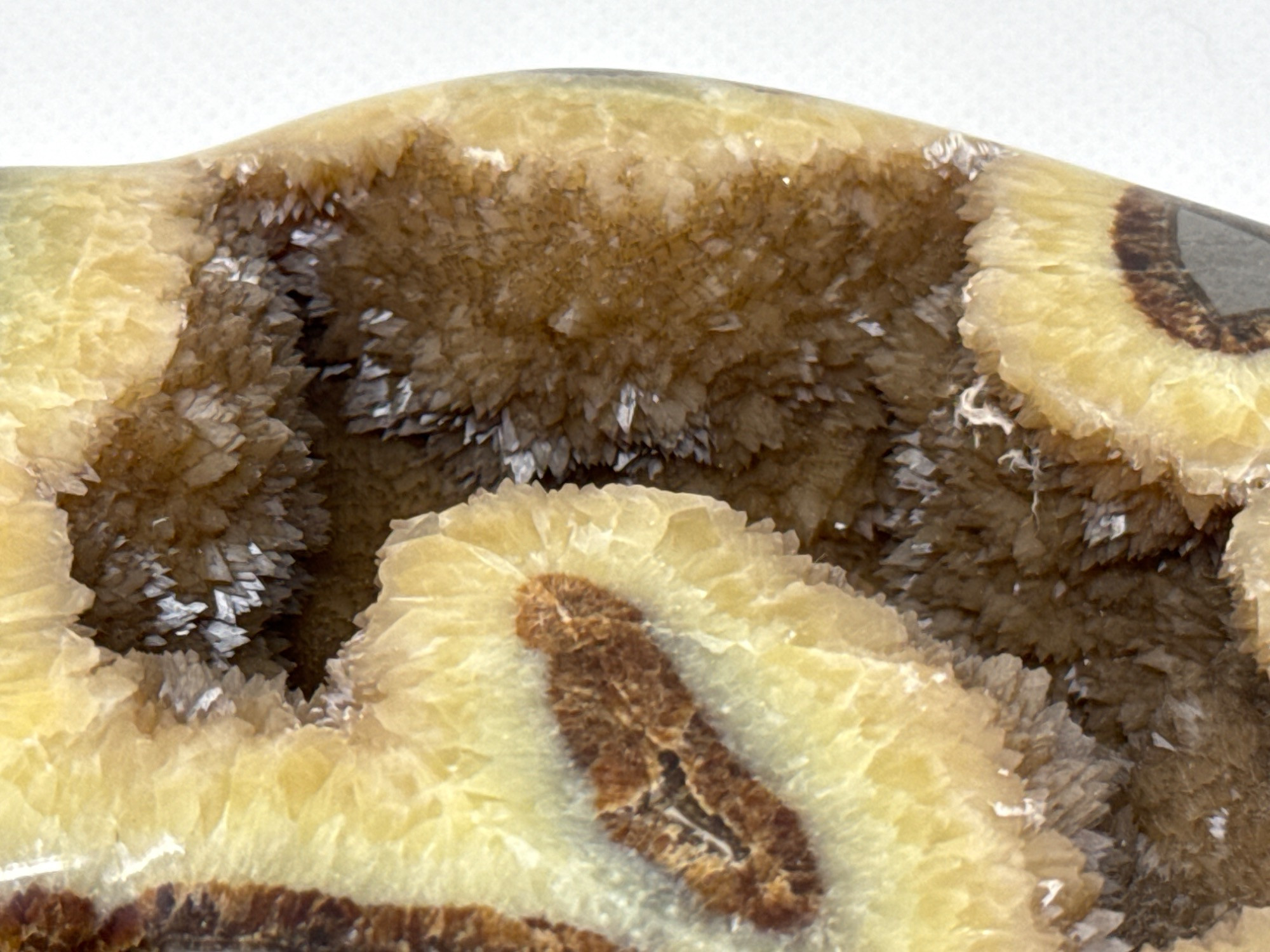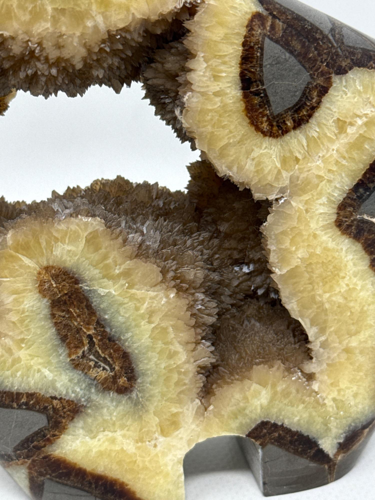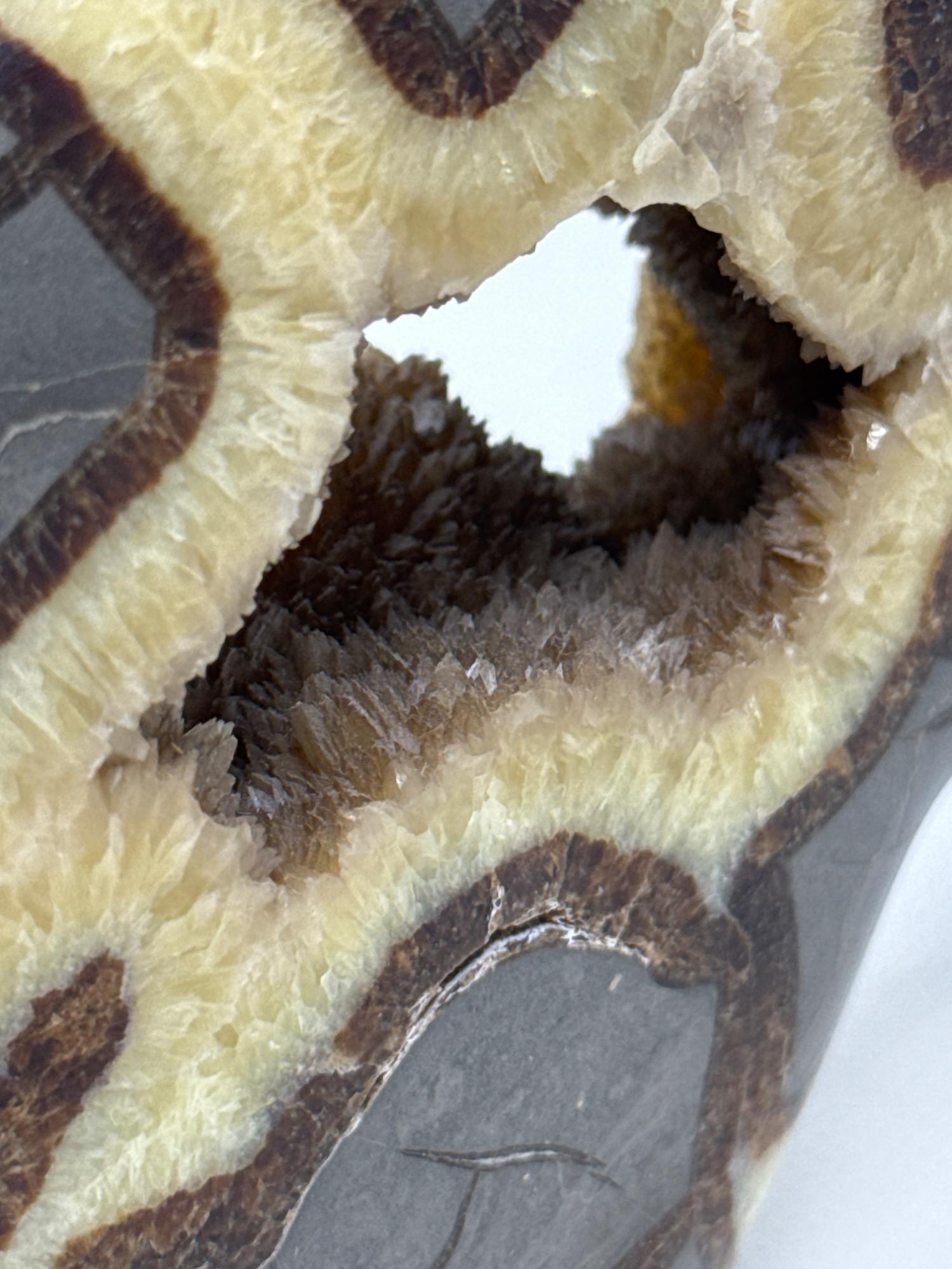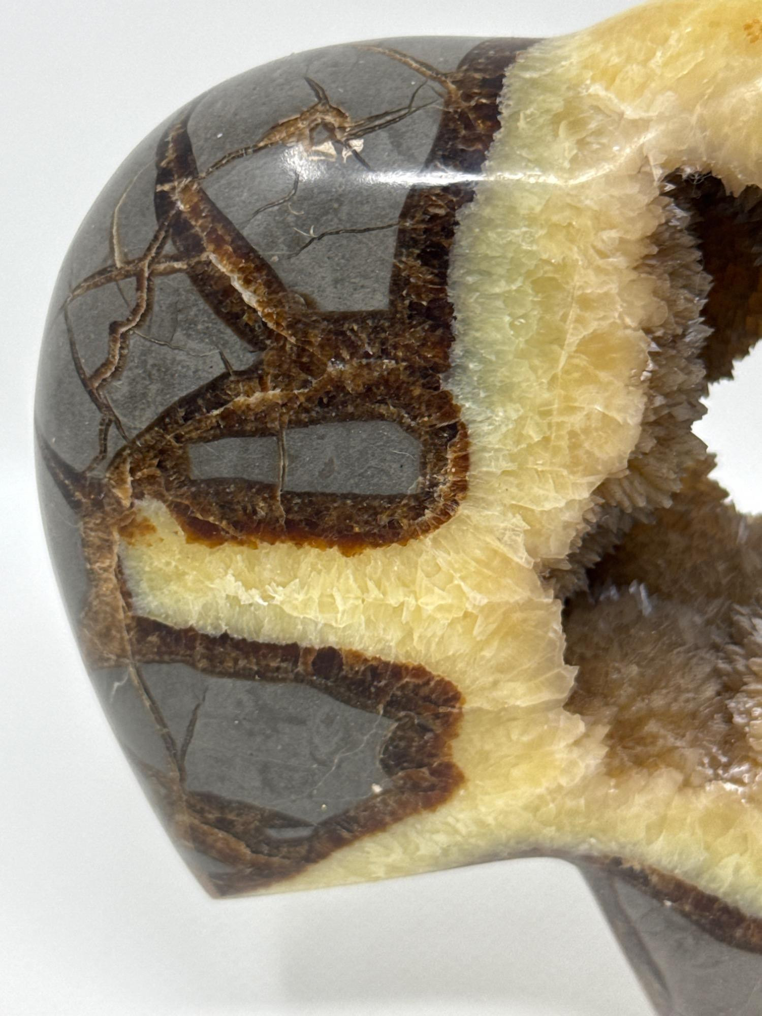A breathtaking hand-carved bison sculpture made from natural Septarian stone, featuring vibrant golden Calcite crystal formations. This piece displays the signature earthy browns and creamy yellows of Septarian, with a stunning geode-like cavity at the center filled with sparkling Calcite crystals. Material: Natural Septarian Stone with Calcite Crystals Highlights: Unique honeycomb and lightning-like patterns Naturally polished stone with raw crystal interior Beautiful balance of organic texture and polished surfaces