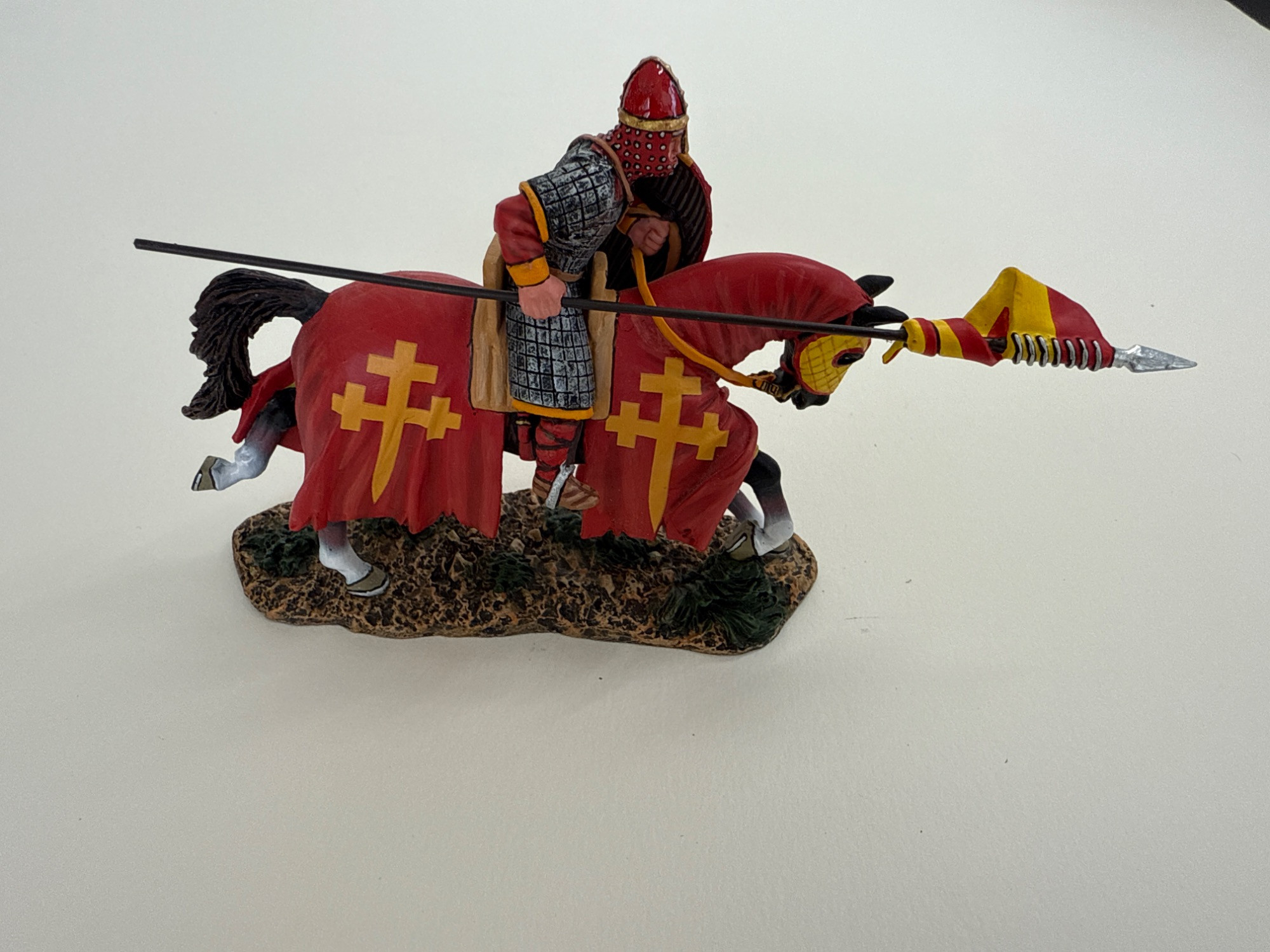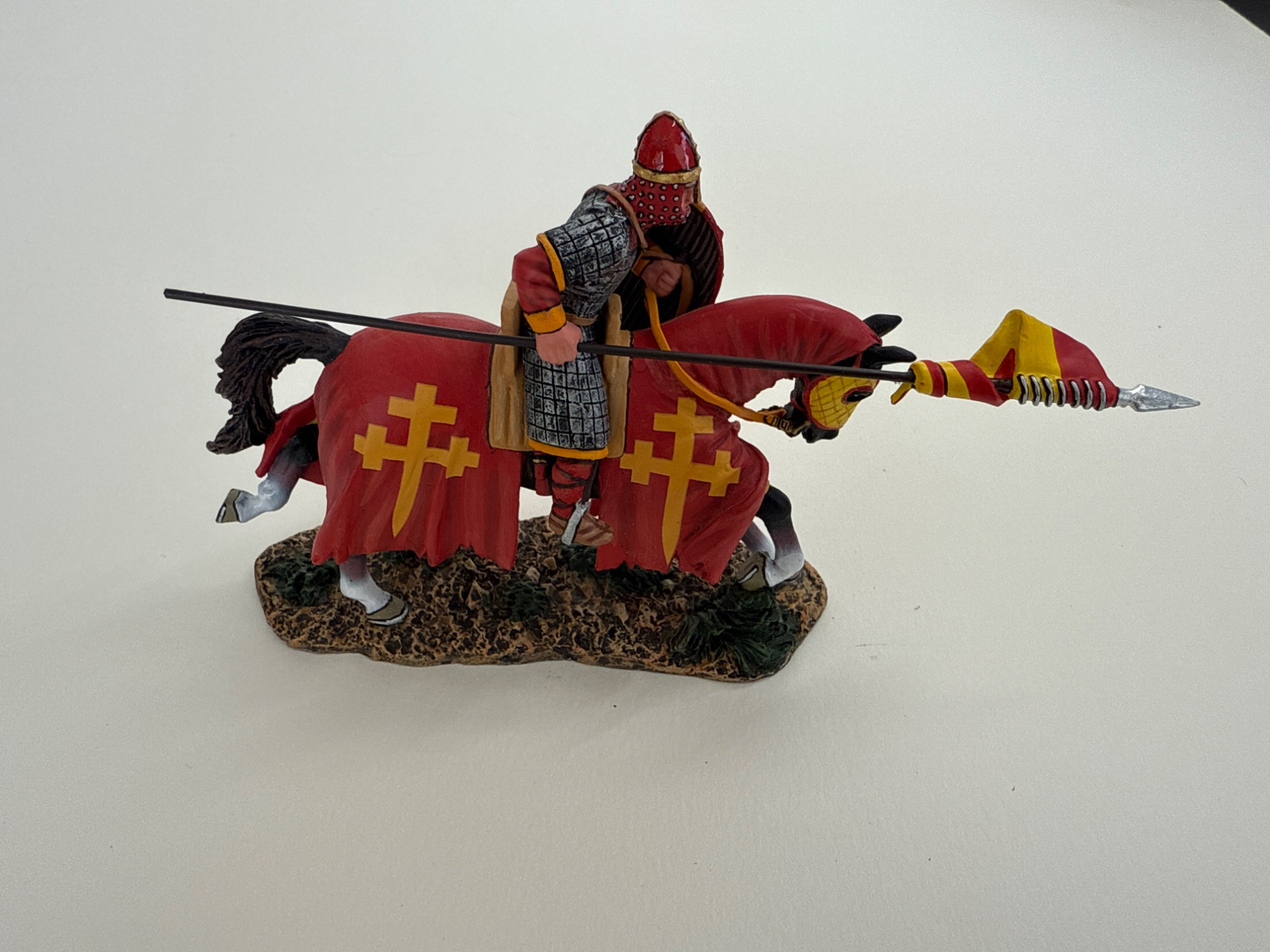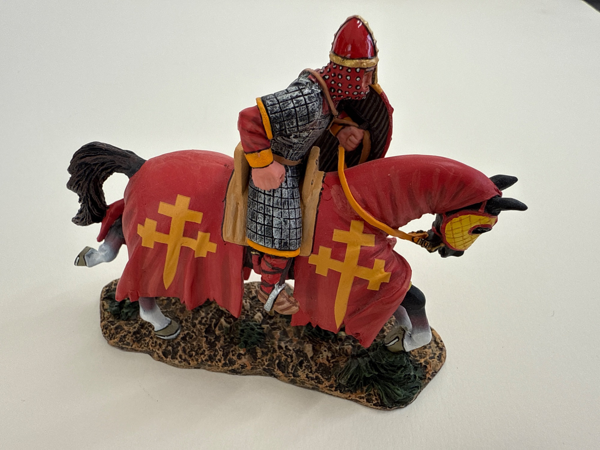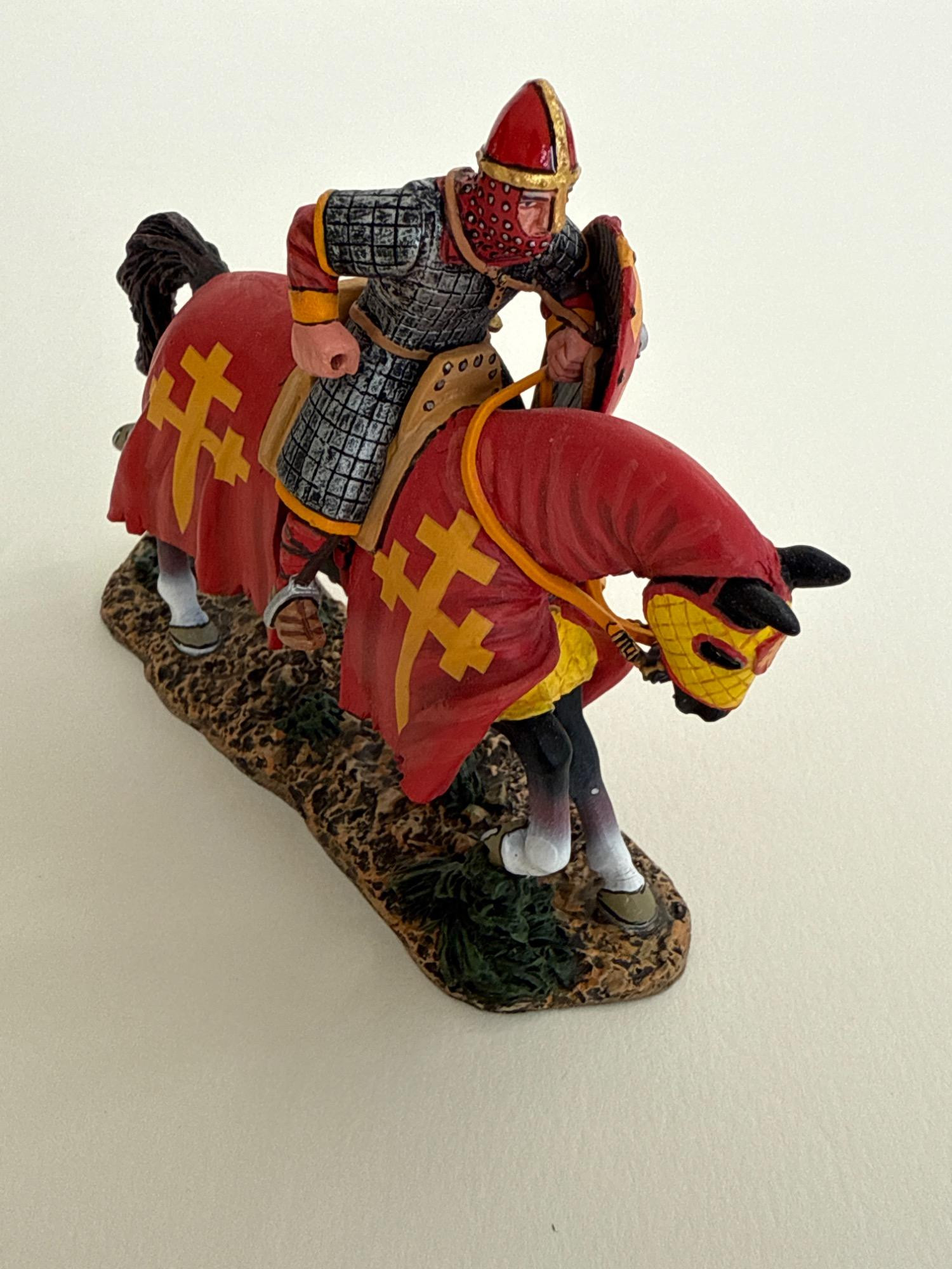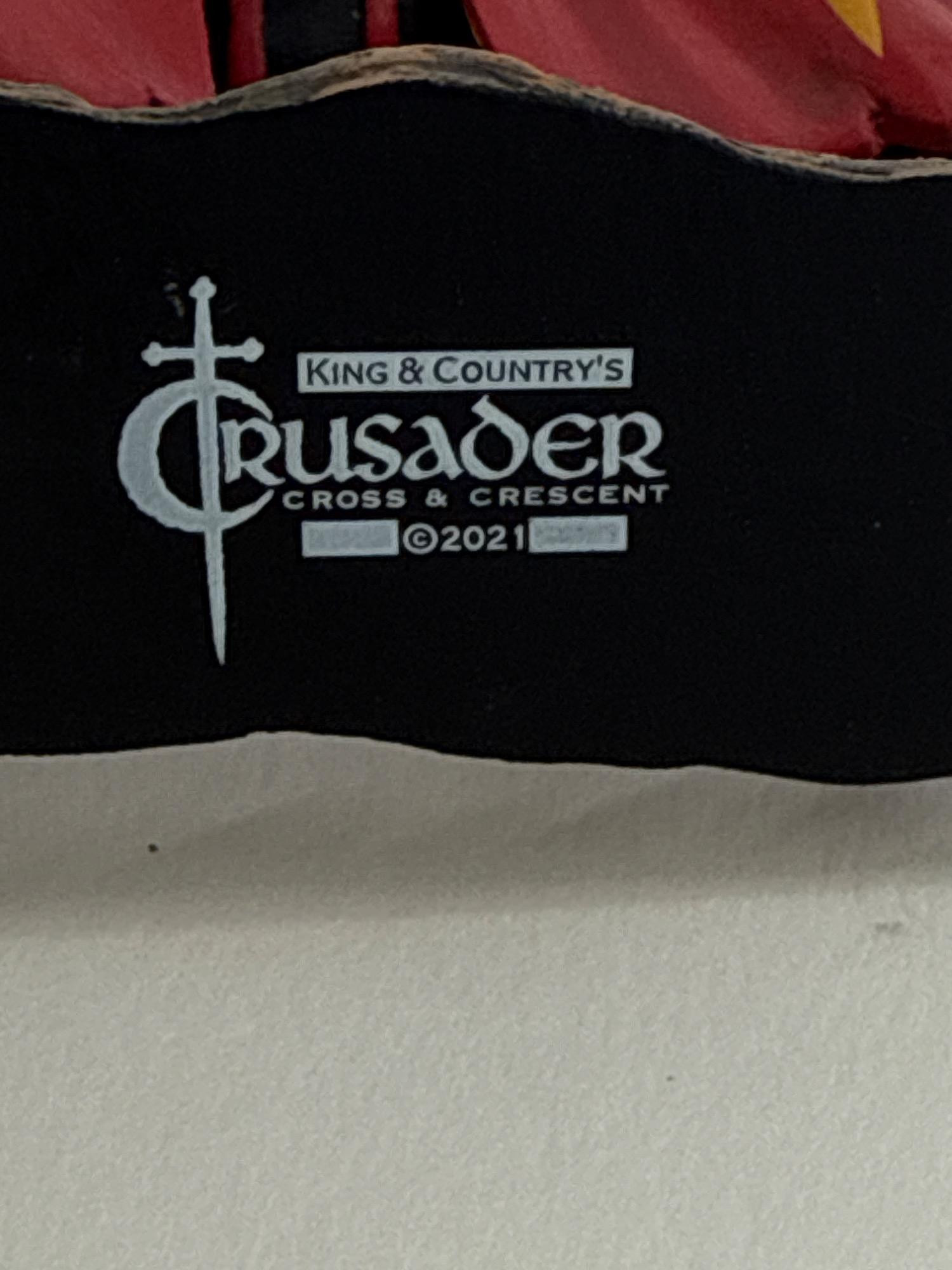 This striking hand-painted metal figure from King & Country’s acclaimed Crusader: Cross & Crescent series (2021 release) features the Red Knight of Jerusalem in full mounted charge. Dressed in a detailed red and gold surcoat emblazoned with Jerusalem crosses, the knight is captured in mid-lance thrust, exemplifying the power and pageantry of the medieval crusades. Brand: King & Country Series: Crusader: Cross & Crescent Material: Hand-painted metal Year: 2021 Dimensions: 4.2 inches long x 3.2 inches tall x 1.2 inches wide Packaging: Includes original box and protective foam
