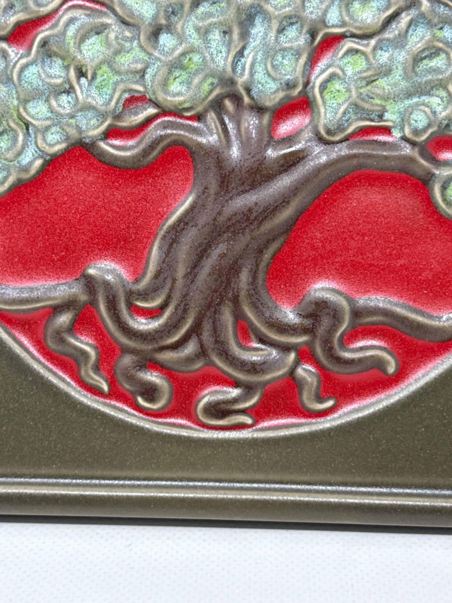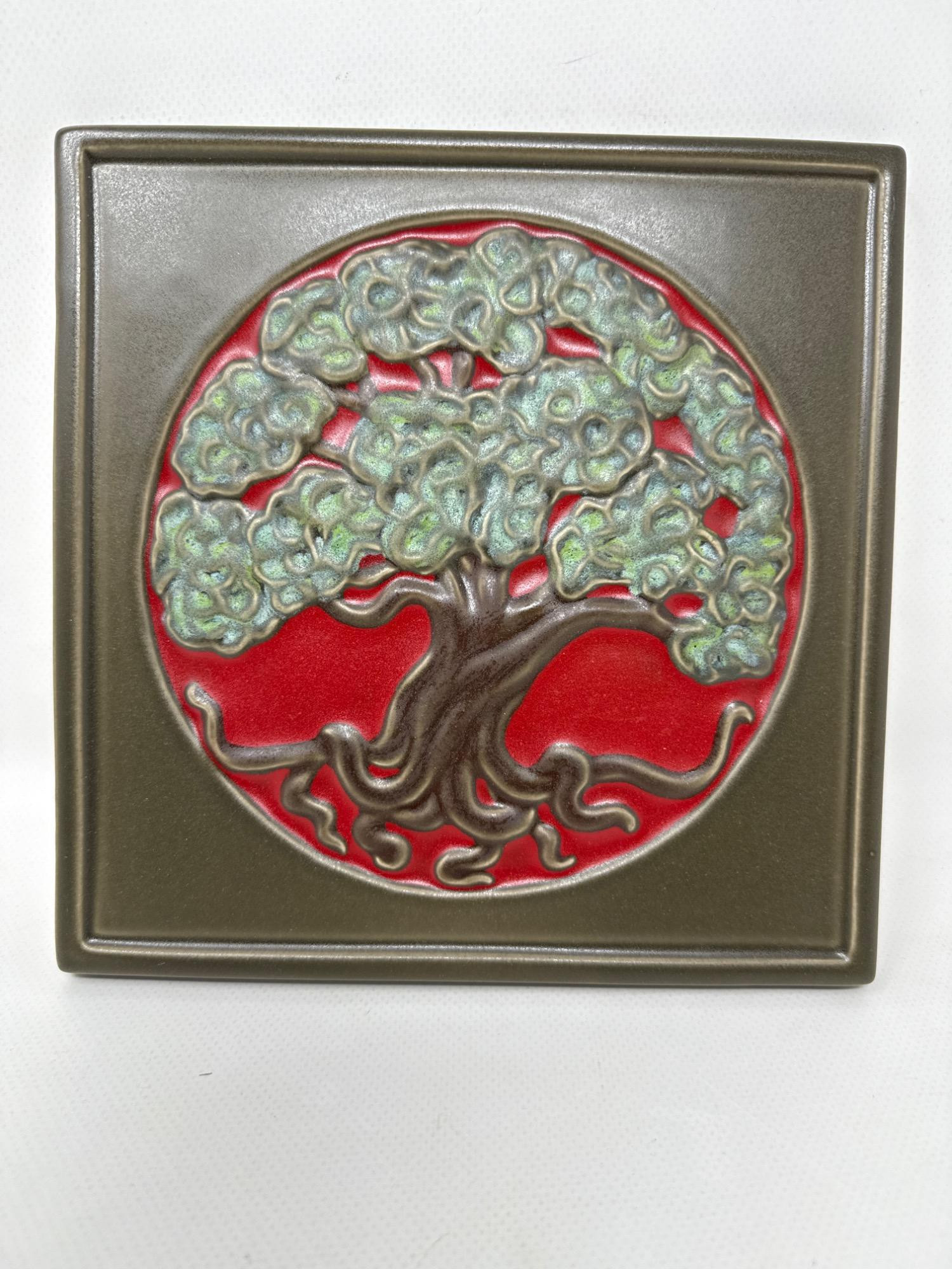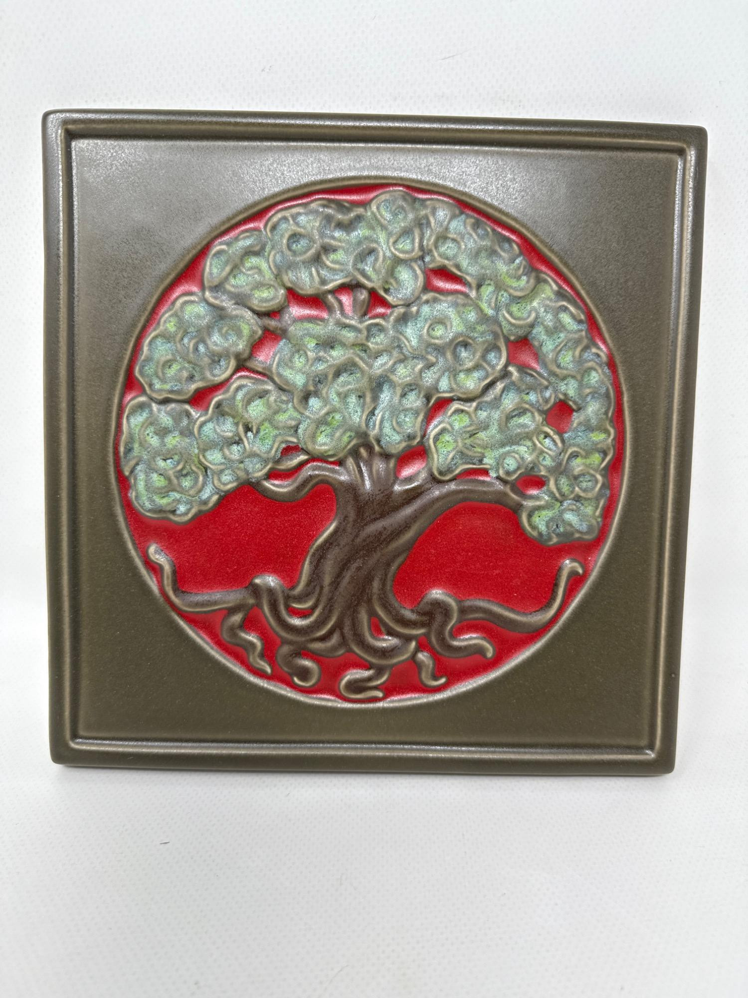 This beautifully crafted tile by Rookwood Pottery features the iconic Tree of Life design, a symbol of longevity, growth, and prosperity. Originally featured in the 1912 Rookwood catalog Believed to be designed circa 1907 Depicts an oak tree, a common representation of the Tree of Life across many cultures Richly glazed in earthy tones with a bold red background Ideal for display or integration into architectural installations Backmarked with Rookwood logo and reference information. Dimensions: 8"W x 8.25"T Catalog Number: 40137