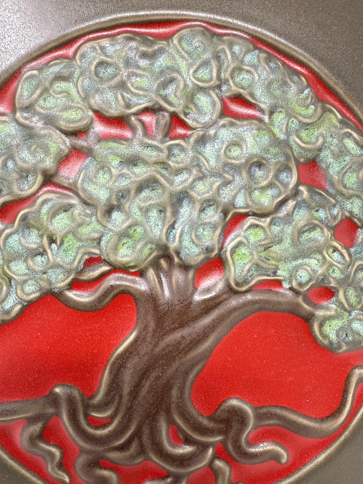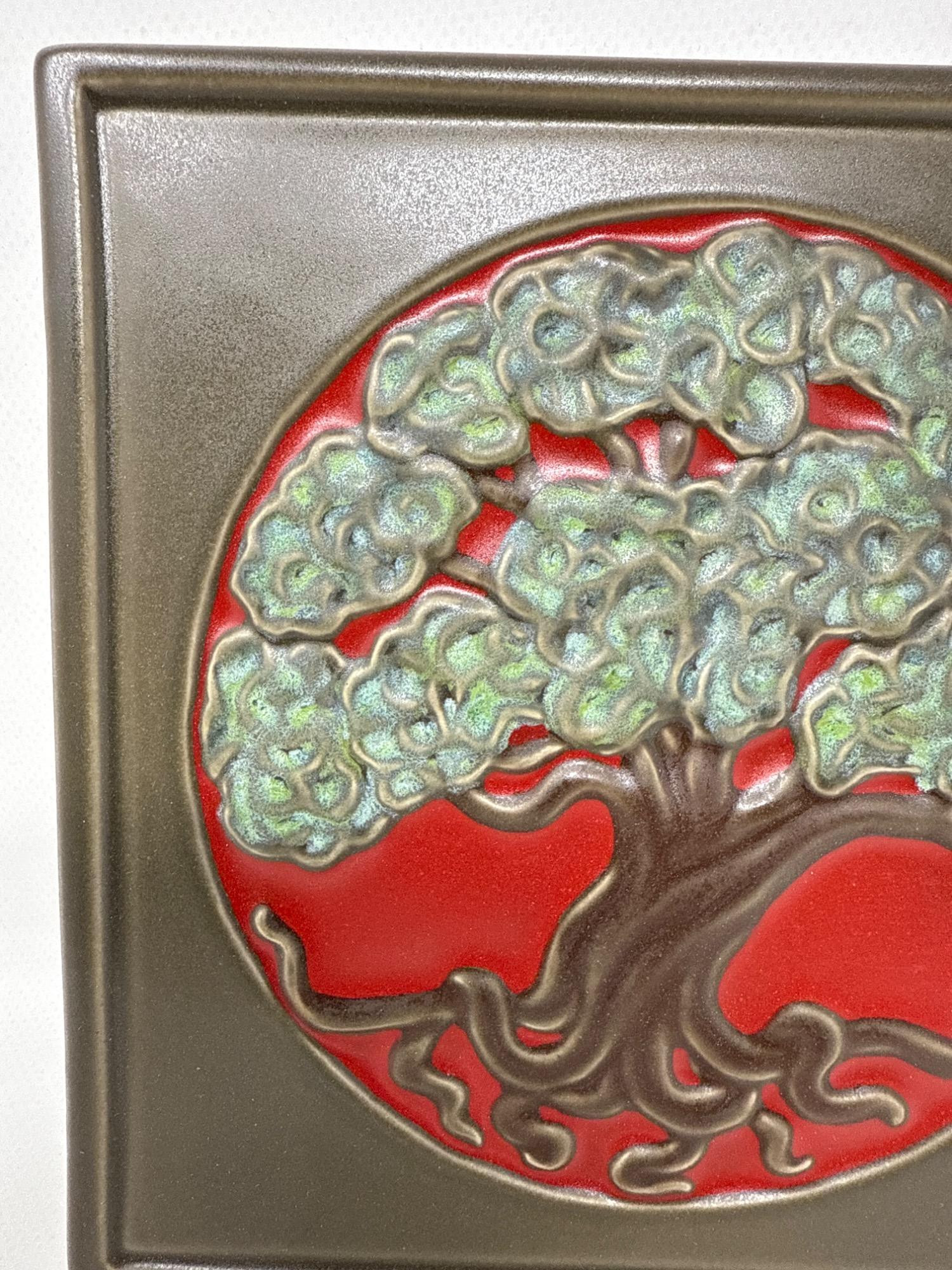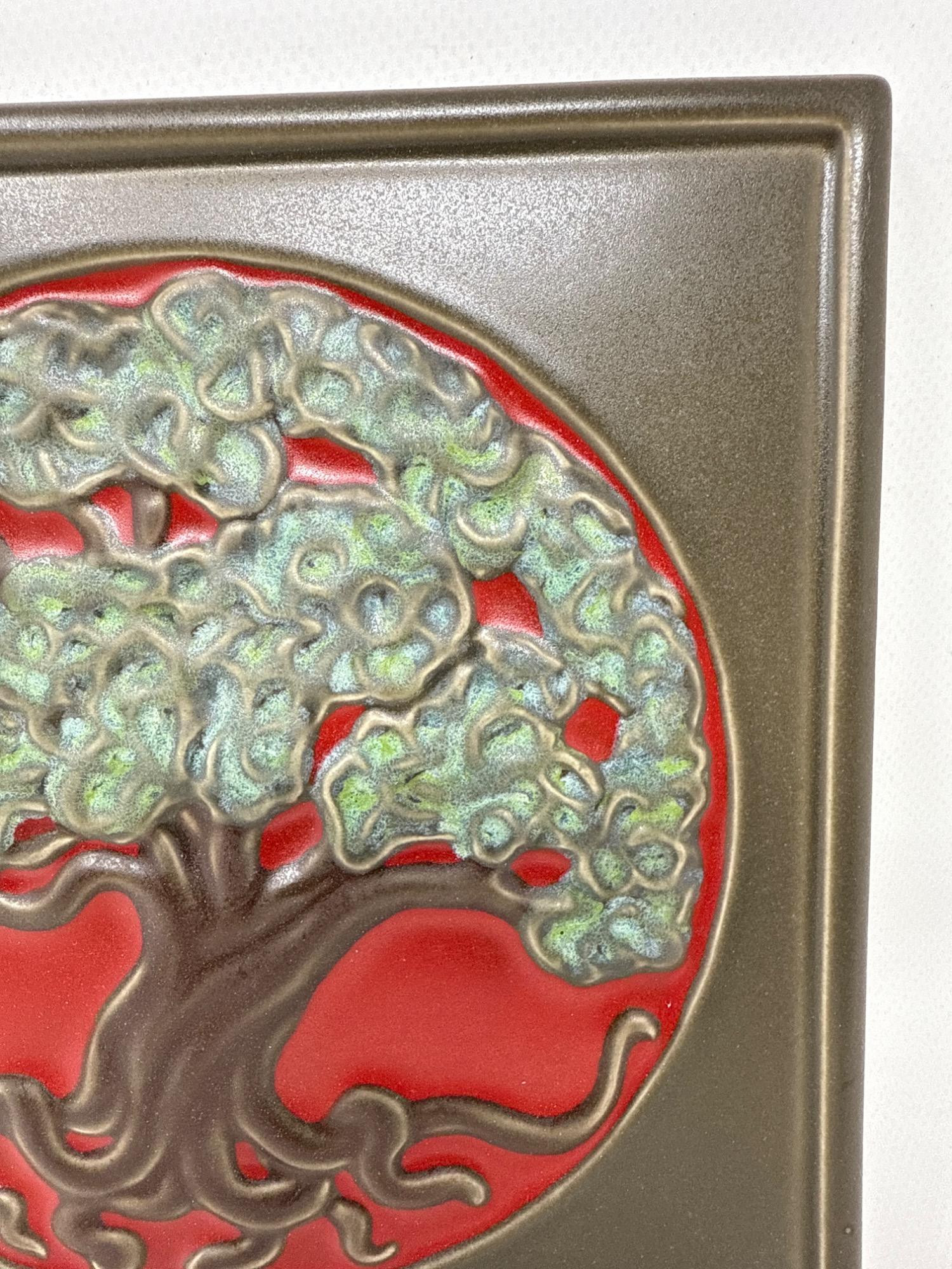 This beautifully crafted tile by Rookwood Pottery features the iconic Tree of Life design, a symbol of longevity, growth, and prosperity. Originally featured in the 1912 Rookwood catalog Believed to be designed circa 1907 Depicts an oak tree, a common representation of the Tree of Life across many cultures Richly glazed in earthy tones with a bold red background Ideal for display or integration into architectural installations Backmarked with Rookwood logo and reference information. Dimensions: 8"W x 8.25"T Catalog Number: 40137