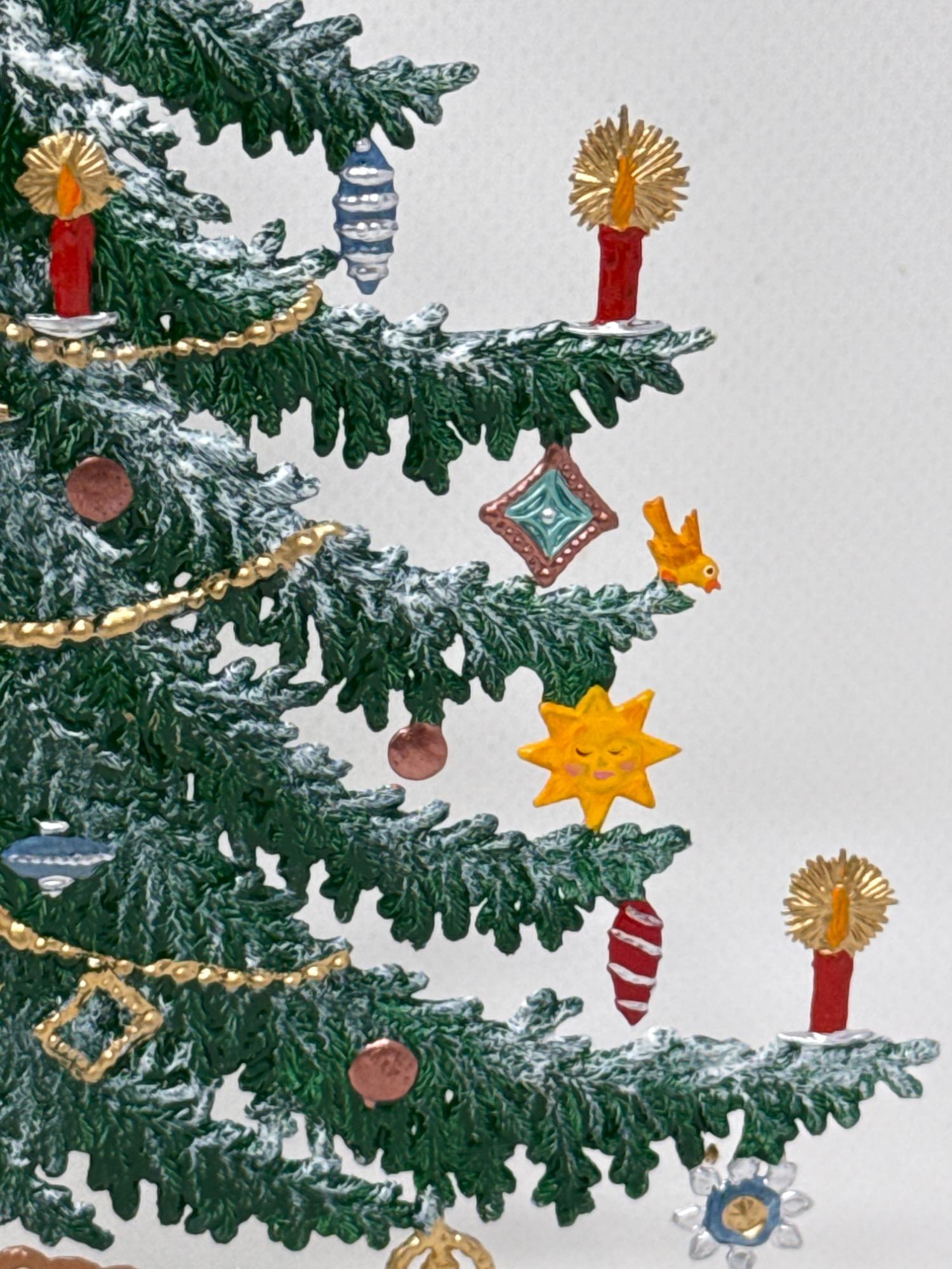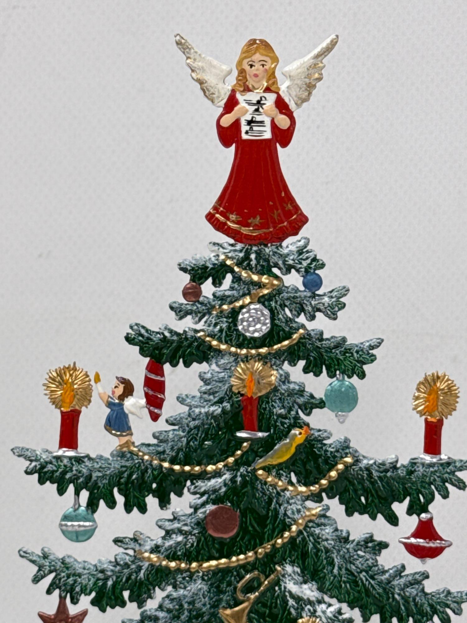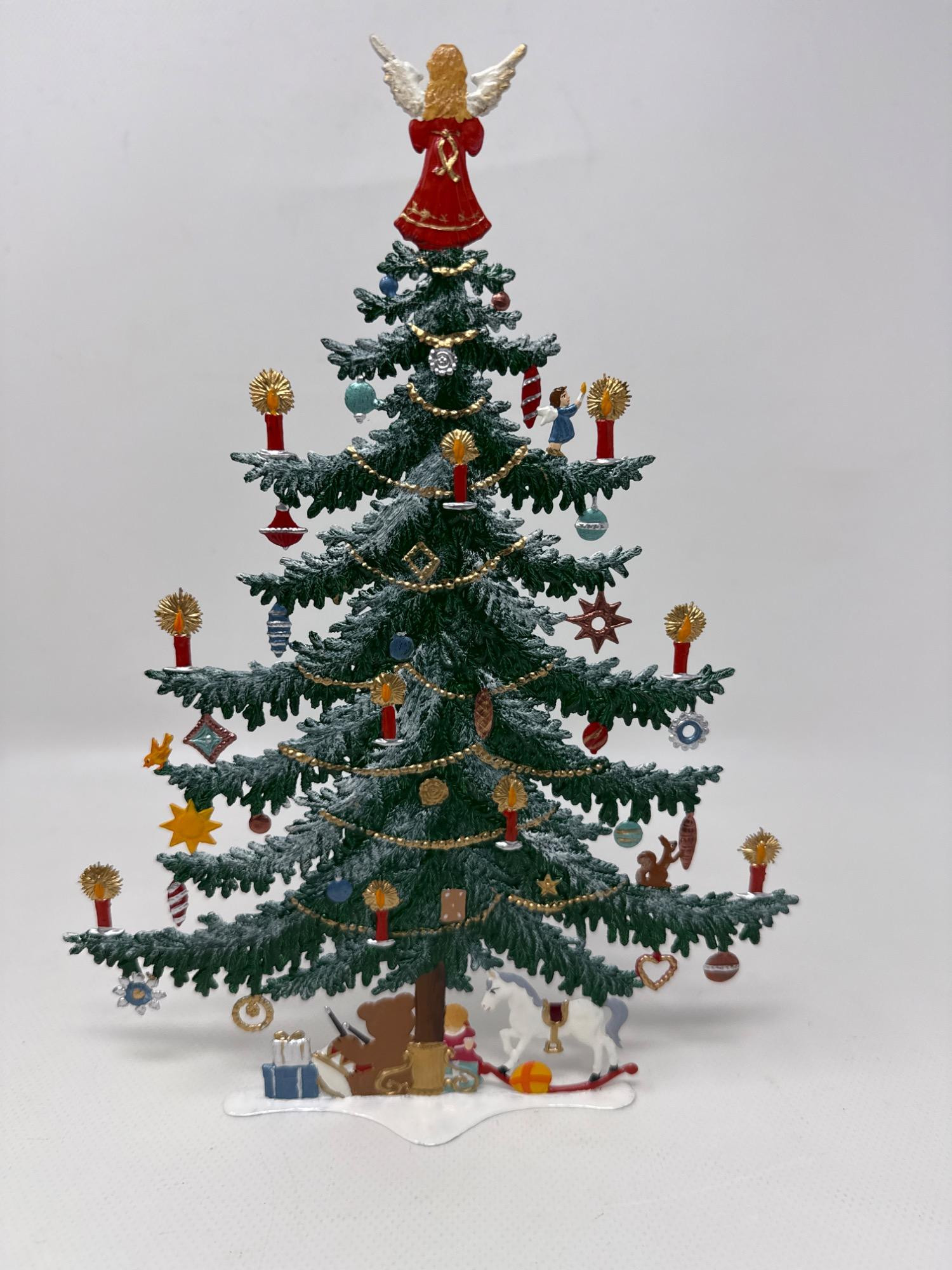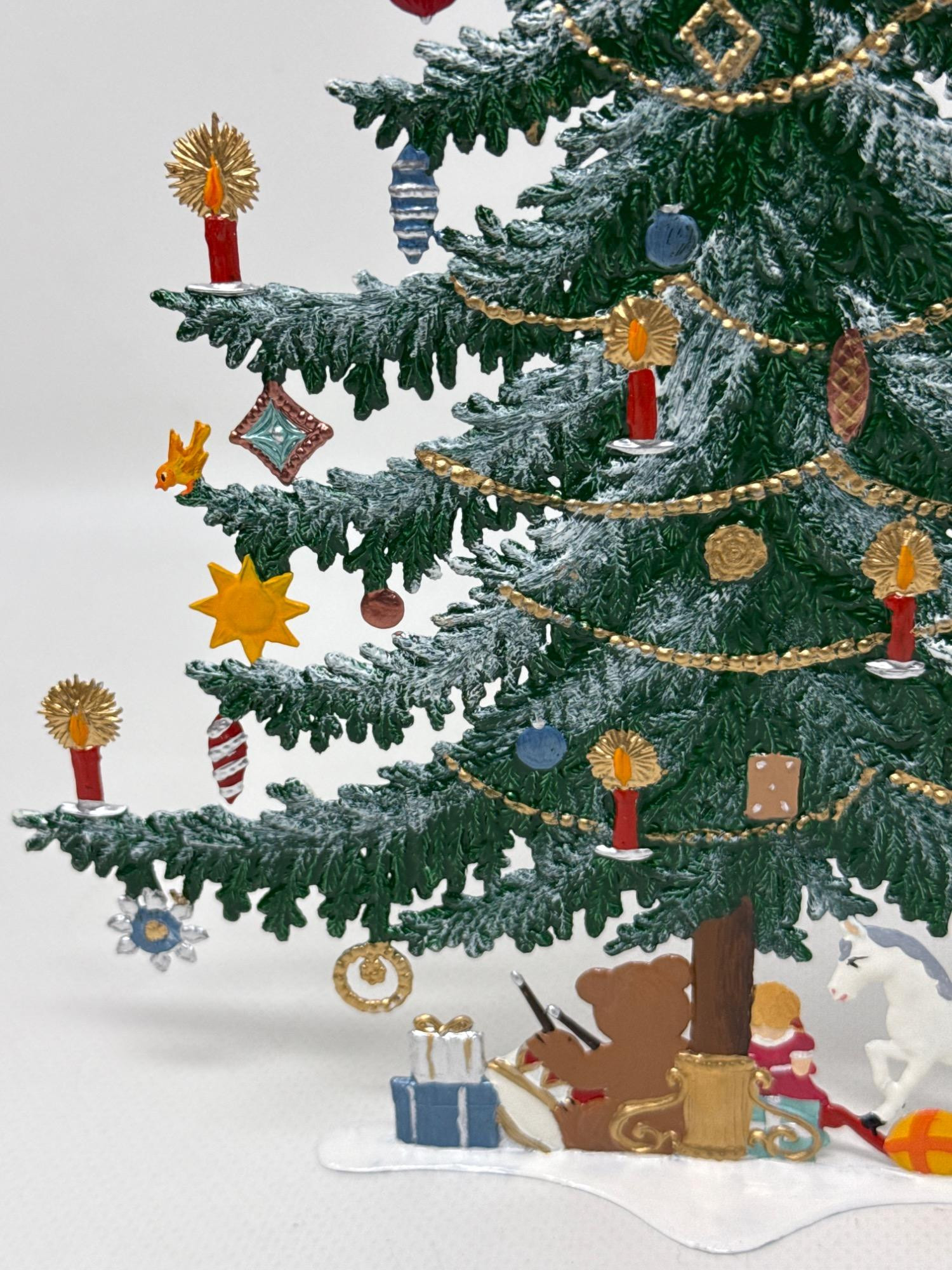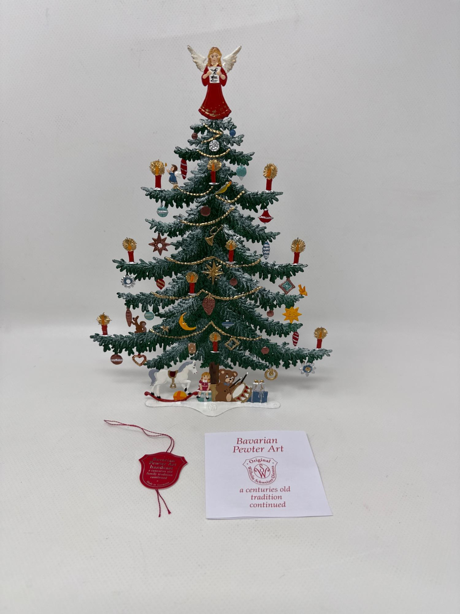 Celebrate the magic of the holidays with this stunning hand-painted Bavarian pewter Christmas tree, crafted by master artisan Wilhelm Schweizer of Diessen, Germany. A beautiful piece of European craftsmanship, perfect for collectors and holiday decorators alike. Details Maker: Wilhelm Schweizer Origin: Diessen, Bavaria, Germany Material: Hand-cast pewter Finish: Hand-painted Dimensions: Approx. 10.5” tall x 7.5” wide Includes: Original Wilhelm Schweizer tag Certificate of authenticity Intricate base scene with toys, gifts, bear, and horse Angel topper and detailed hanging ornaments