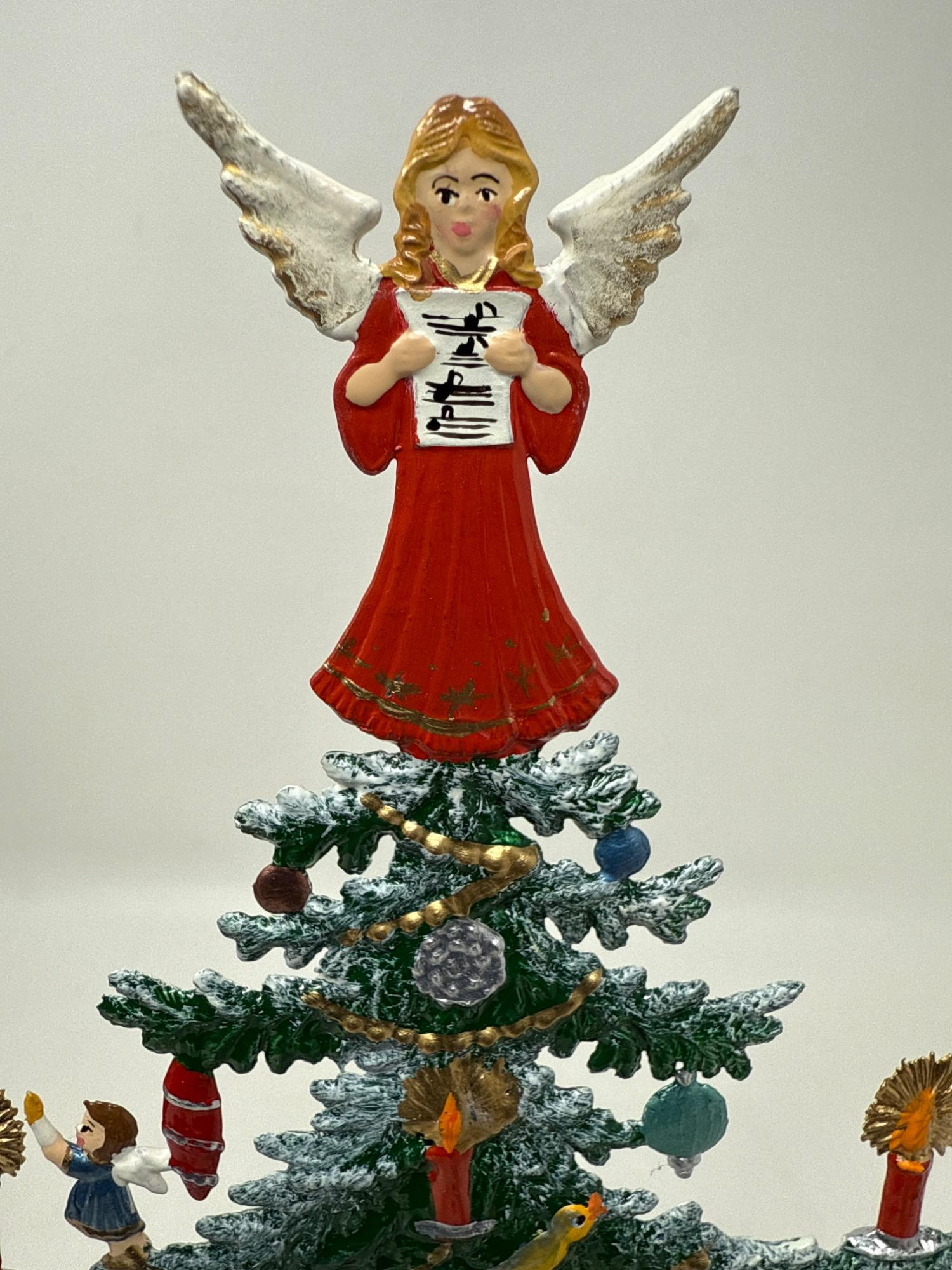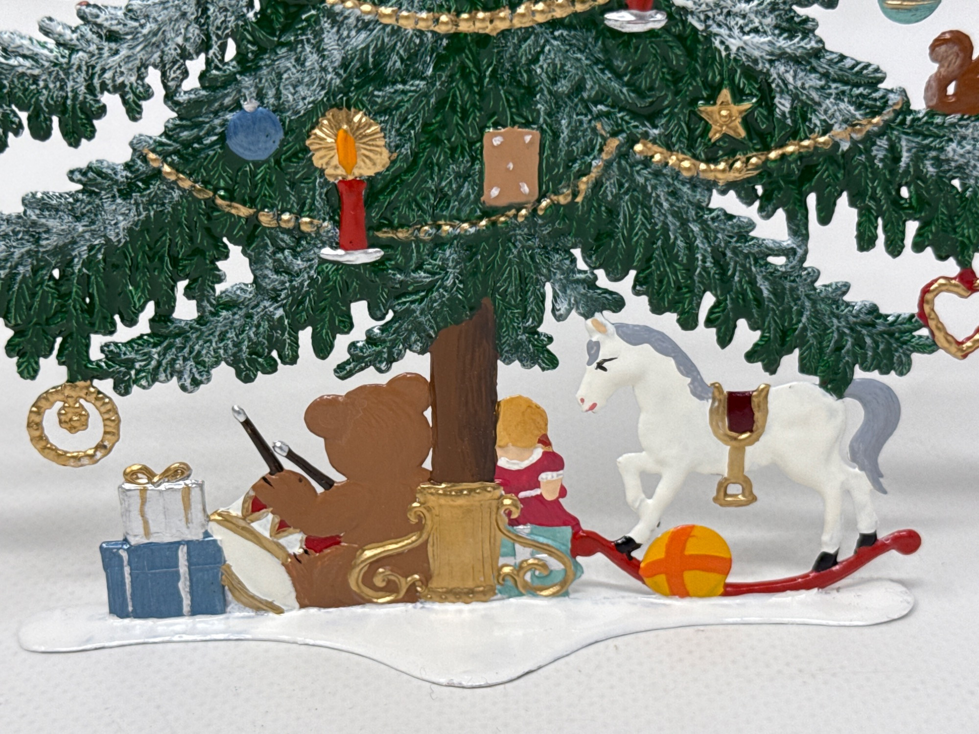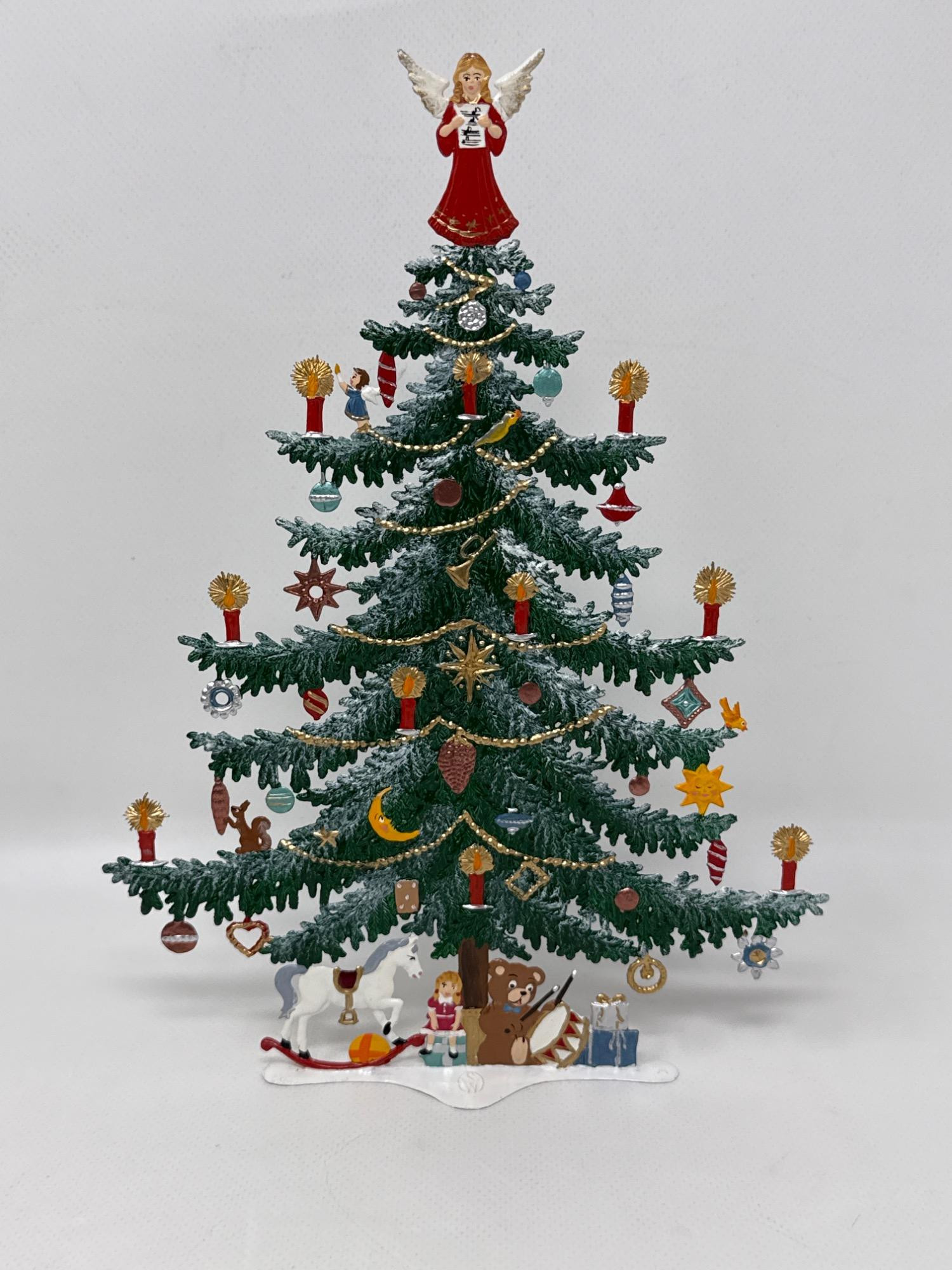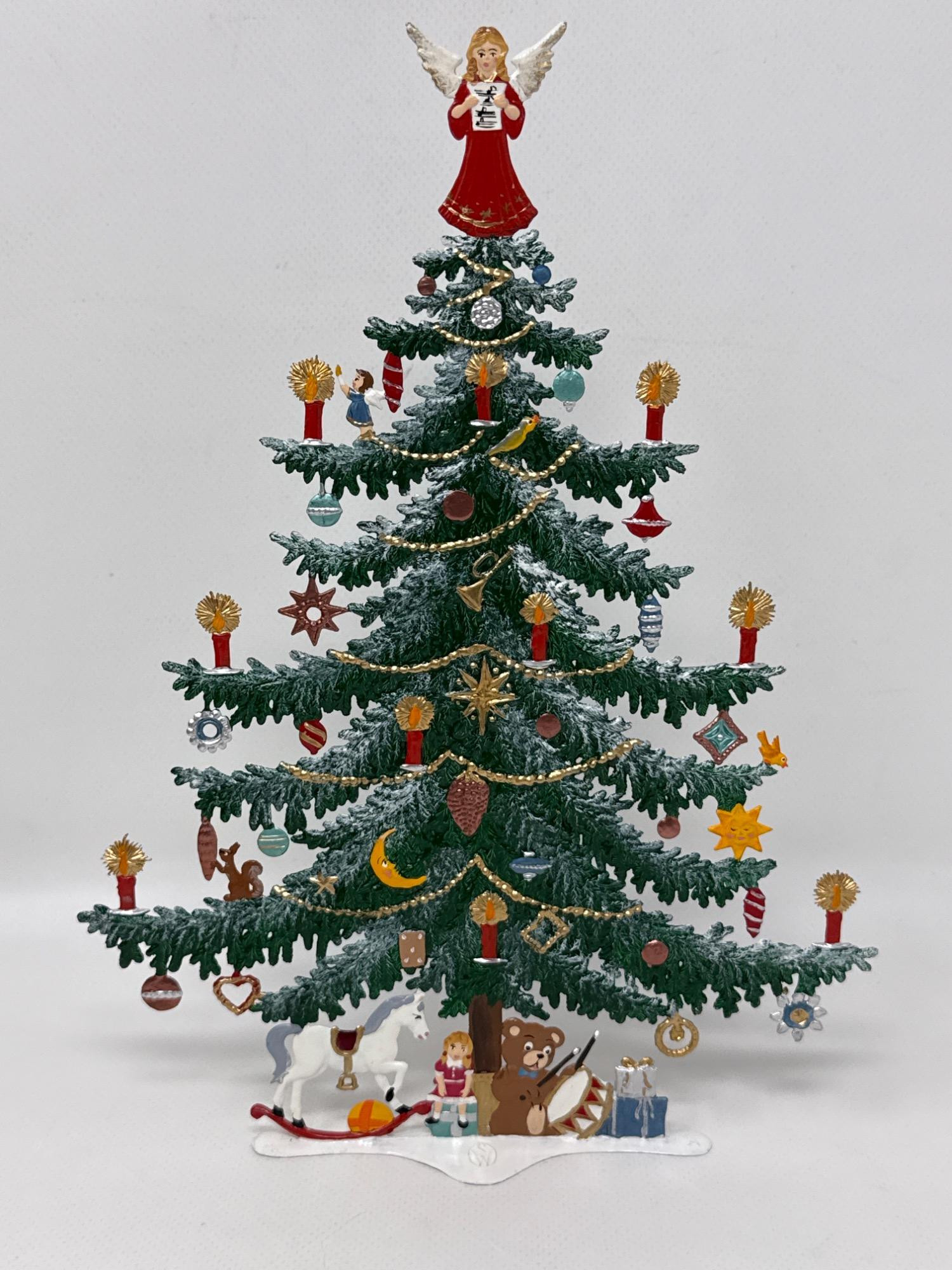 Celebrate the magic of the holidays with this stunning hand-painted Bavarian pewter Christmas tree, crafted by master artisan Wilhelm Schweizer of Diessen, Germany. A beautiful piece of European craftsmanship, perfect for collectors and holiday decorators alike. Details Maker: Wilhelm Schweizer Origin: Diessen, Bavaria, Germany Material: Hand-cast pewter Finish: Hand-painted Dimensions: Approx. 10.5” tall x 7.5” wide Includes: Original Wilhelm Schweizer tag Certificate of authenticity Intricate base scene with toys, gifts, bear, and horse Angel topper and detailed hanging ornaments