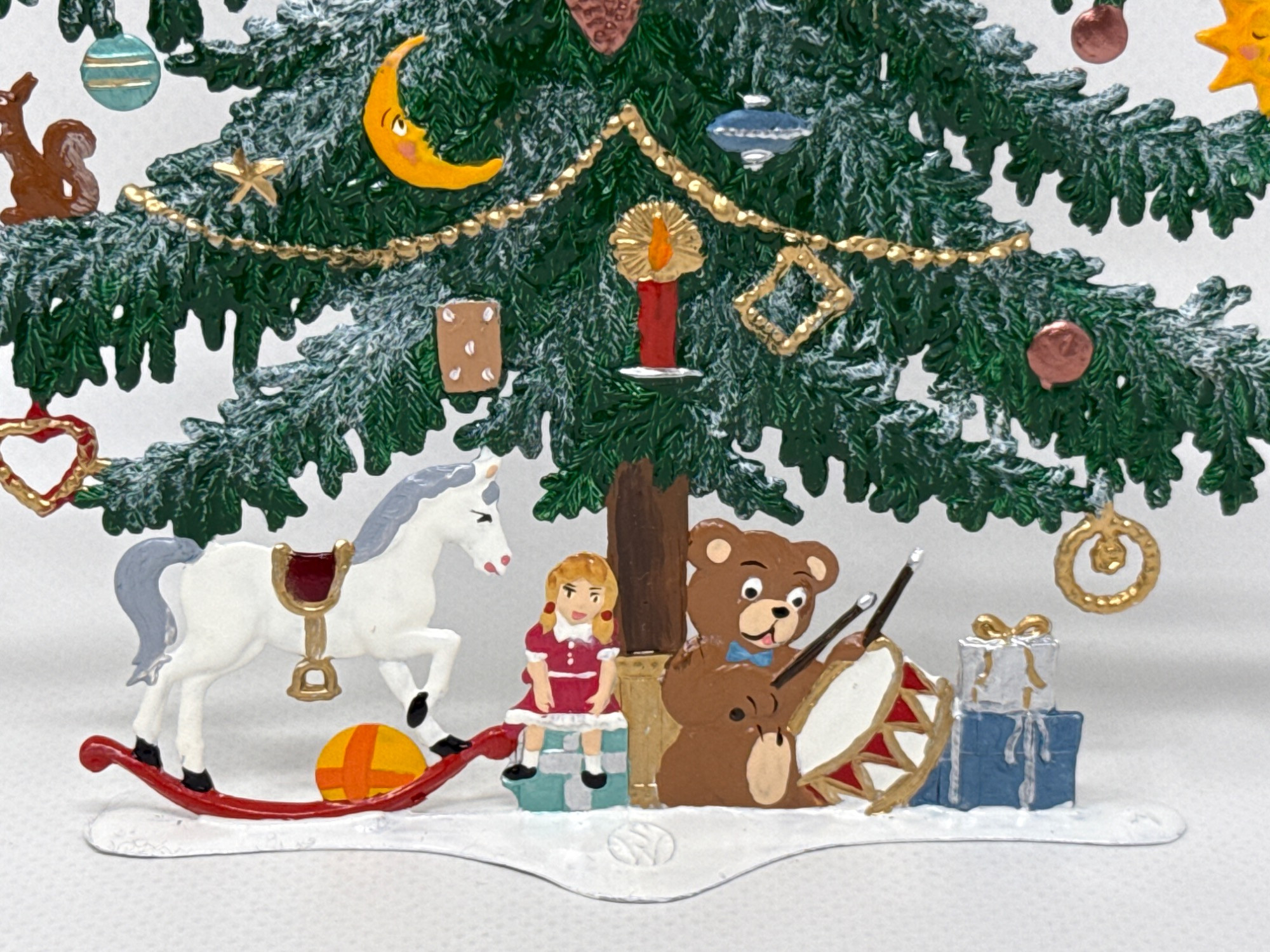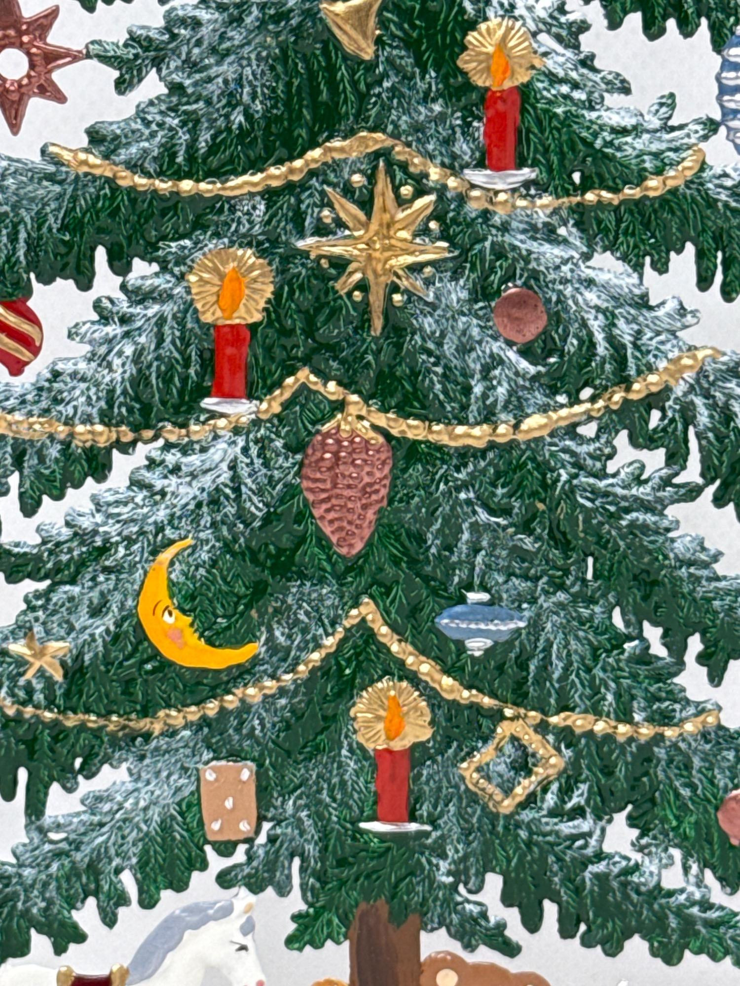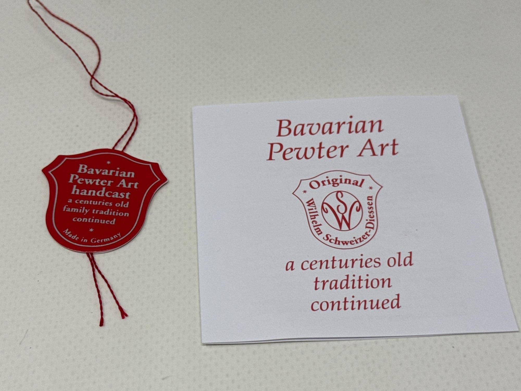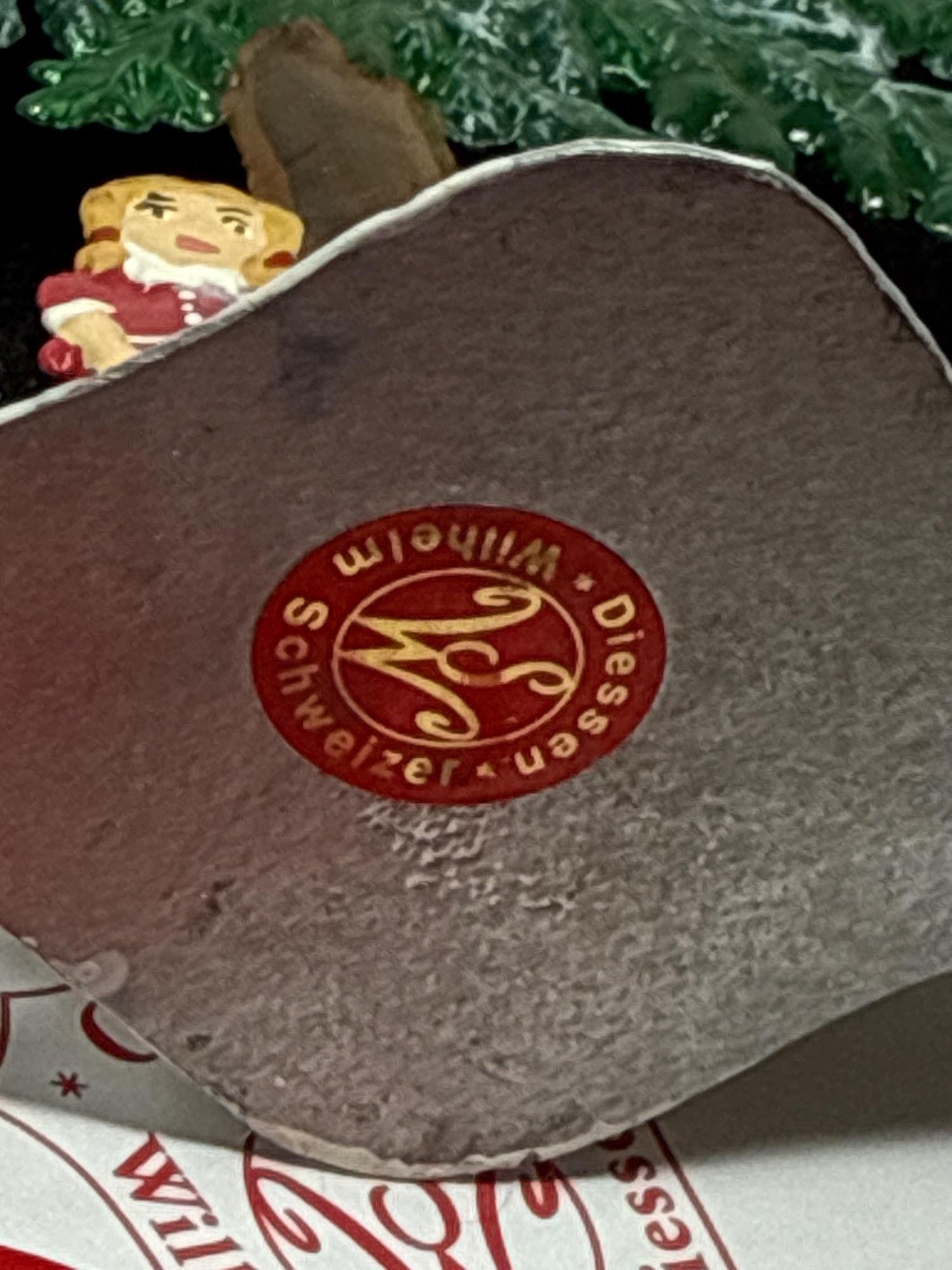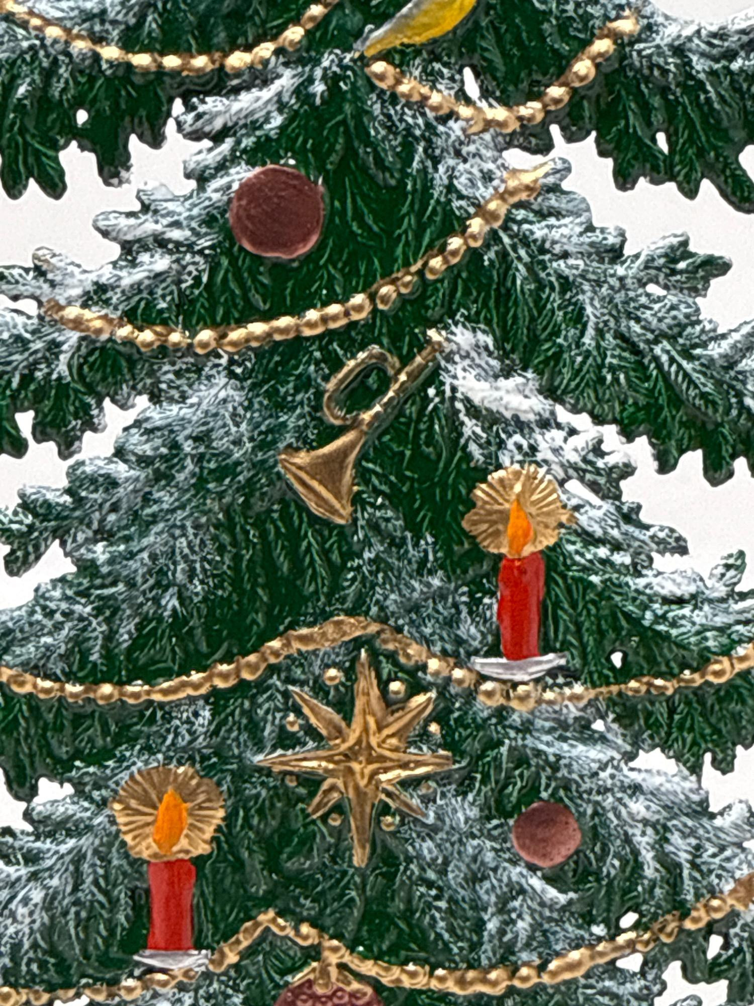 Celebrate the magic of the holidays with this stunning hand-painted Bavarian pewter Christmas tree, crafted by master artisan Wilhelm Schweizer of Diessen, Germany. A beautiful piece of European craftsmanship, perfect for collectors and holiday decorators alike. Details Maker: Wilhelm Schweizer Origin: Diessen, Bavaria, Germany Material: Hand-cast pewter Finish: Hand-painted Dimensions: Approx. 10.5” tall x 7.5” wide Includes: Original Wilhelm Schweizer tag Certificate of authenticity Intricate base scene with toys, gifts, bear, and horse Angel topper and detailed hanging ornaments