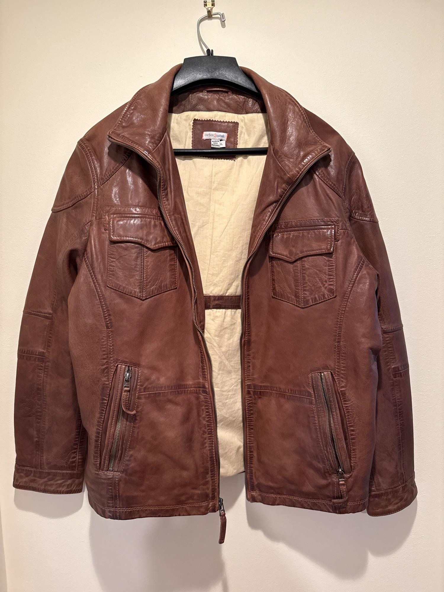 Elevate your outerwear game with this rugged and stylish Carbon2Cobalt genuine leather jacket in a rich reddish-brown hue. Designed for comfort and built to last, this extra-large jacket features: Soft, broken-in leather exterior with a naturally worn finish Four front pockets (two zippered hand pockets, two snap chest pockets) Cozy light tan interior lining with inner zip and slip pockets for added utility Full front zip closure with additional inner button strap for security Classic stand collar that can be folded down or zipped up for warmth Size: XL (see inner tag) Made in India | RN# 129641