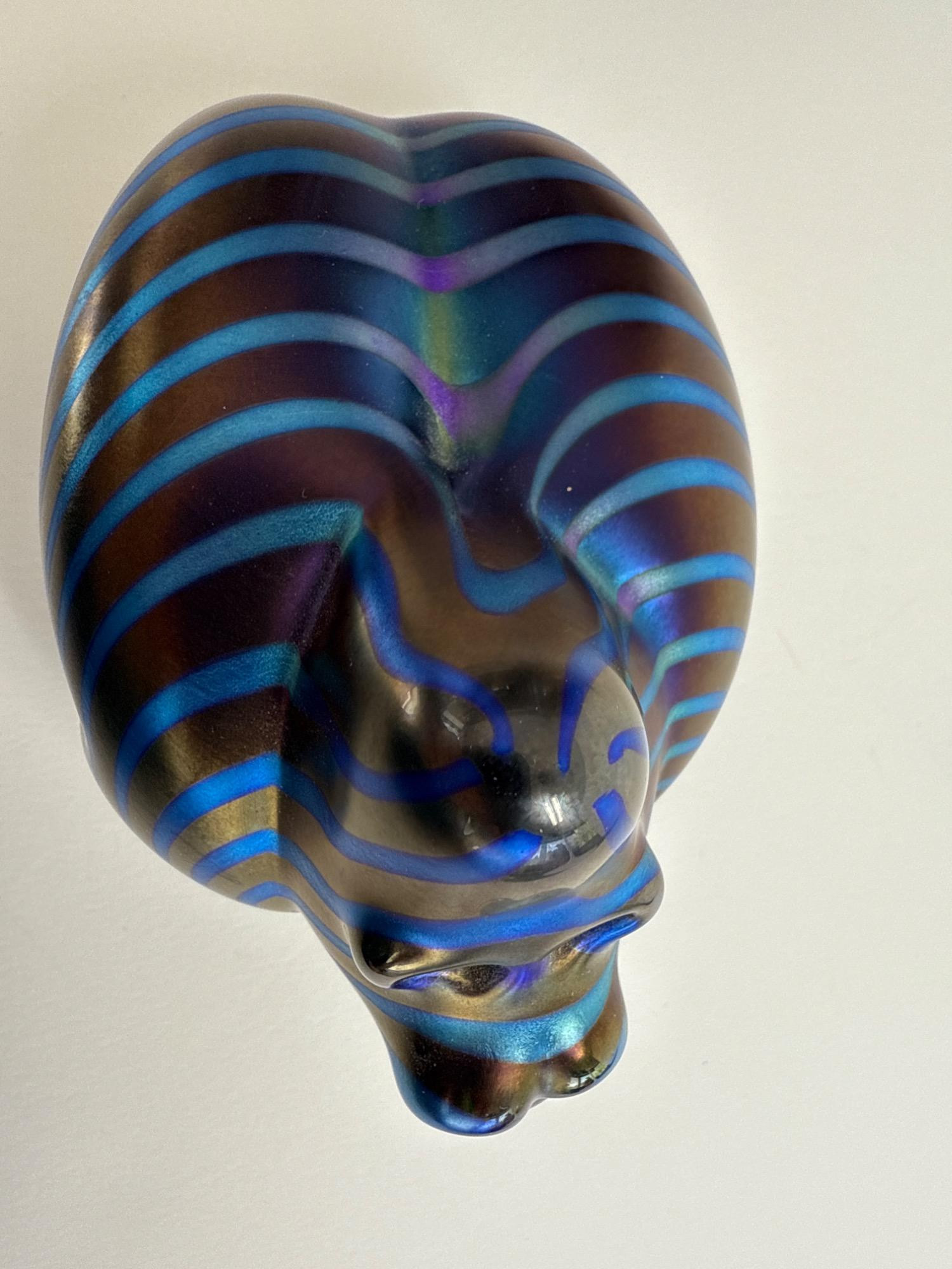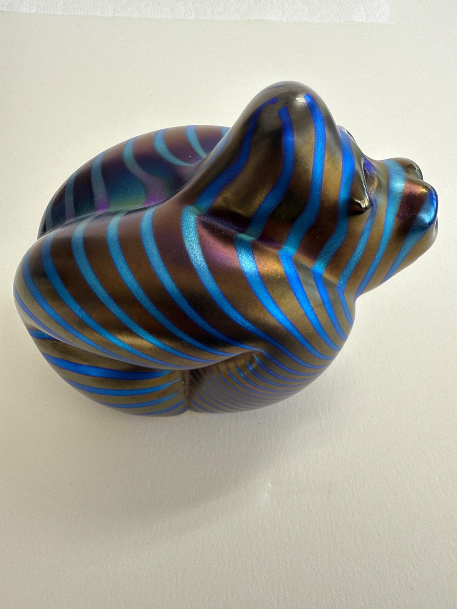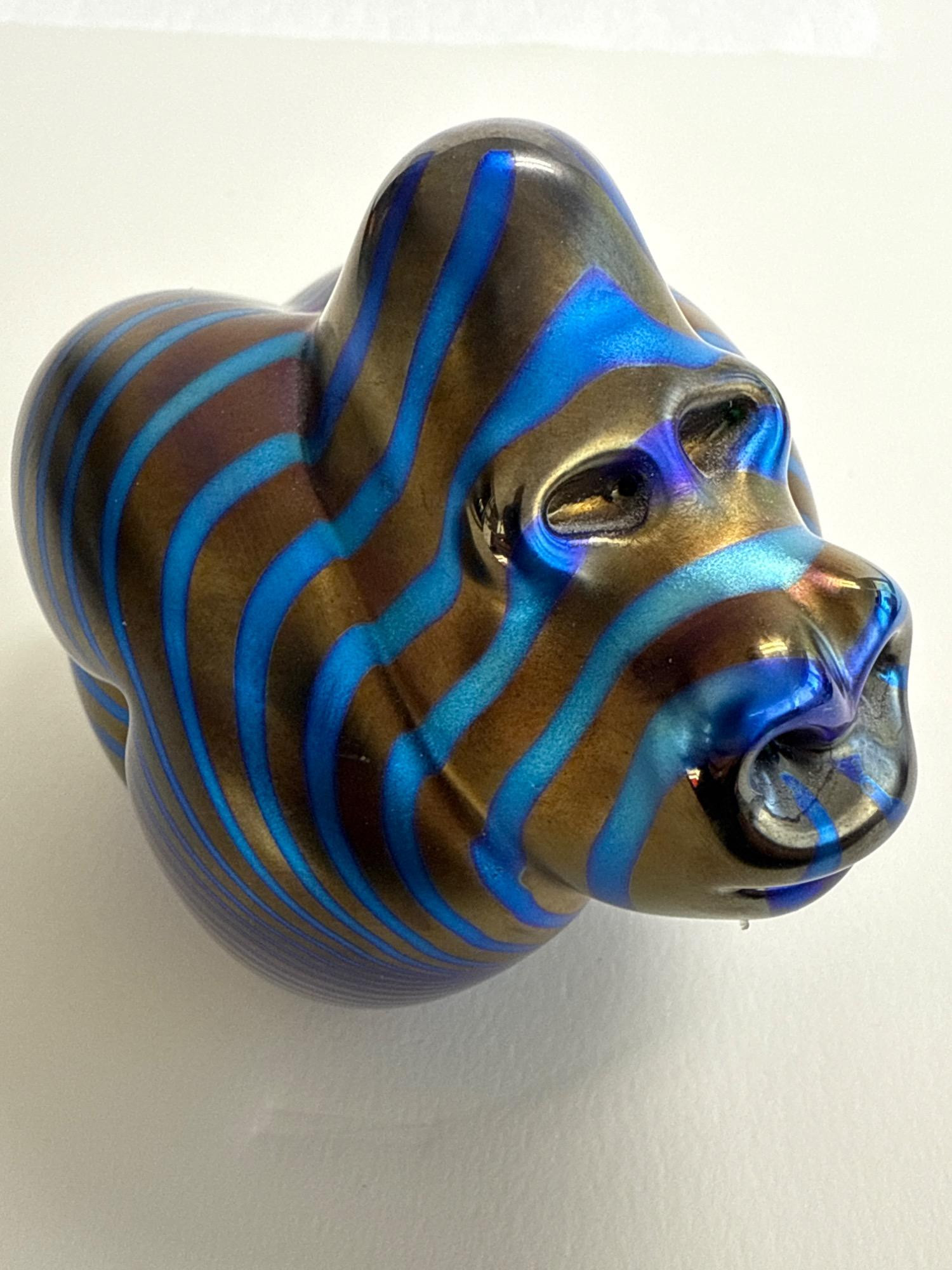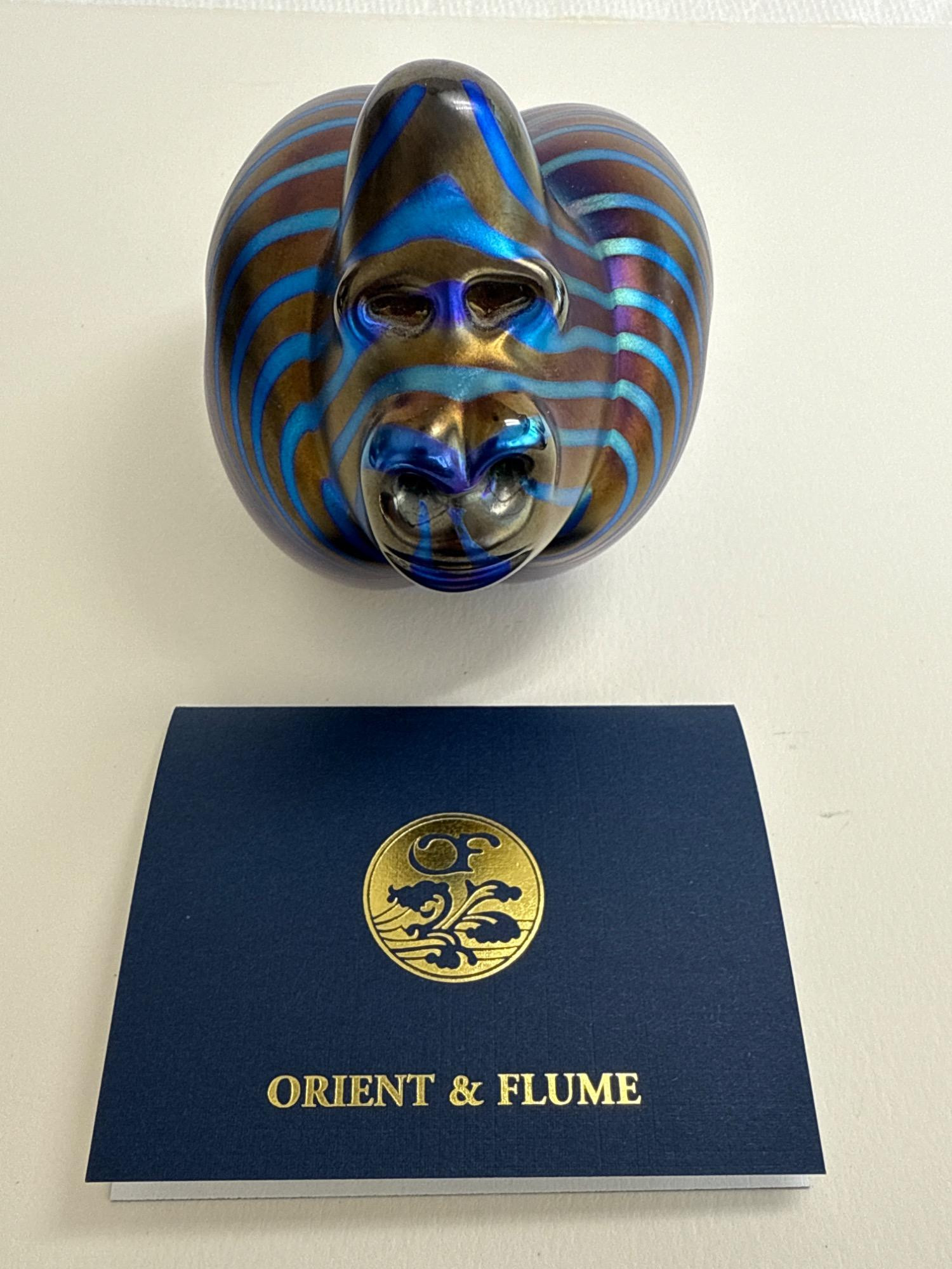 This stunning handcrafted glass sculpture from Orient & Flume captures the raw power and beauty of a gorilla with a modern electric twist. Known as the “Electric Gorilla,” this captivating piece shimmers with iridescent stripes in bold shades of electric blue and bronze—an eye-catching testament to the renowned craftsmanship of this California-based studio. Signed: "Orient & Flume" and “Castor” (Artist)