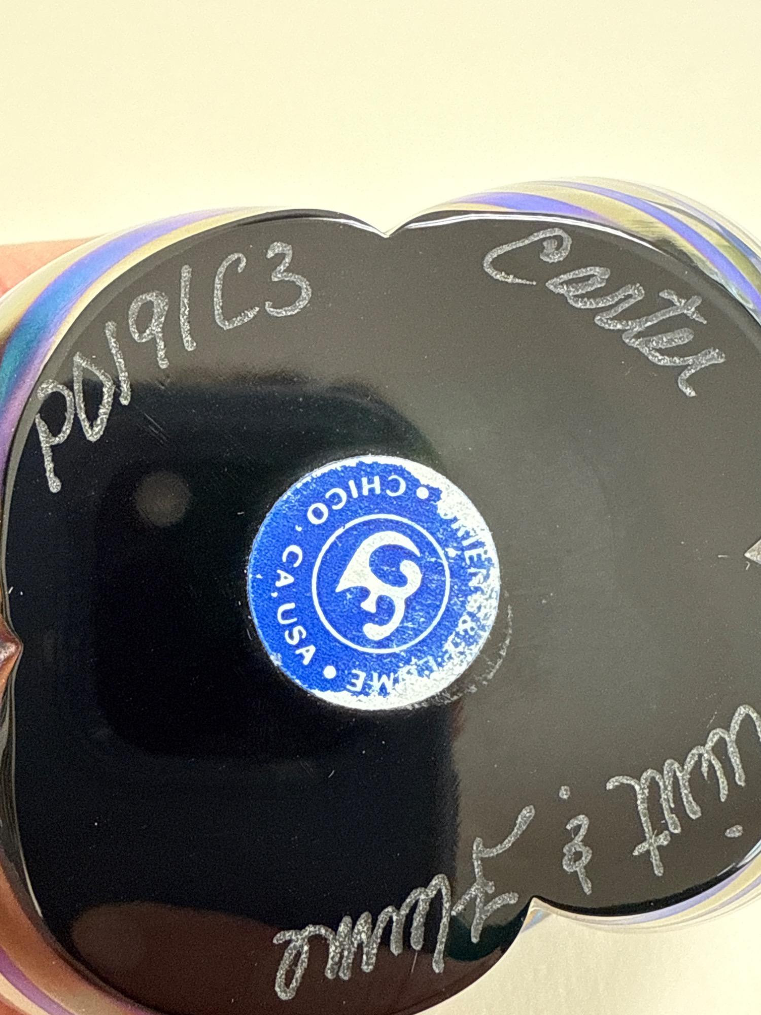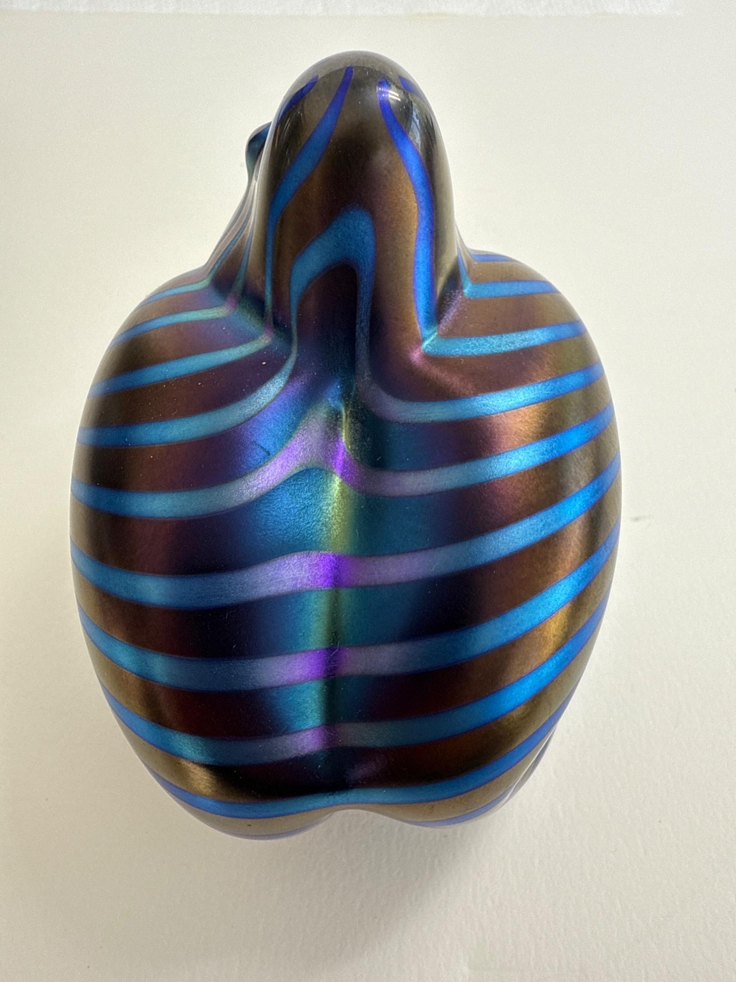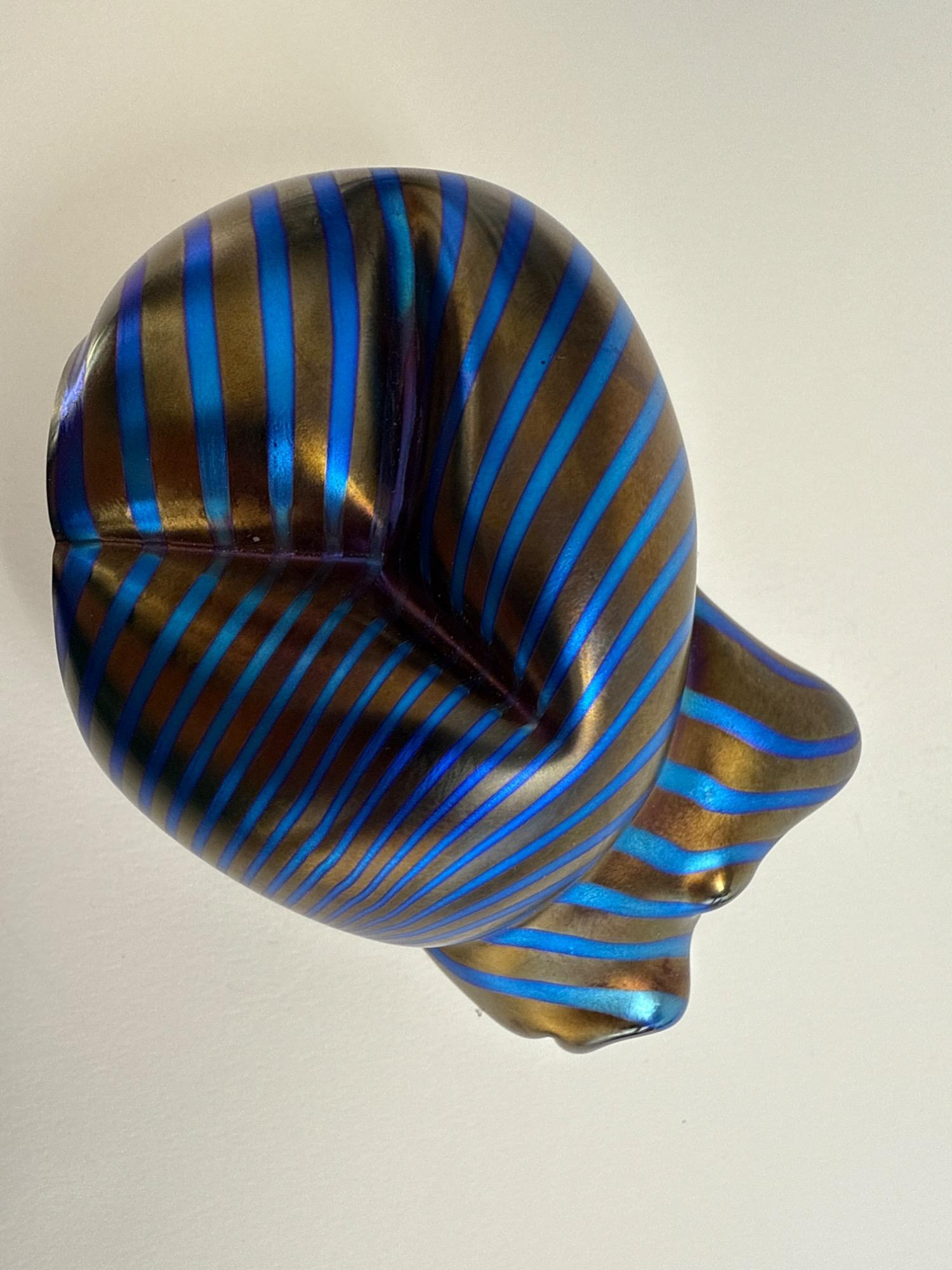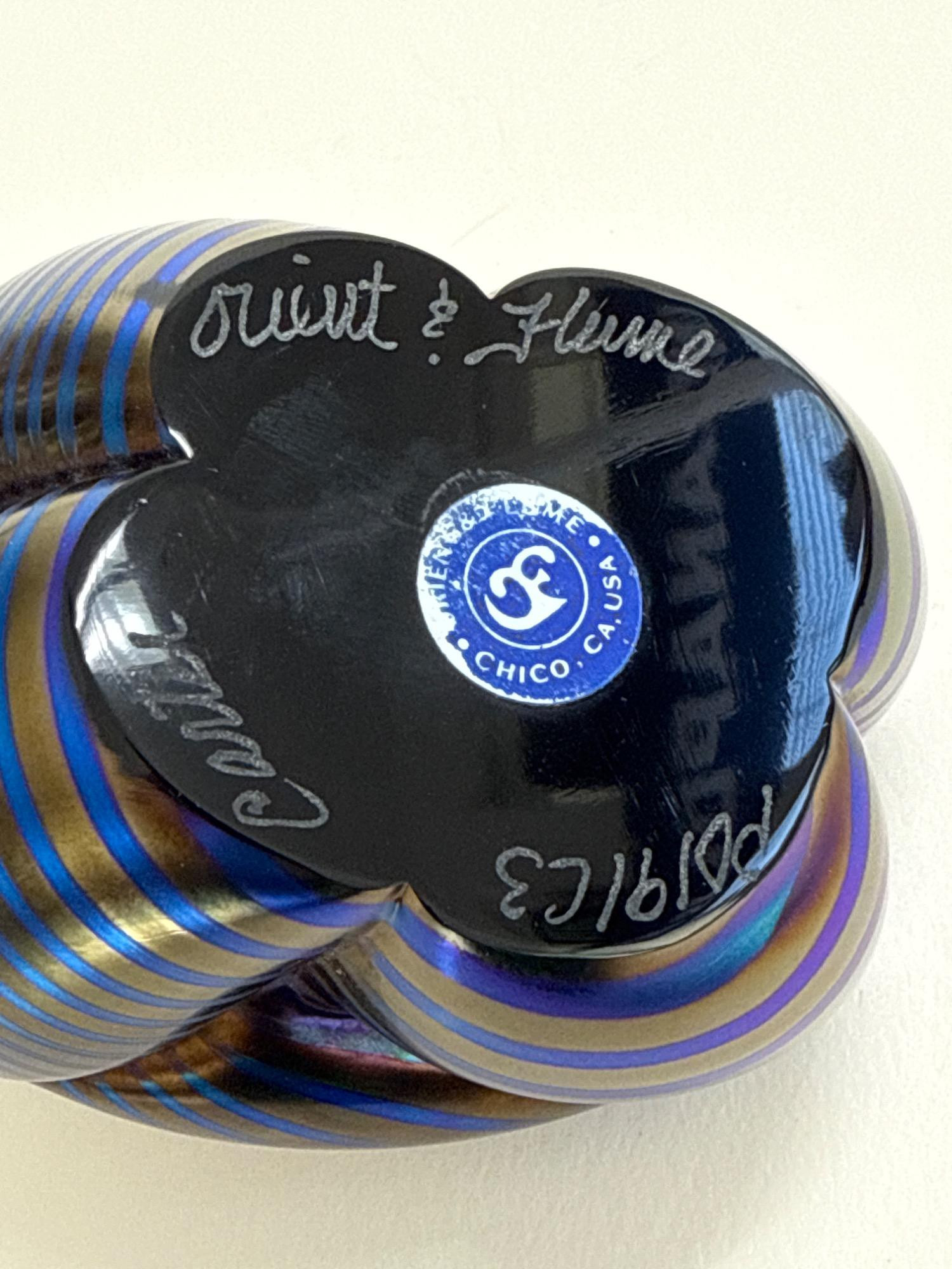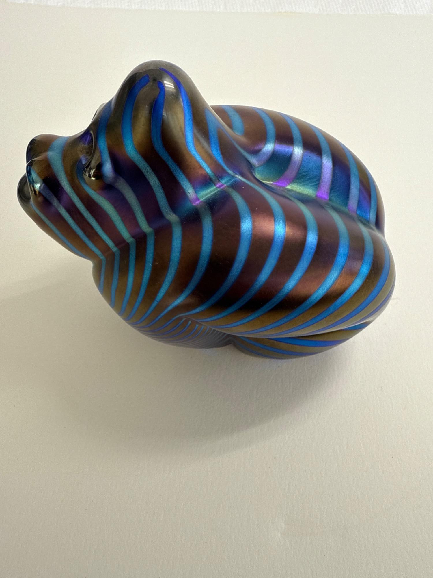 This stunning handcrafted glass sculpture from Orient & Flume captures the raw power and beauty of a gorilla with a modern electric twist. Known as the “Electric Gorilla,” this captivating piece shimmers with iridescent stripes in bold shades of electric blue and bronze—an eye-catching testament to the renowned craftsmanship of this California-based studio. Signed: "Orient & Flume" and “Castor” (Artist)