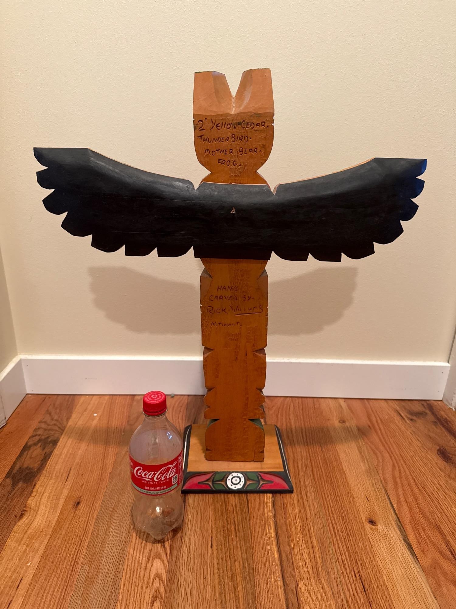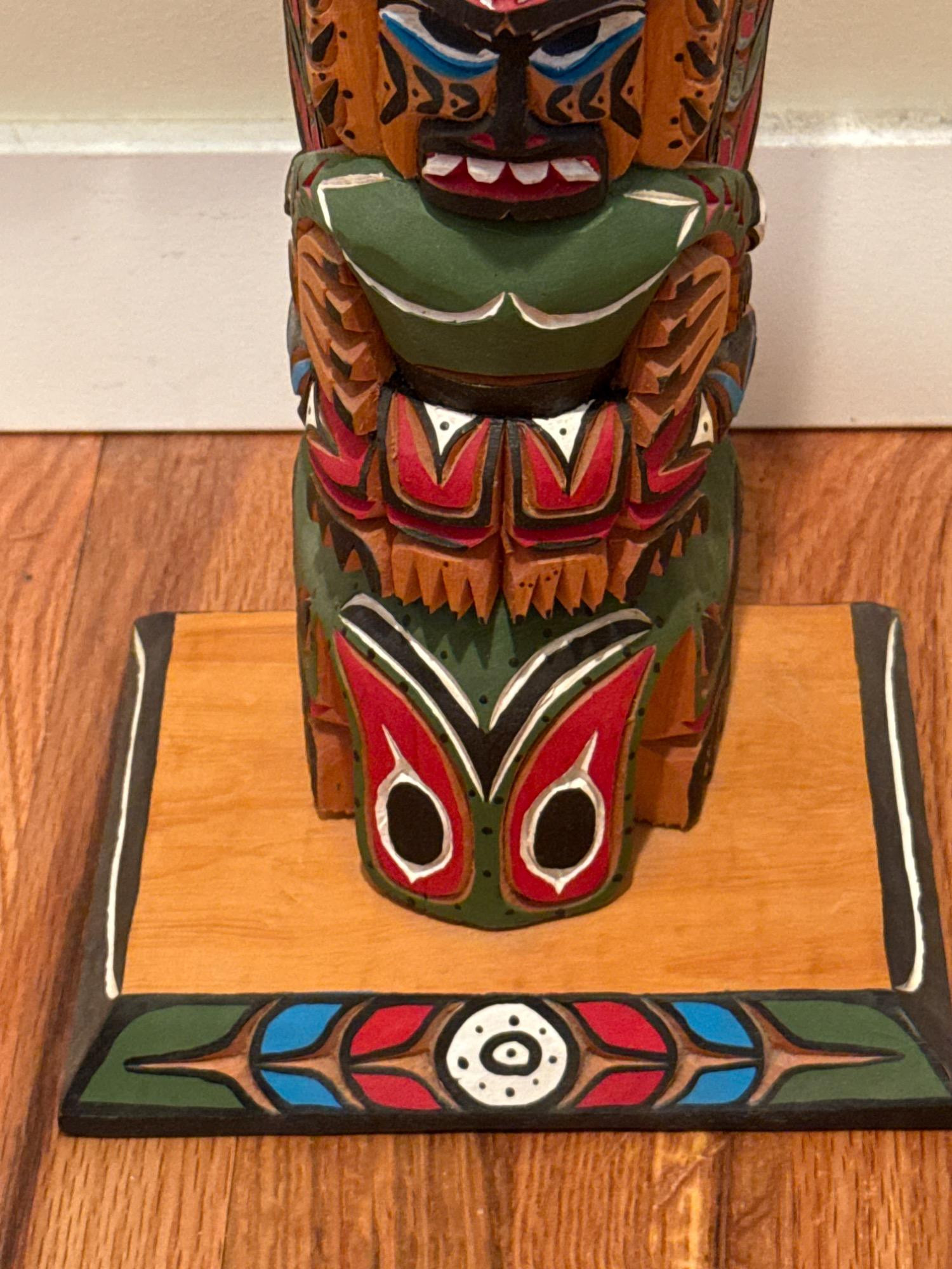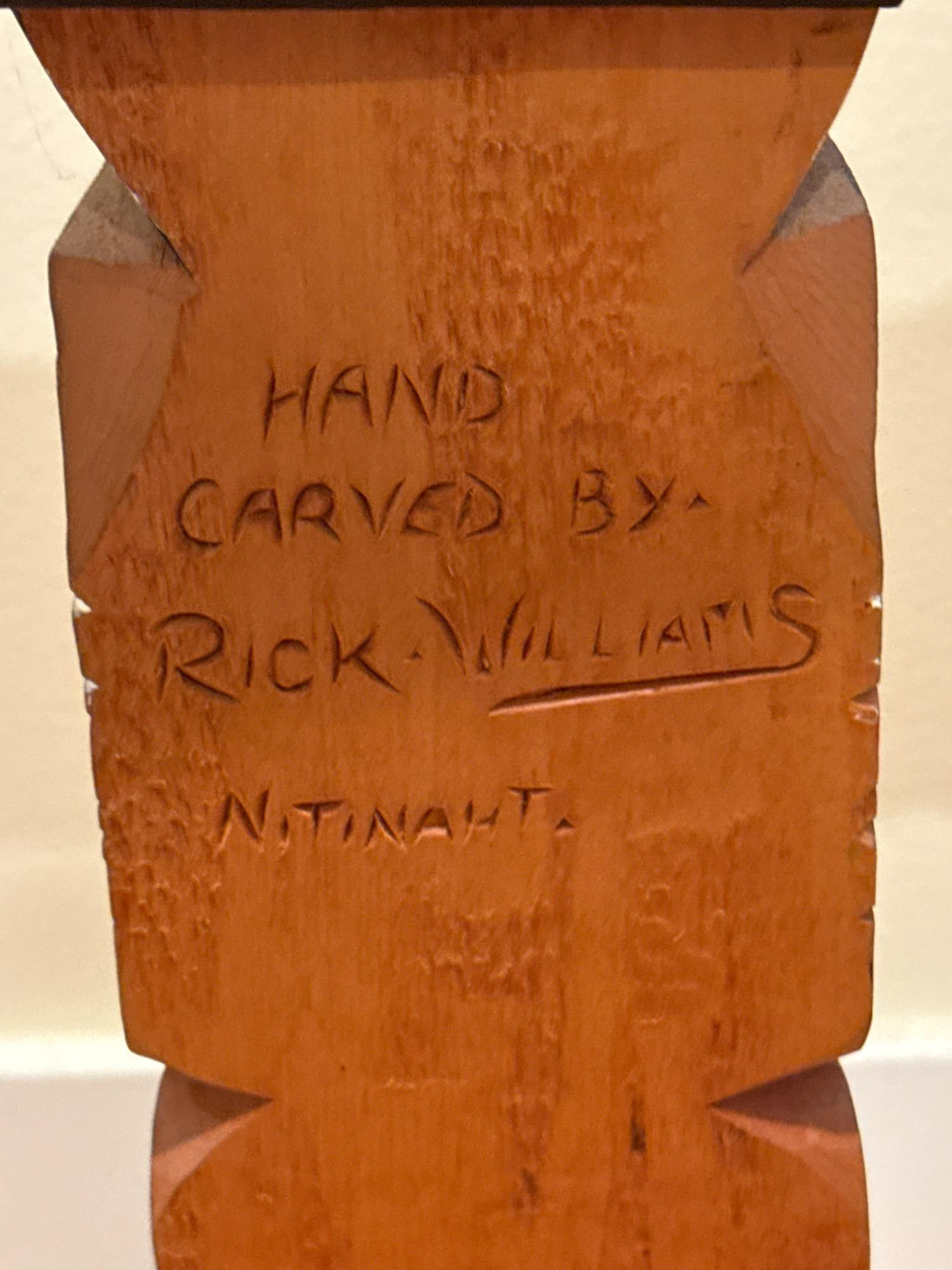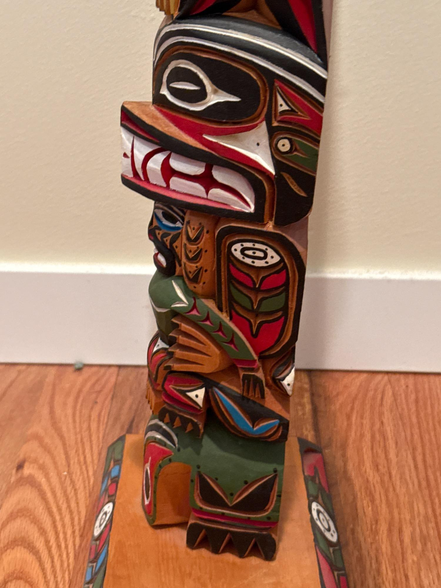 A striking, one-of-a-kind hand-carved totem pole by Rick Williams, Indigenous artist from the Nuu-chah-nulth First Nation (Nitinaht, British Columbia). Expertly crafted from yellow cedar, this piece features traditional figures, each rich in cultural symbolism: Featured Figures: Thunderbird – Power, strength, and protection Mother Bear – Nurturing, courage, and motherhood Frog – Transformation, communication, and connection between worlds Details: Material: Yellow Cedar Paint: Hand-painted in vibrant traditional colors Inscription (reverse): Display Base: Sturdy, painted wood Dimensions: Approx. 24" H x 19" W