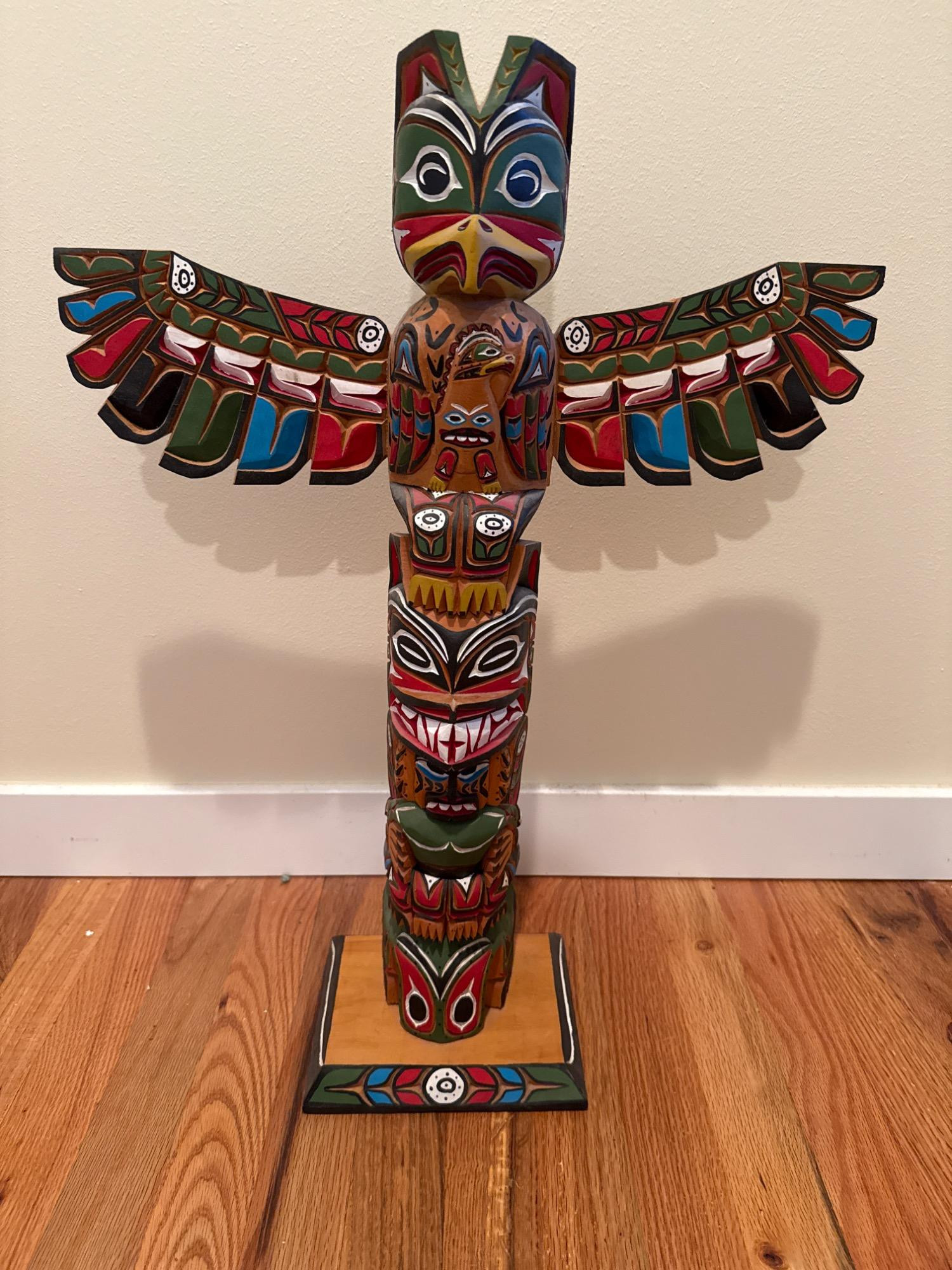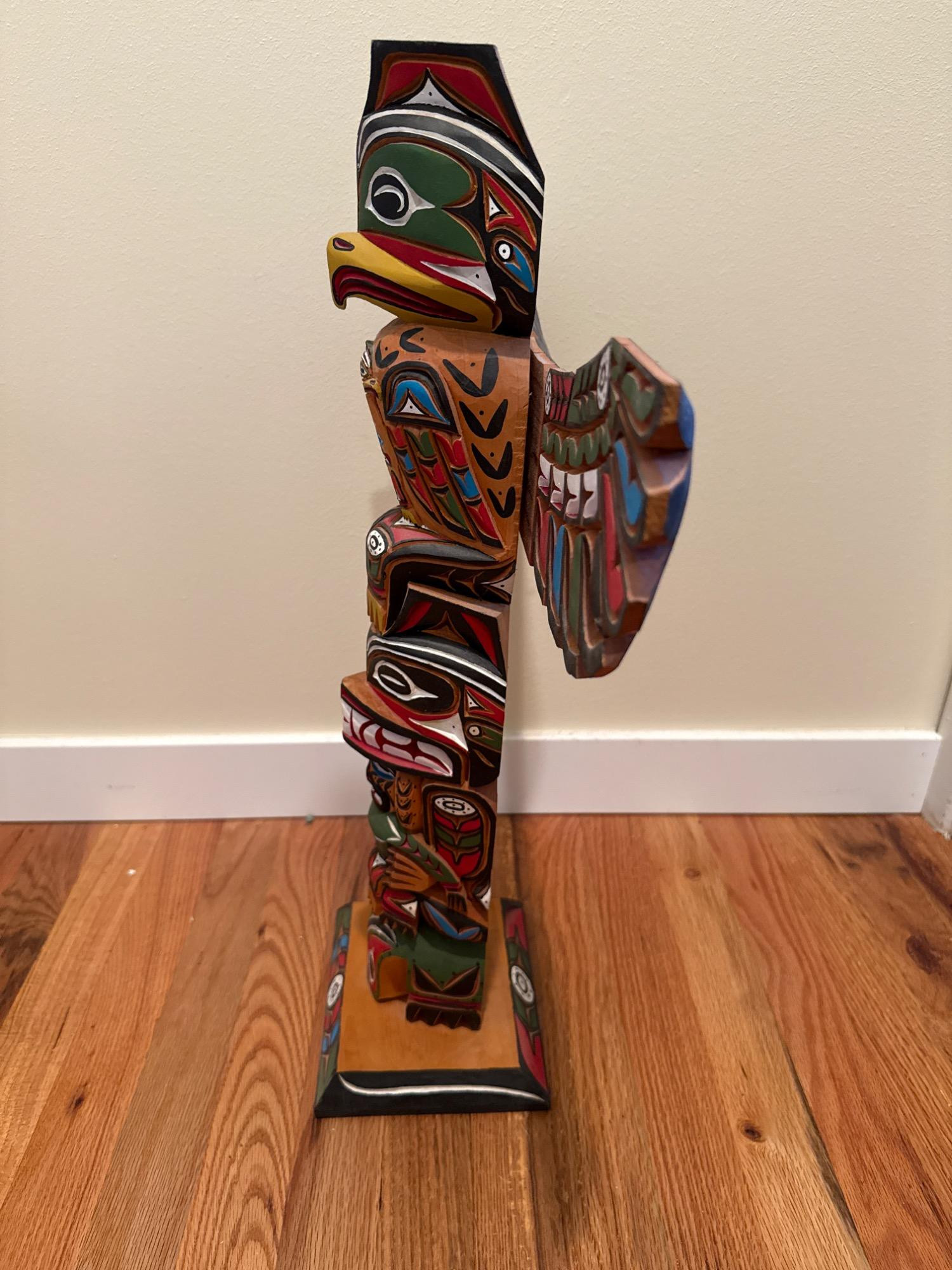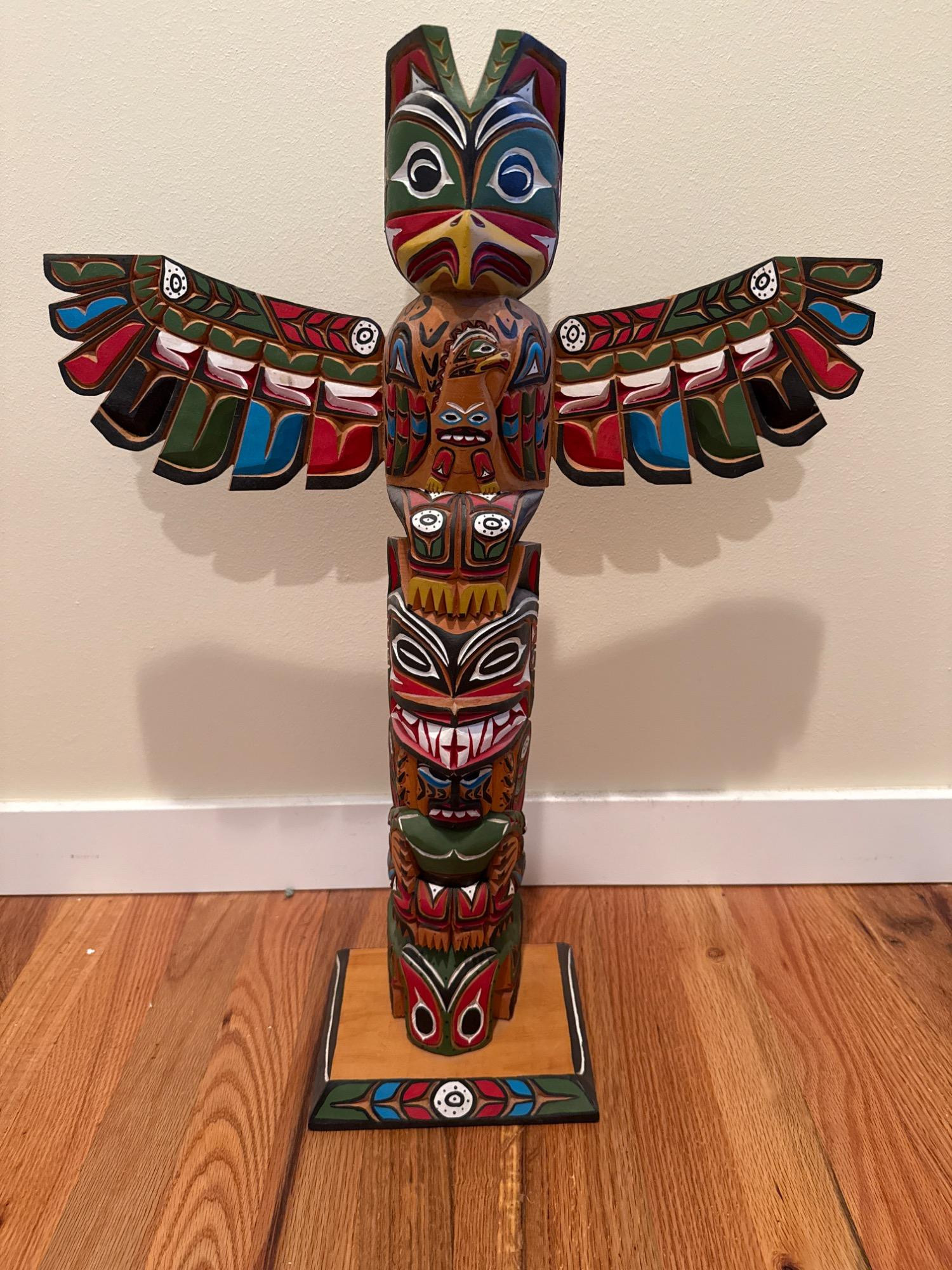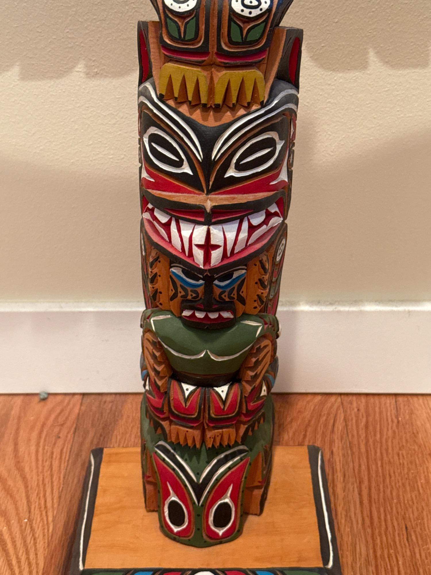 A striking, one-of-a-kind hand-carved totem pole by Rick Williams, Indigenous artist from the Nuu-chah-nulth First Nation (Nitinaht, British Columbia). Expertly crafted from yellow cedar, this piece features traditional figures, each rich in cultural symbolism: Featured Figures: Thunderbird – Power, strength, and protection Mother Bear – Nurturing, courage, and motherhood Frog – Transformation, communication, and connection between worlds Details: Material: Yellow Cedar Paint: Hand-painted in vibrant traditional colors Inscription (reverse): Display Base: Sturdy, painted wood Dimensions: Approx. 24" H x 19" W