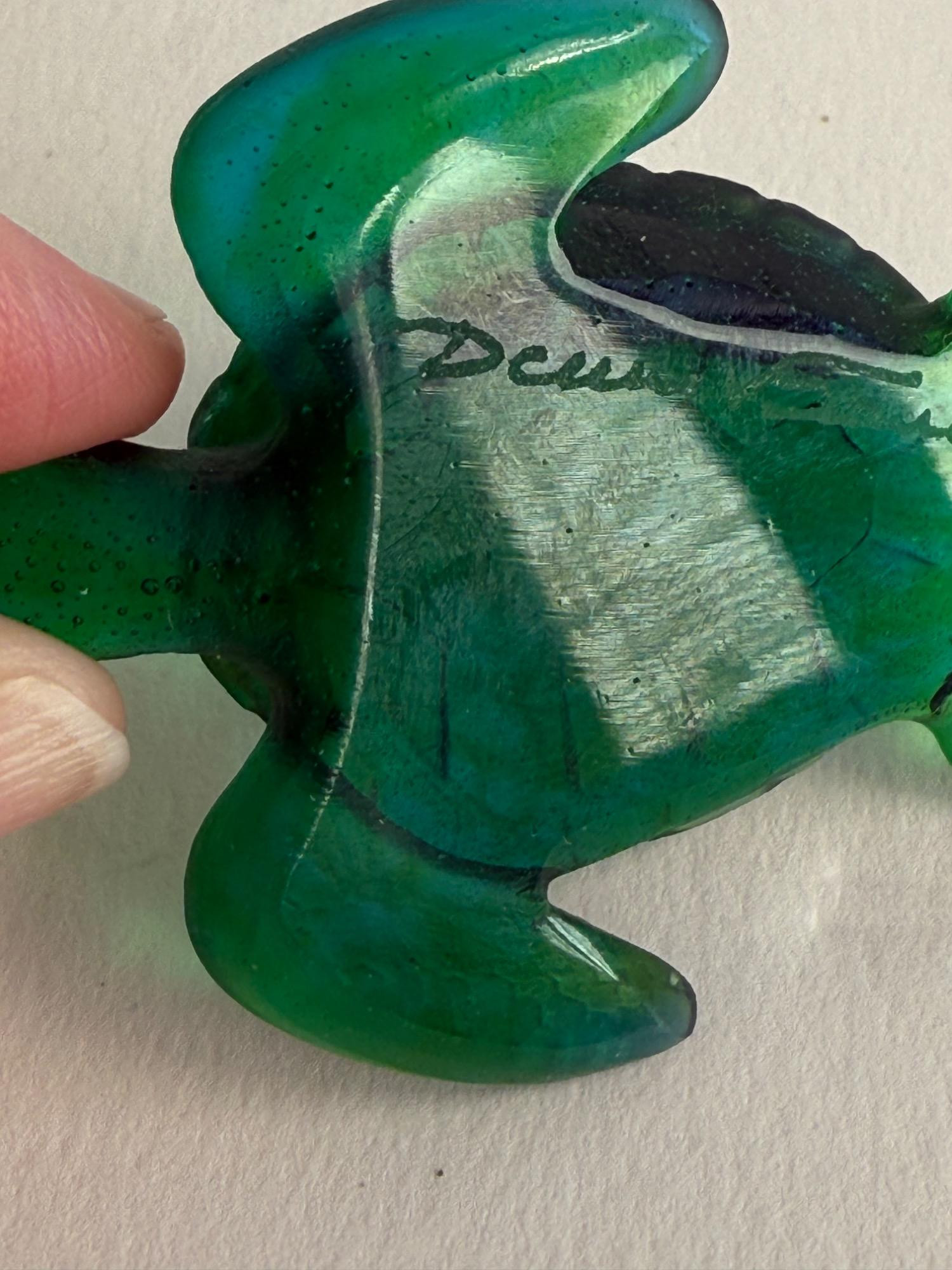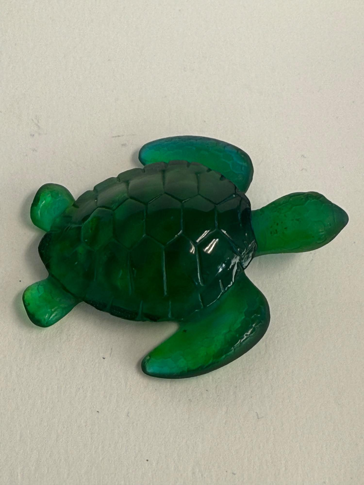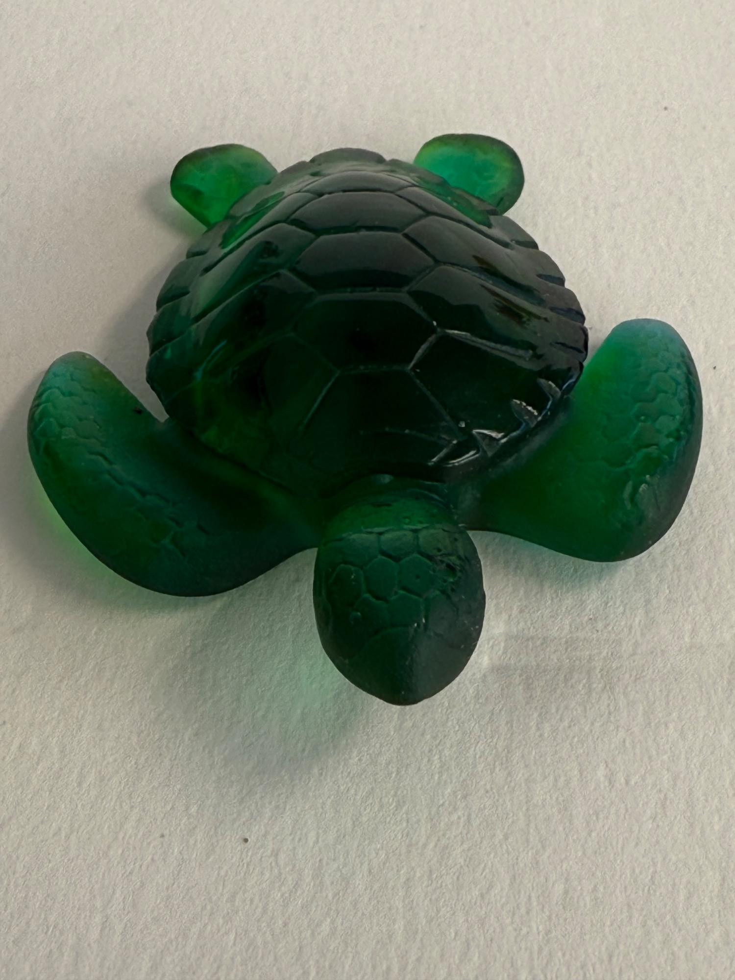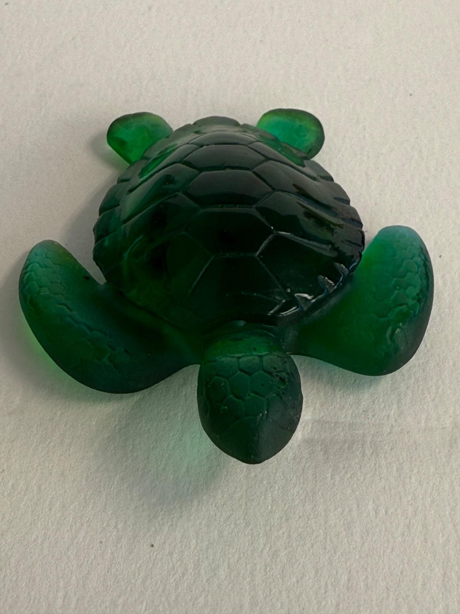 A beautifully crafted art glass turtle by the renowned French glassmaker Daum. This piece is signed and showcases the brand’s signature pâte de verre technique, producing rich coloration and stunning depth. The turtle features a deep emerald green body with delicate shell and flipper detailing, giving it a lifelike yet artistic appearance. Dimensions: 2.5 inches long x 2 inches wide Material: Pâte de verre Color: Deep emerald green with translucent and opaque tones Signature: Etched “Daum France” on the underside Origin: Made in France