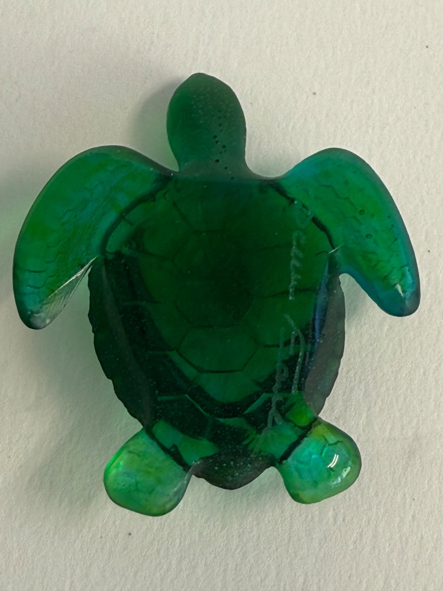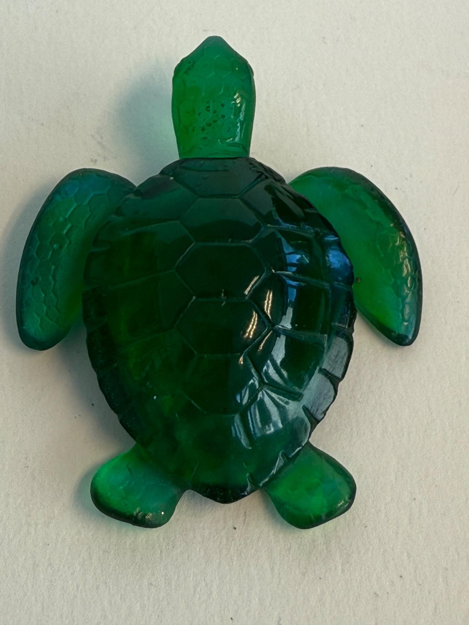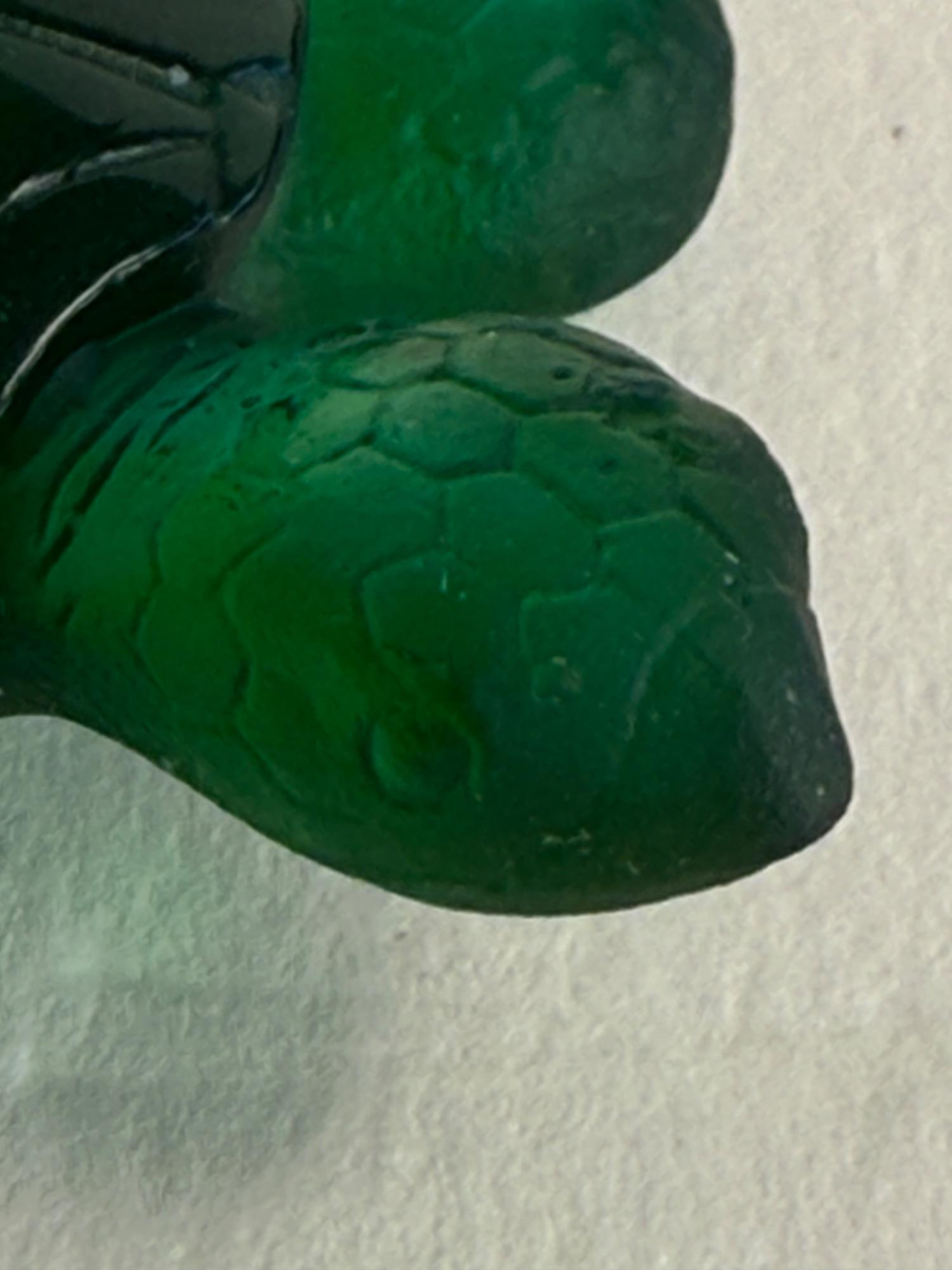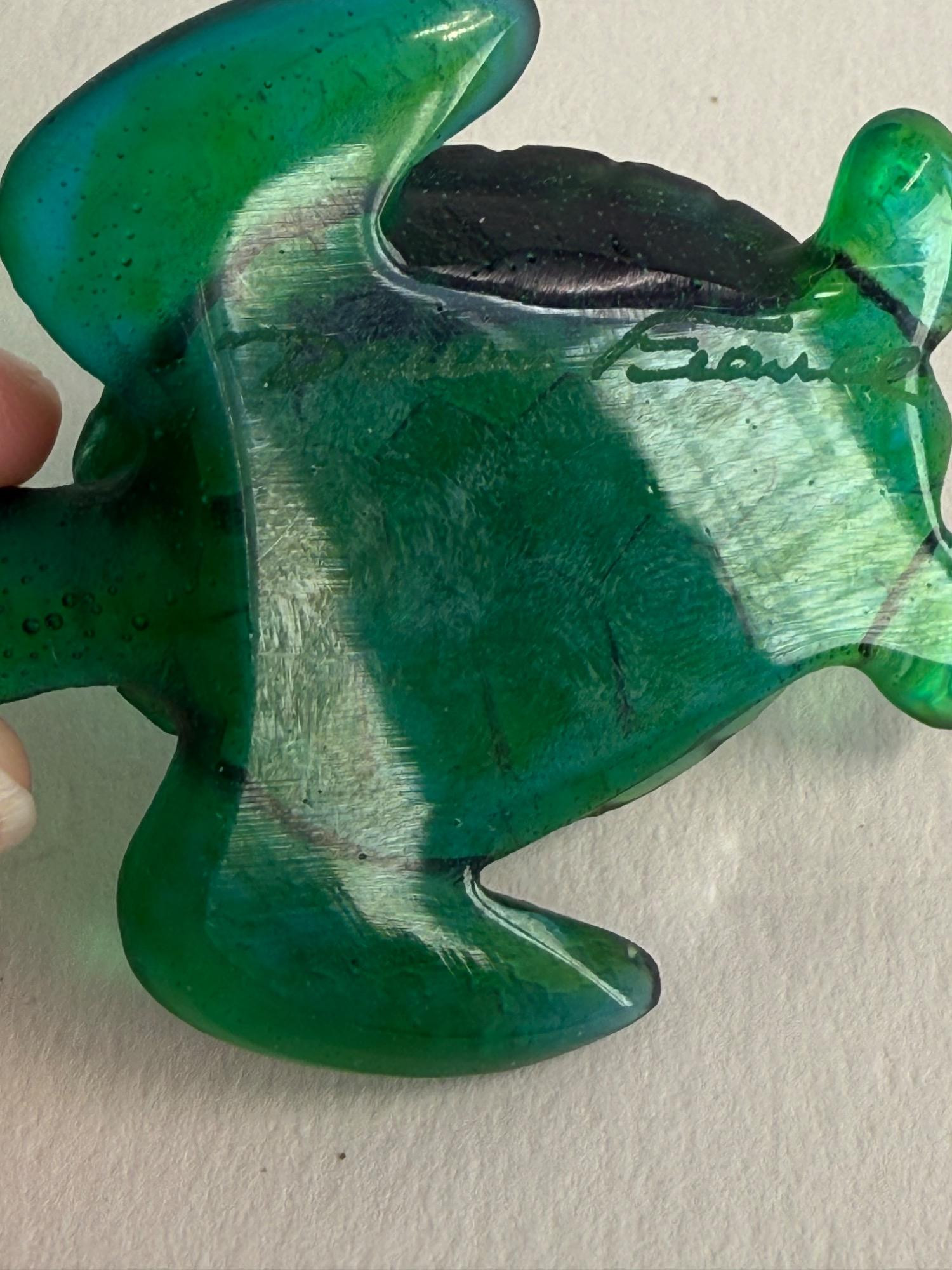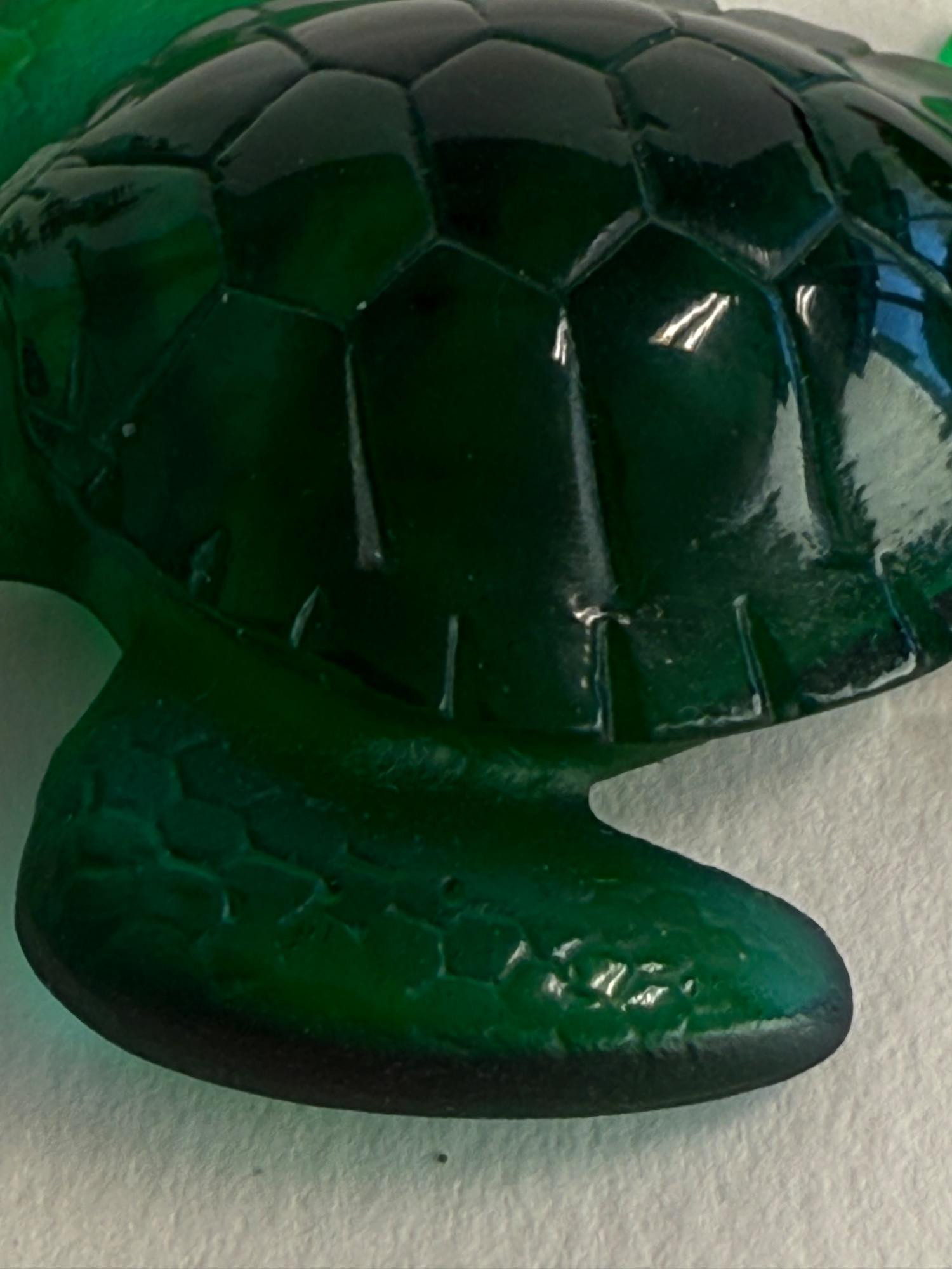 A beautifully crafted art glass turtle by the renowned French glassmaker Daum. This piece is signed and showcases the brand’s signature pâte de verre technique, producing rich coloration and stunning depth. The turtle features a deep emerald green body with delicate shell and flipper detailing, giving it a lifelike yet artistic appearance. Dimensions: 2.5 inches long x 2 inches wide Material: Pâte de verre Color: Deep emerald green with translucent and opaque tones Signature: Etched “Daum France” on the underside Origin: Made in France