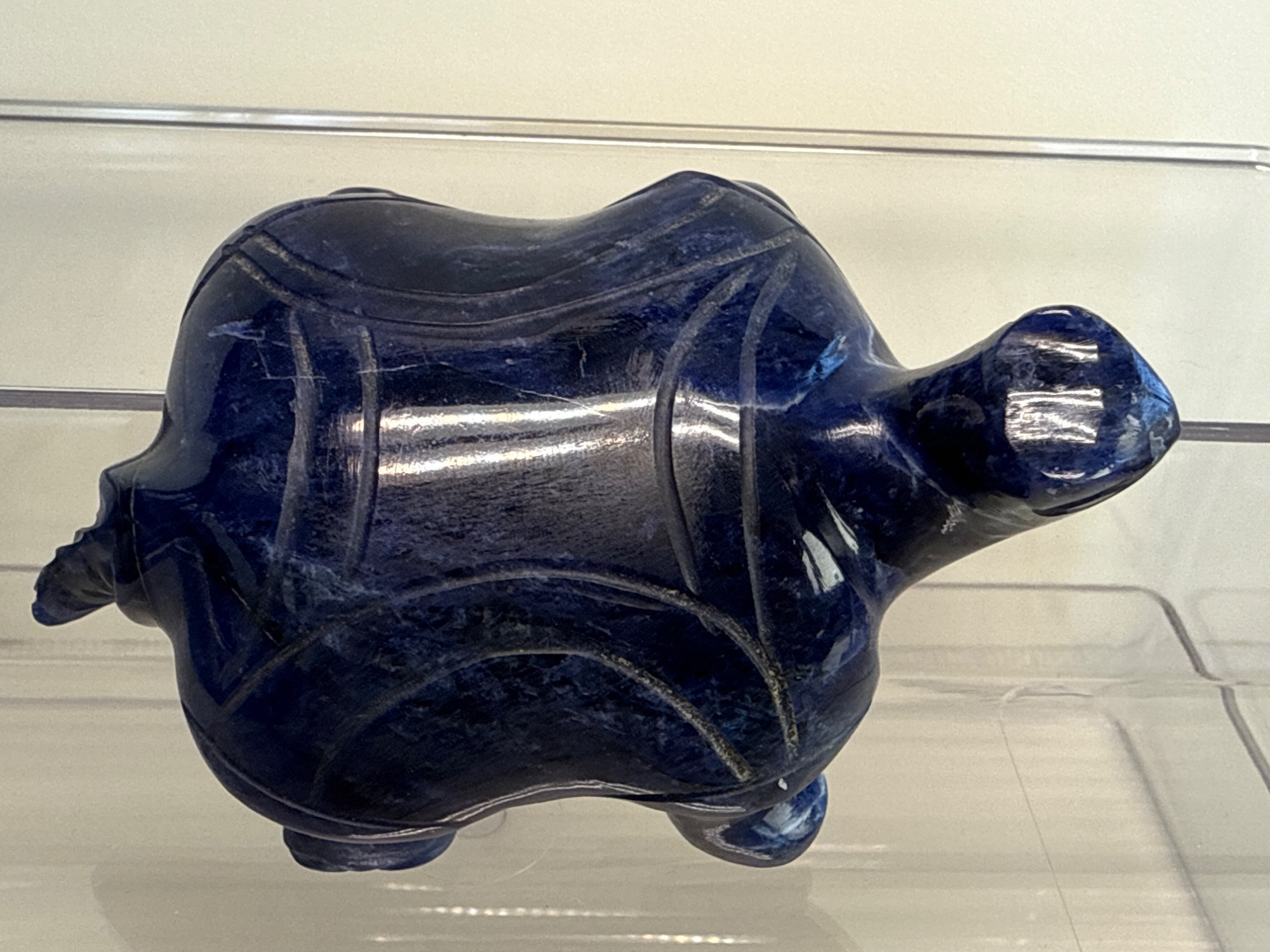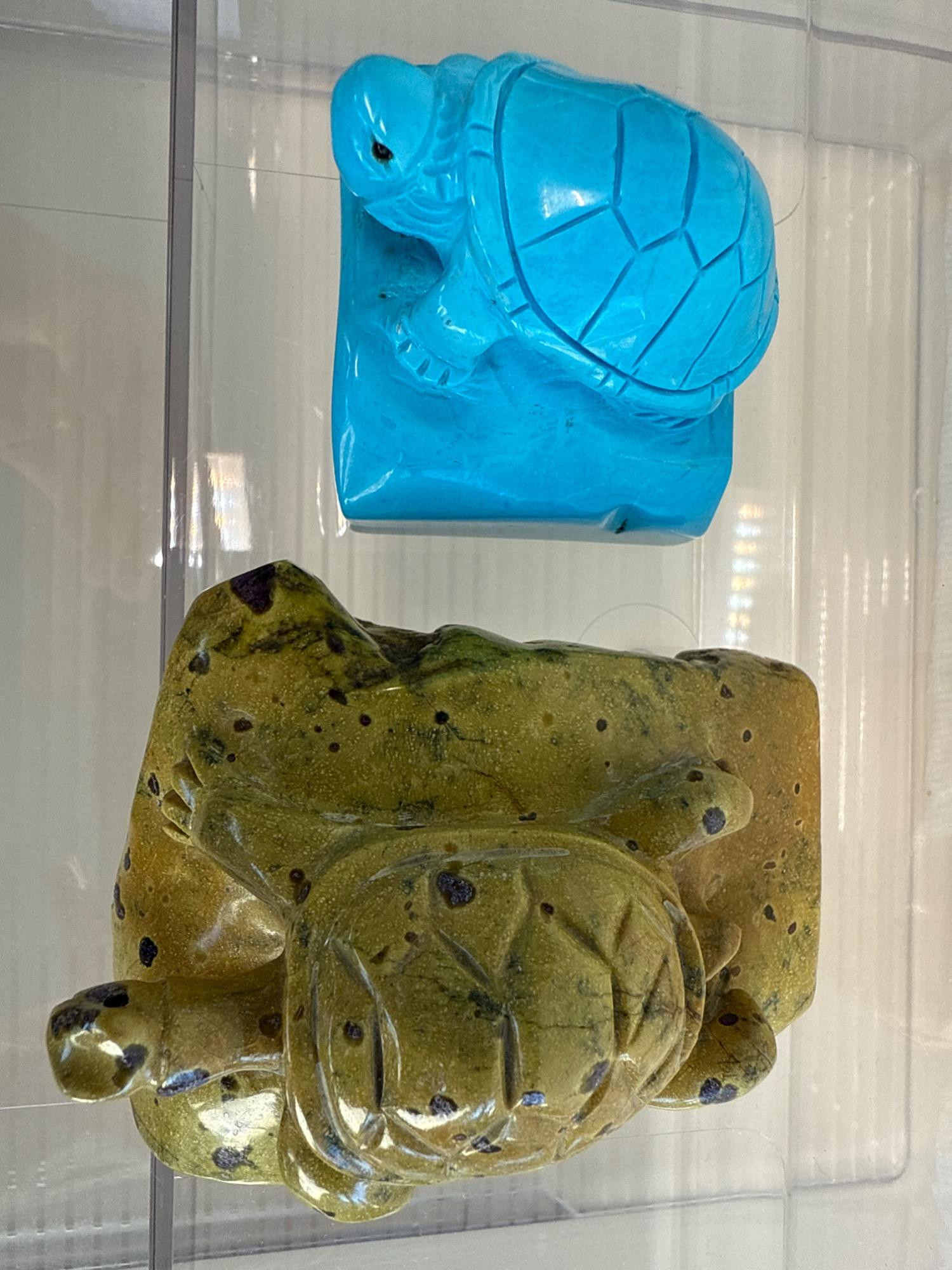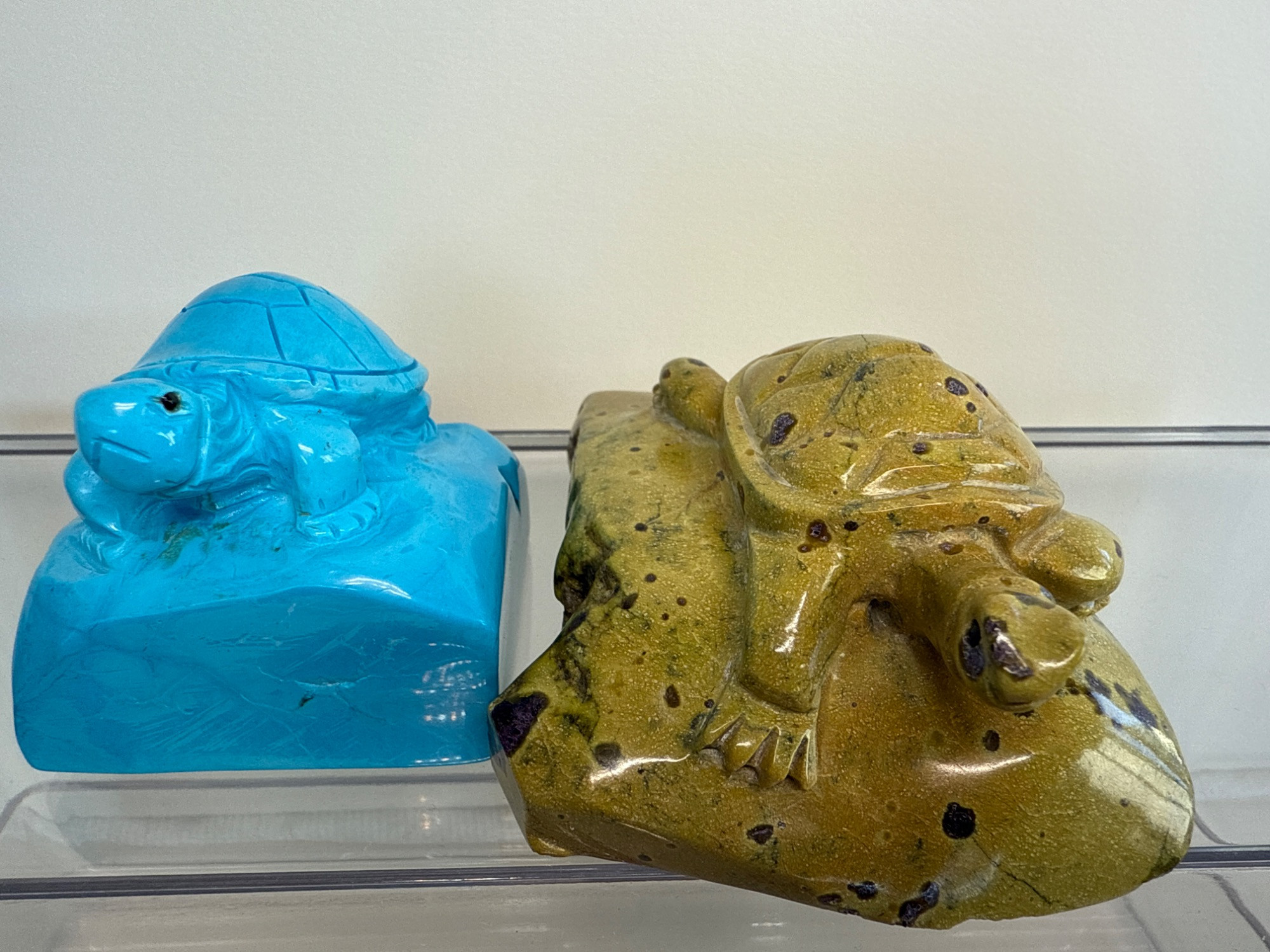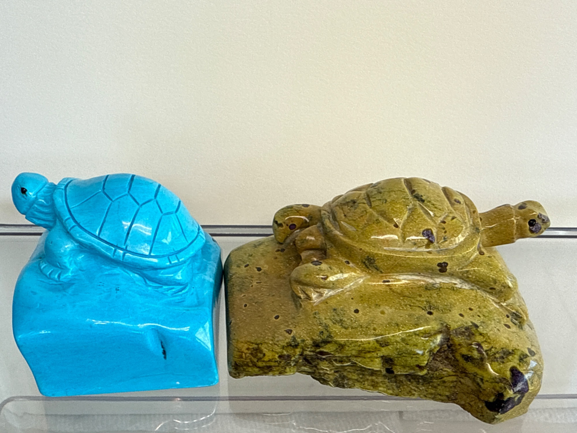 Add a charming and earthy touch to your space with this beautiful trio of hand-carved turtle sculptures, each crafted from distinct natural stone: Chinese Blue Jade Turtle – Deep blue tones with graceful curves and a smooth finish. Measures approx. 4.75" long, 2" tall, and 3" wide. Labeled and valued at $250 (tag included). Green Serpentine Turtle – Rich, marbled green coloring with detailed carving, resting on a naturalistic base. Dimensions: 3.75" long, 3" wide, 1.5" tall. Sticker on base reads “Altar Turtle - 70”. Blue Howlite Turtle – Vivid turquoise-like hue with squared-off base. Compact and eye-catching. Measures 2" long, 1.75" tall, and 2" wide.