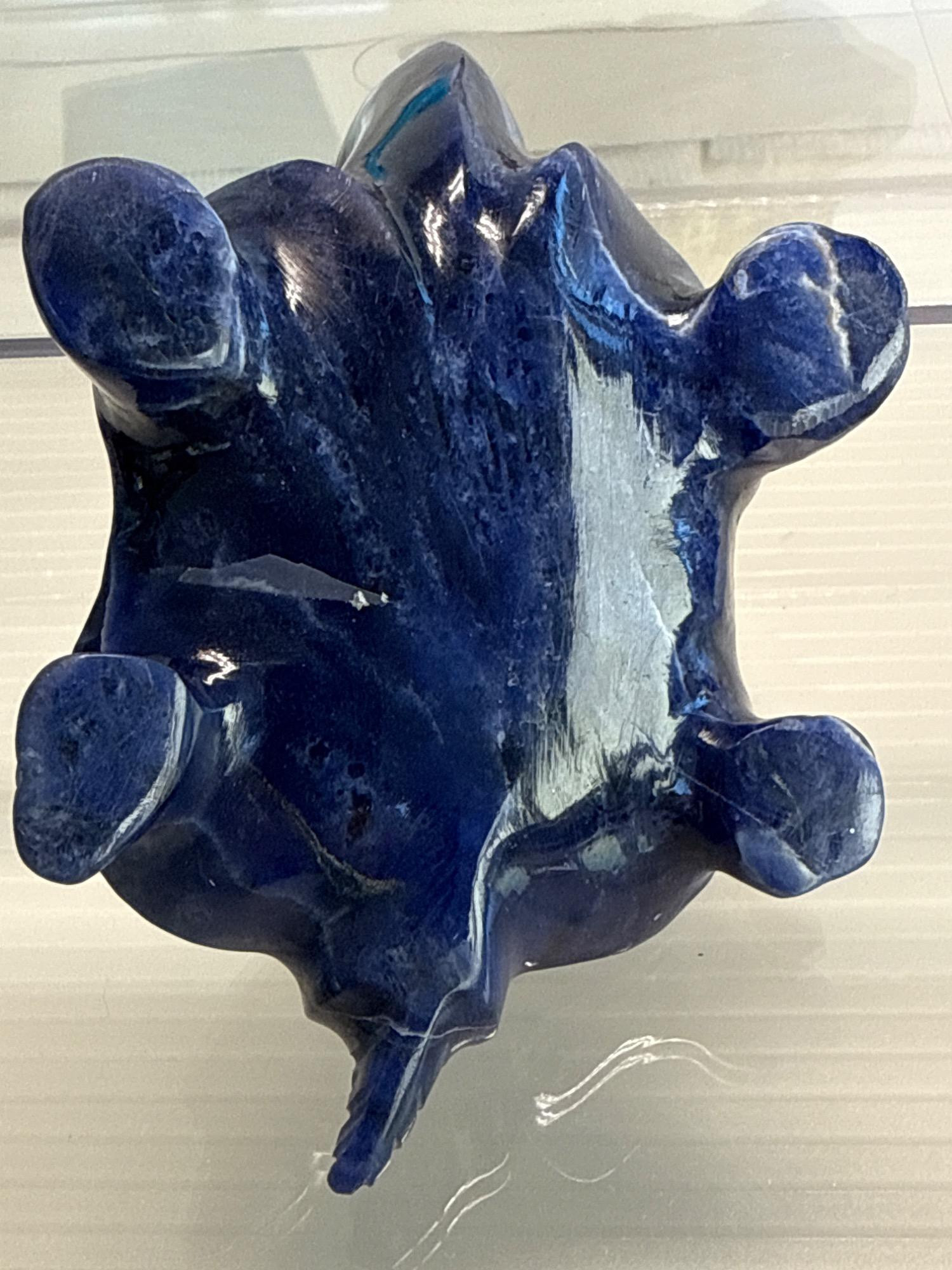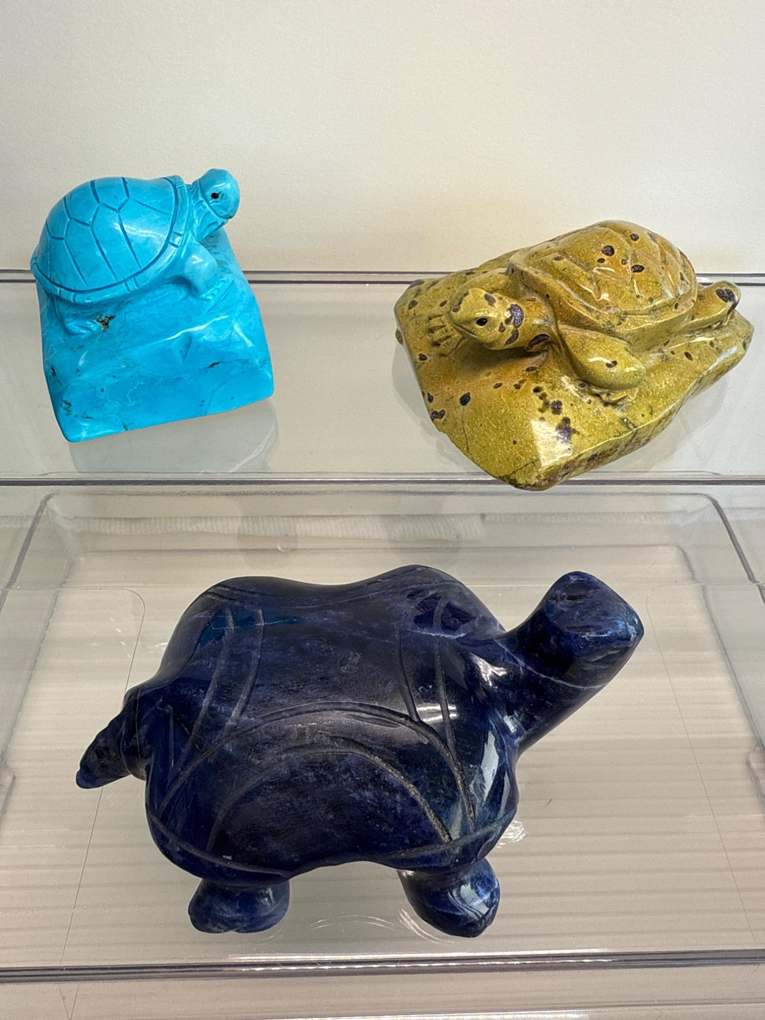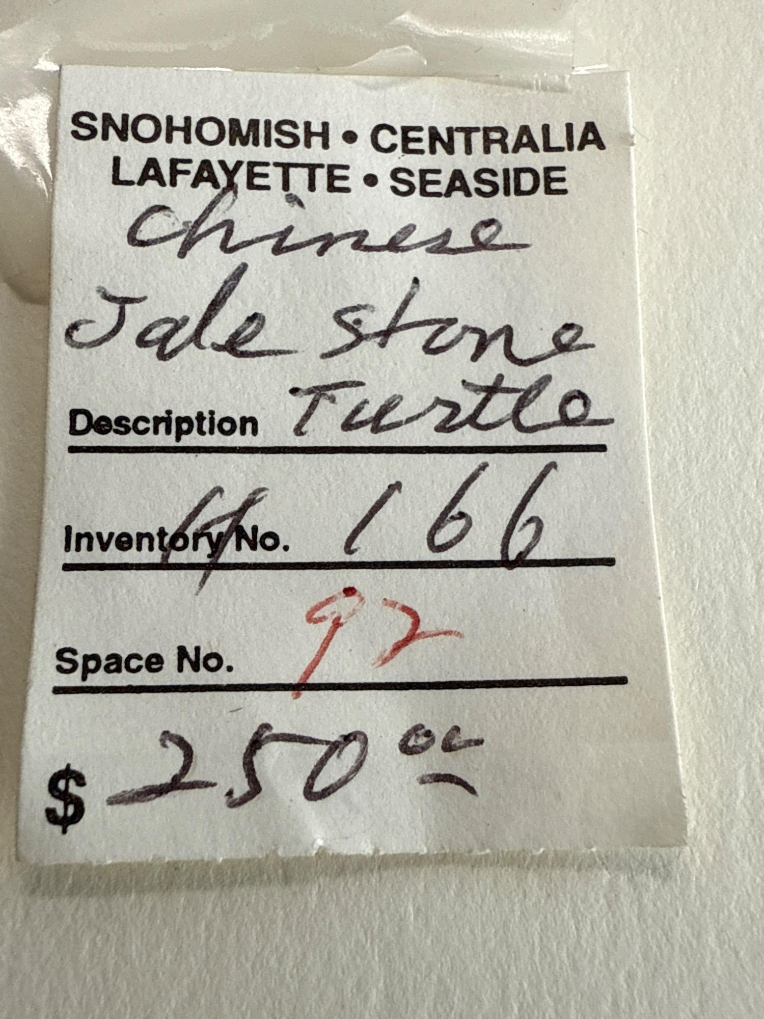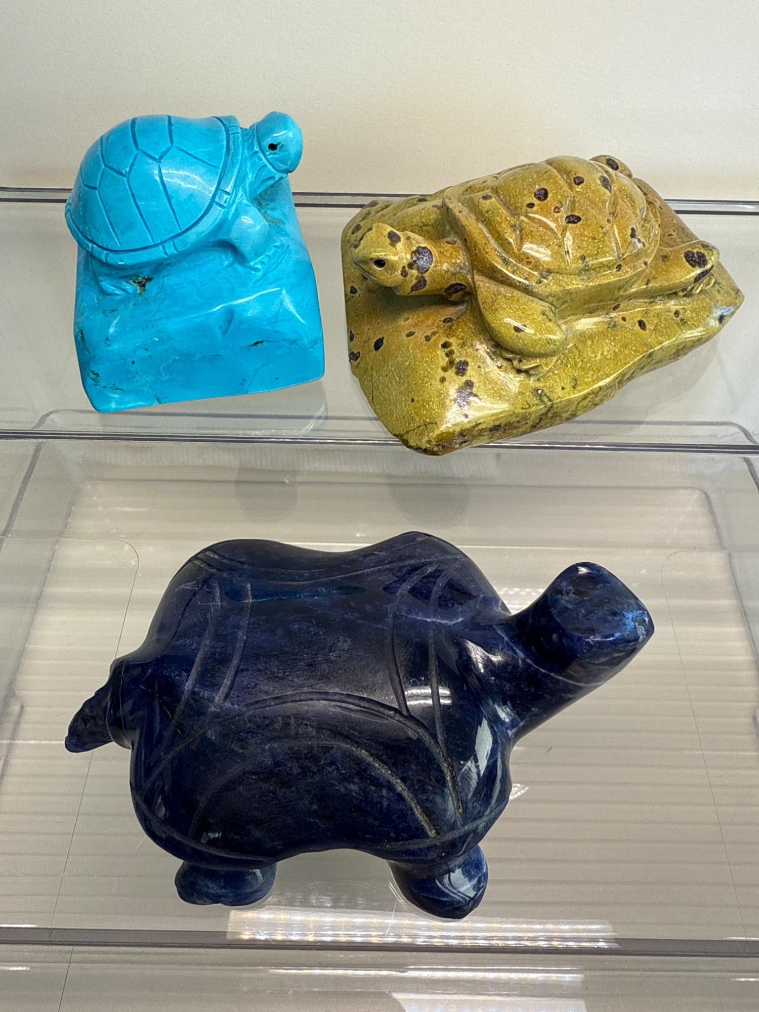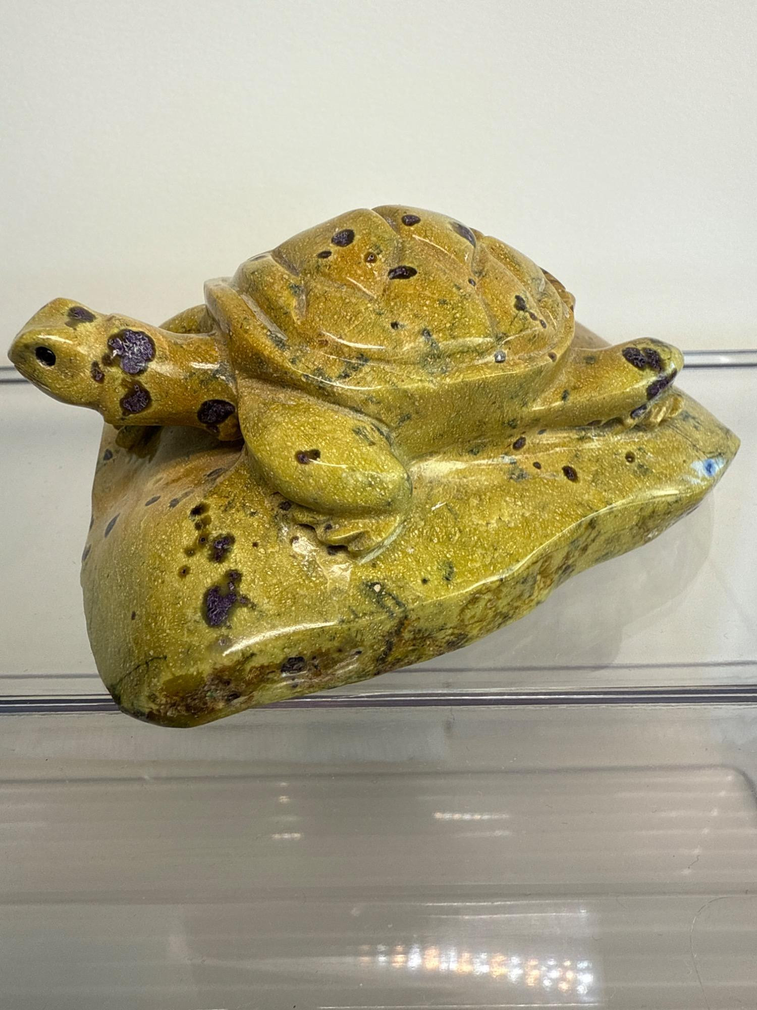Add a charming and earthy touch to your space with this beautiful trio of hand-carved turtle sculptures, each crafted from distinct natural stone: Chinese Blue Jade Turtle – Deep blue tones with graceful curves and a smooth finish. Measures approx. 4.75" long, 2" tall, and 3" wide. Labeled and valued at $250 (tag included). Green Serpentine Turtle – Rich, marbled green coloring with detailed carving, resting on a naturalistic base. Dimensions: 3.75" long, 3" wide, 1.5" tall. Sticker on base reads “Altar Turtle - 70”. Blue Howlite Turtle – Vivid turquoise-like hue with squared-off base. Compact and eye-catching. Measures 2" long, 1.75" tall, and 2" wide.