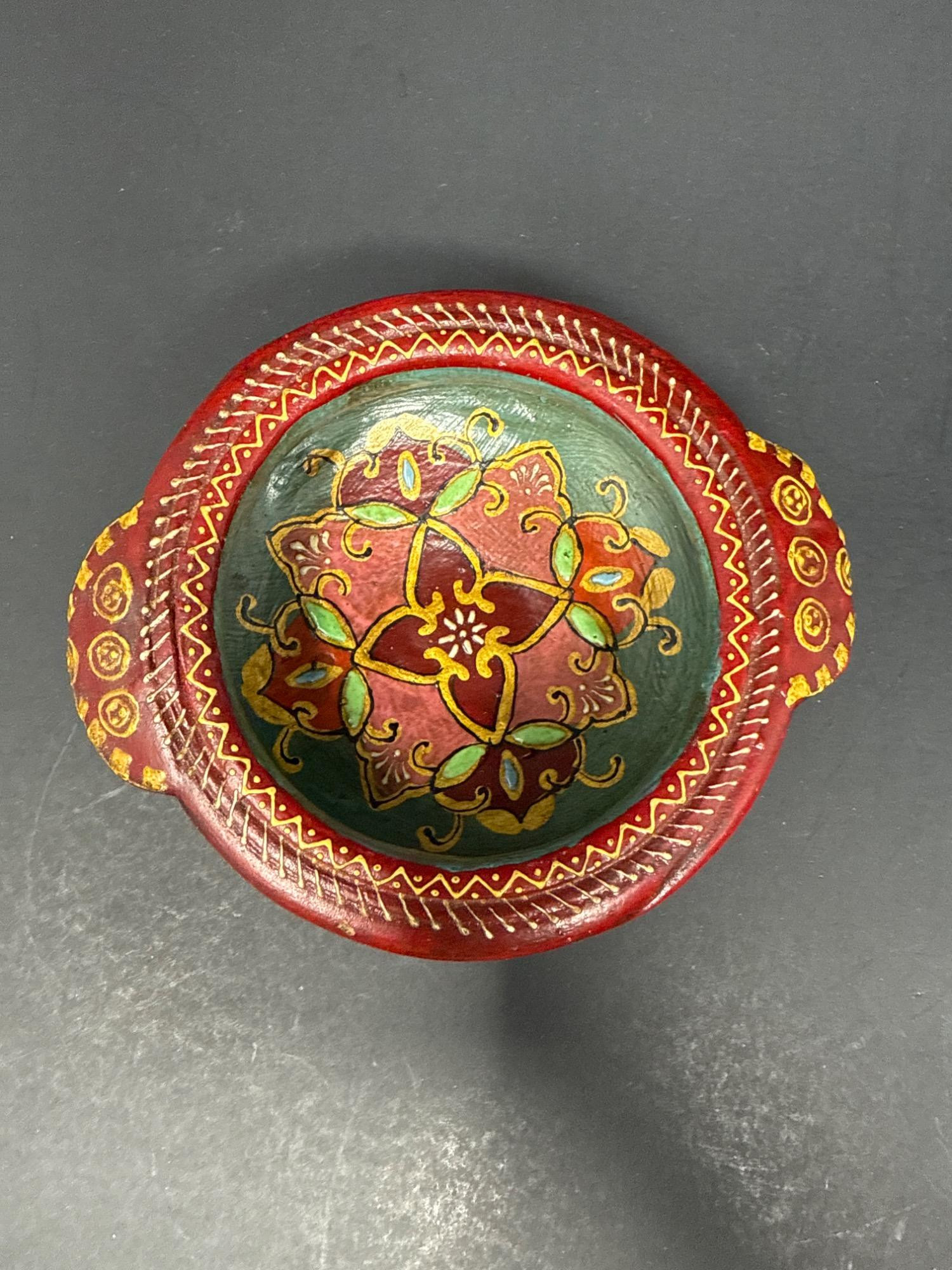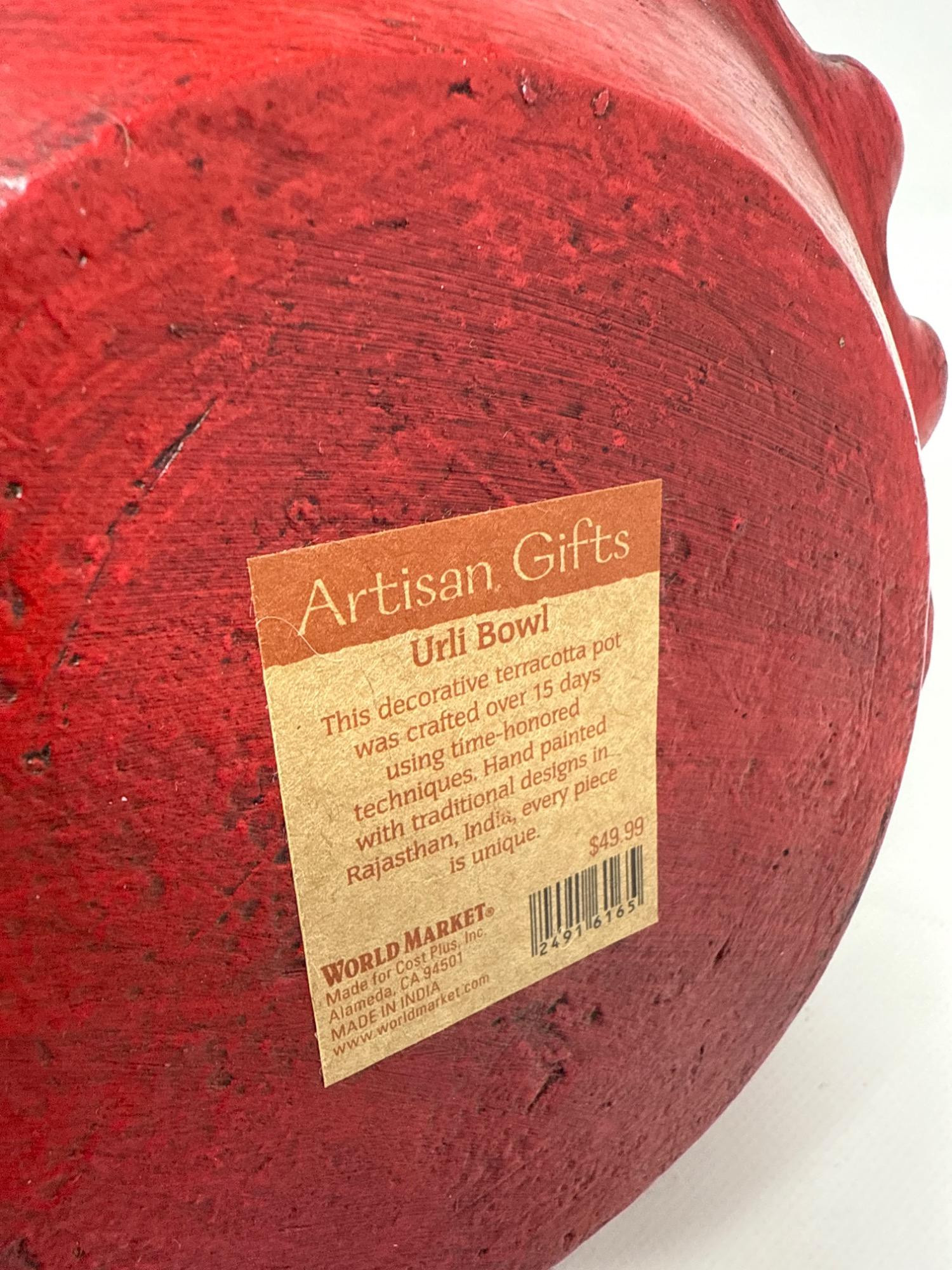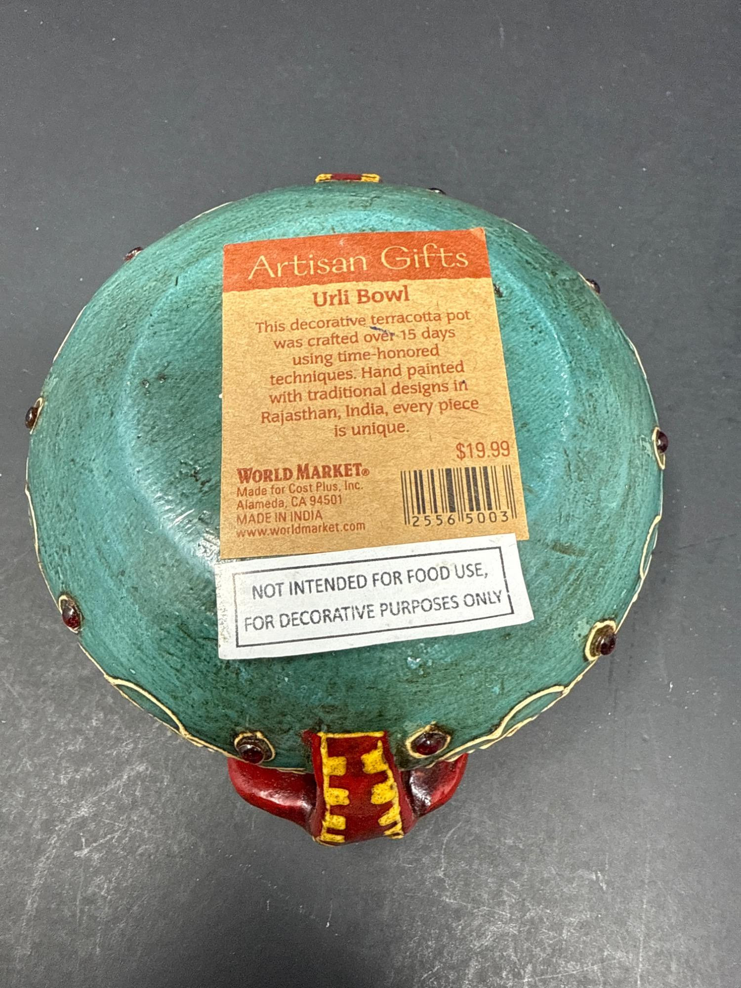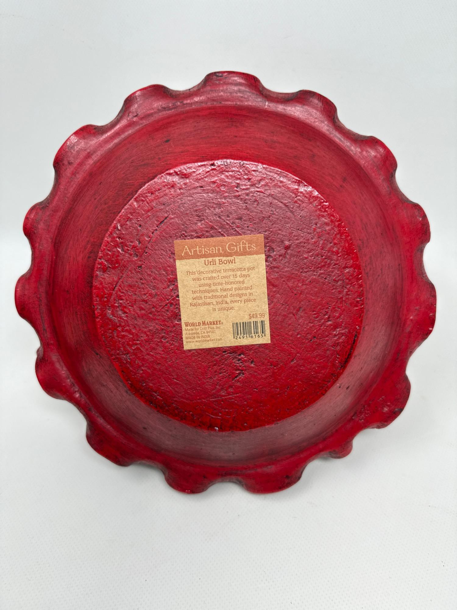 Bring a touch of handcrafted elegance to your home with this stunning pair of Urli terracotta bowls, richly hand-painted in vibrant traditional Indian patterns. Made in Rajasthan, India, each piece is crafted over 15 days using time-honored techniques, ensuring no two bowls are exactly alike. Includes: 2 bowls (one large, one small) Dimensions: Large bowl: approx. 10.5” W x 6” H Small bowl: approx. 5.5” W x 2” H Material: Terracotta Finish: Hand-painted with intricate detailing Origin: Made in India for World Market Use: Decorative only – not intended for food use