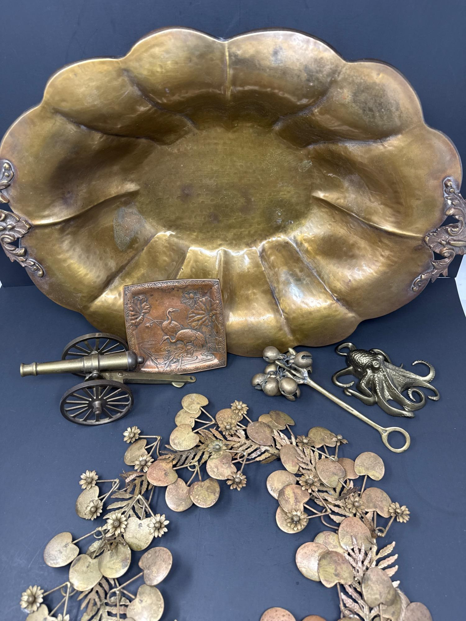 Add timeless charm to your space with this 6-piece collection of vintage brass and copper decor. Each item brings its own character, from intricate embossed details to aged patina. Brass & Copper Floral Wreath – Approx. 14.5" wide. Eye-catching wall decor with layered botanical details. Square Copper Tray – Embossed with a crane and lotus design. Octopus Wall Hook – Heavy solid brass with detailed tentacles. Functional and decorative. Miniature Brass Cannon – Movable wheels and great vintage appeal. Brass Bell Cluster – Unusual design with multiple bells and a handle—possible use as a ringer or chime. Large Decorative Brass Bowl – Approx. 22" long x 15" wide. Ornate with a scalloped rim and curled feet. Labeled for decorative use only (Made in India by Decorative Crafts Inc.).