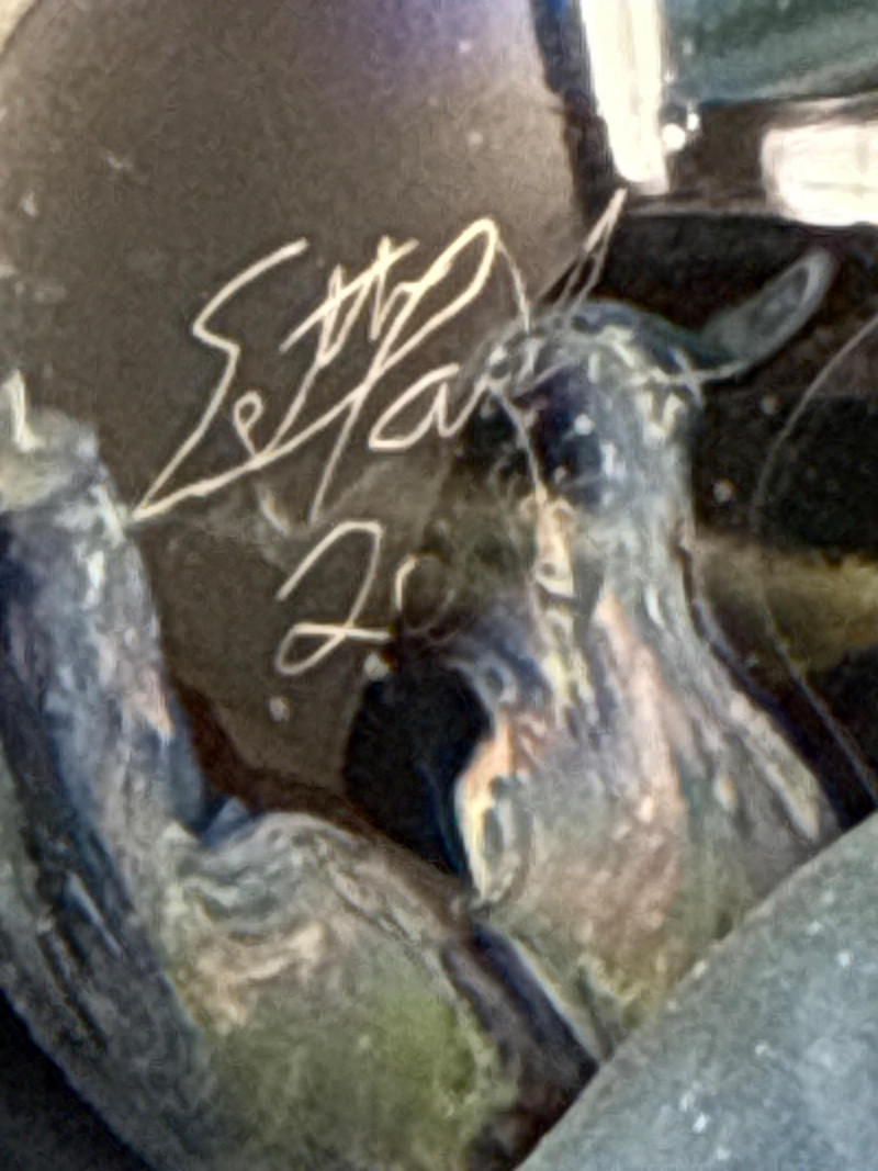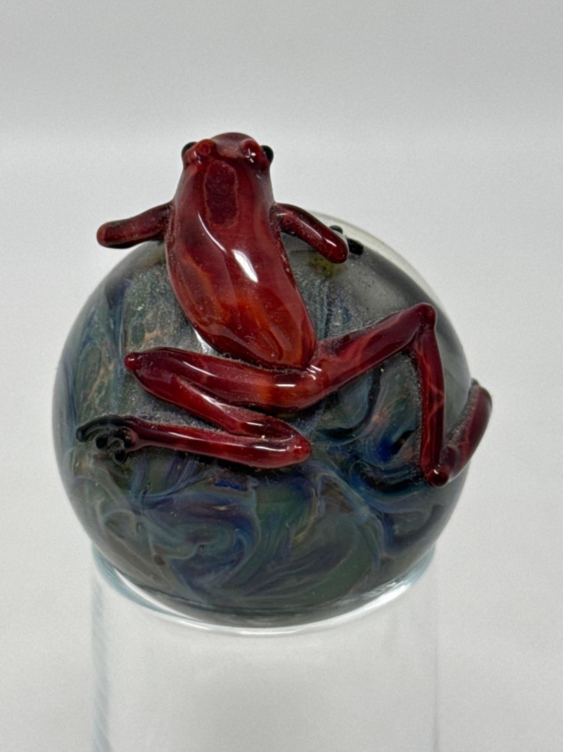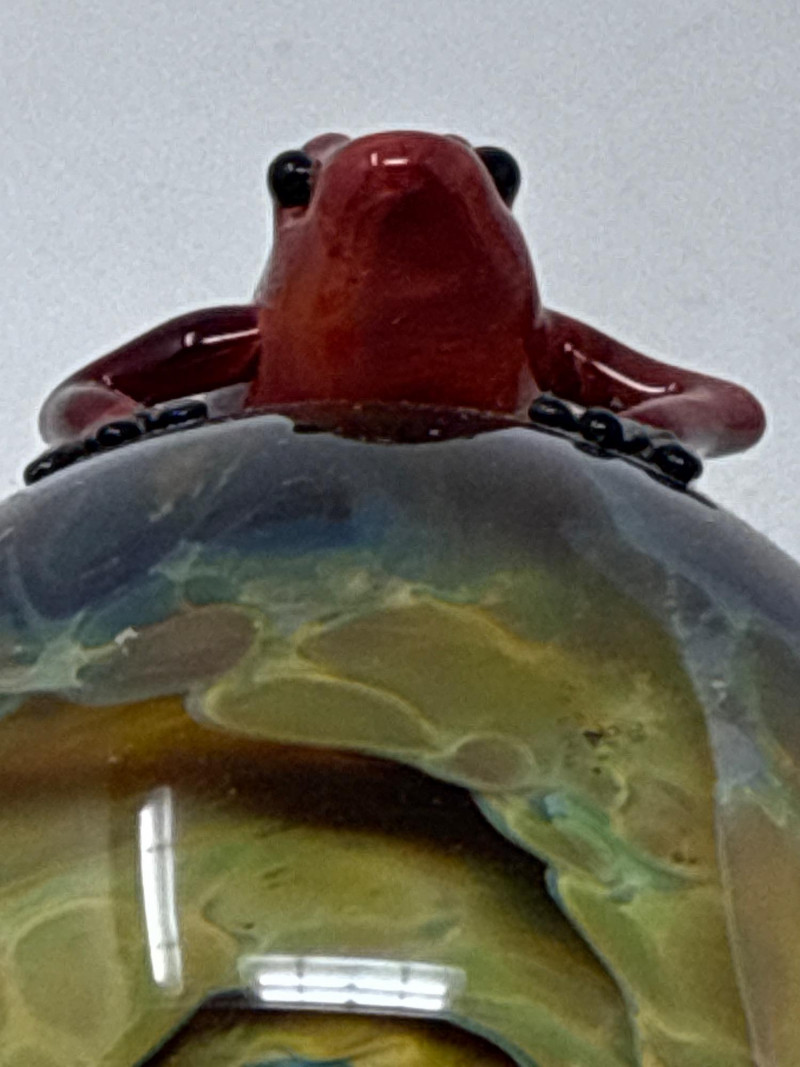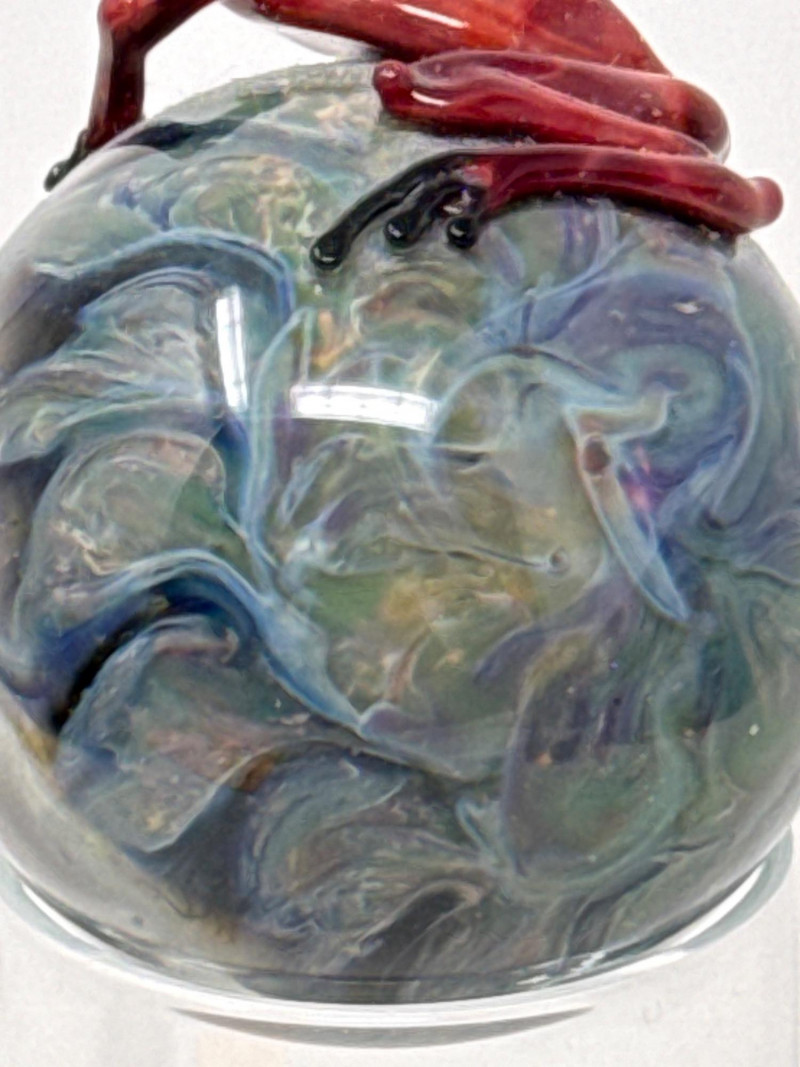 This stunning art glass sculpture by acclaimed artist Seth Parks features a vibrant red frog perched atop a multicolored swirl ball. The intricate detailing of the amphibian, paired with the swirling hues of deep blue, green, and amber within the glass, creates a dynamic and captivating piece. Key Features: Artist: Seth Parks (Signed on the base) Design: Red frog atop a hand-blown swirl ball Color Palette: Deep reds, greens, blues, and golds Theme: Amphibian/Nature-inspired glass art Style: Contemporary art glass sculpture Size: 2 tall