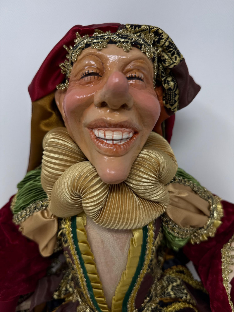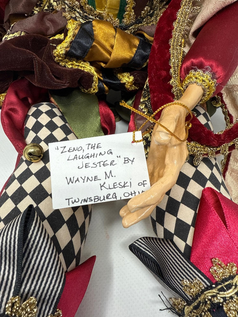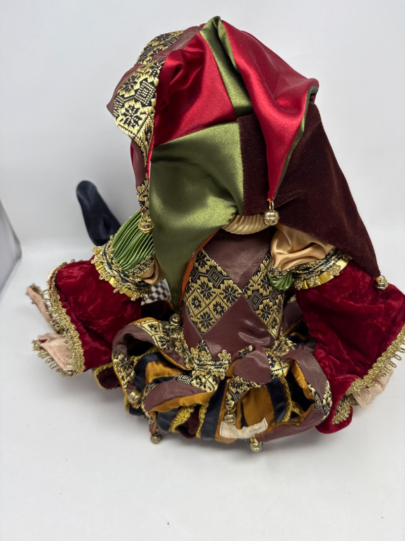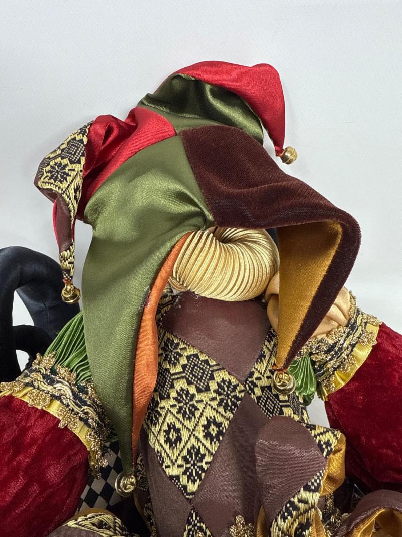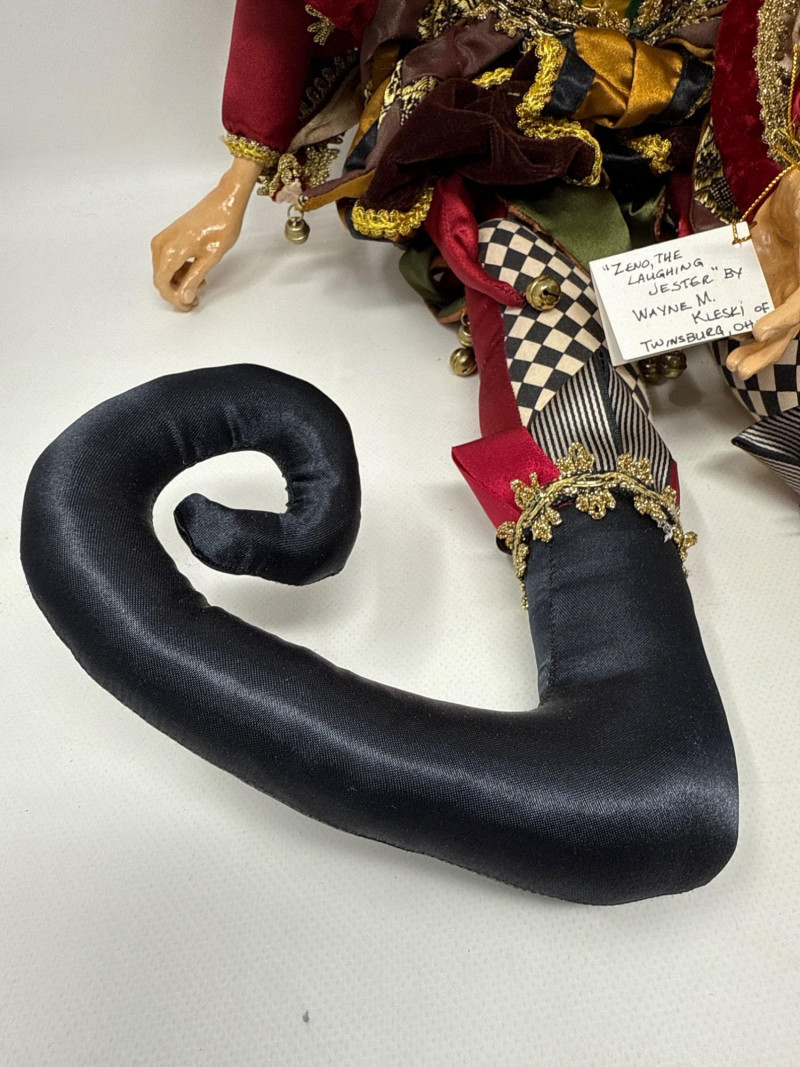 Bring joy and whimsy to your space with Zeno, the Laughing Jester, a handcrafted collectible by renowned artist Wayne M. Kleski. Zeno features a cheerful, expressive face and wears an elaborate harlequin outfit made of rich velvet, brocade, and metallic trim in red, gold, green, and black. Features: Artist: Wayne M. Kleski Design: Cheerful, sculpted face with theatrical jester expression Costume: Detailed harlequin attire with curled-toe slippers, oversized bow tie, and signature pointed hat Embellishments: Gold jingle bells, hand-sewn trim, and multi-textured fabrics Size: 27 inches tall