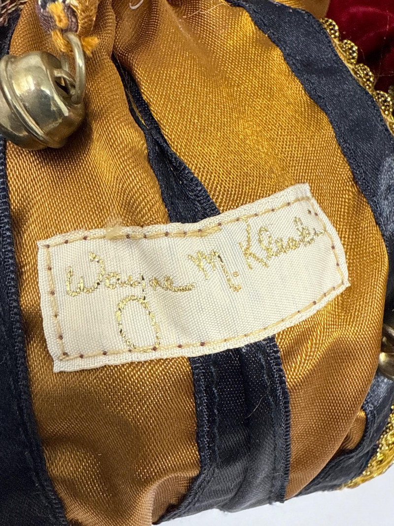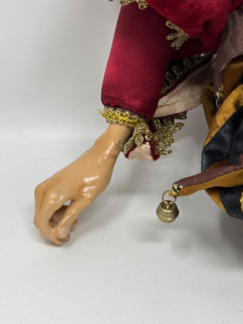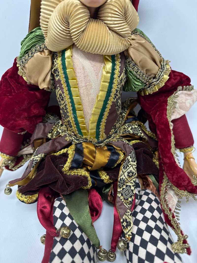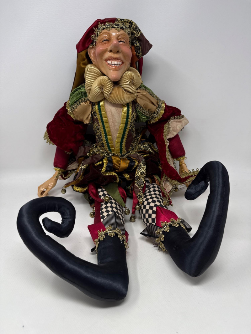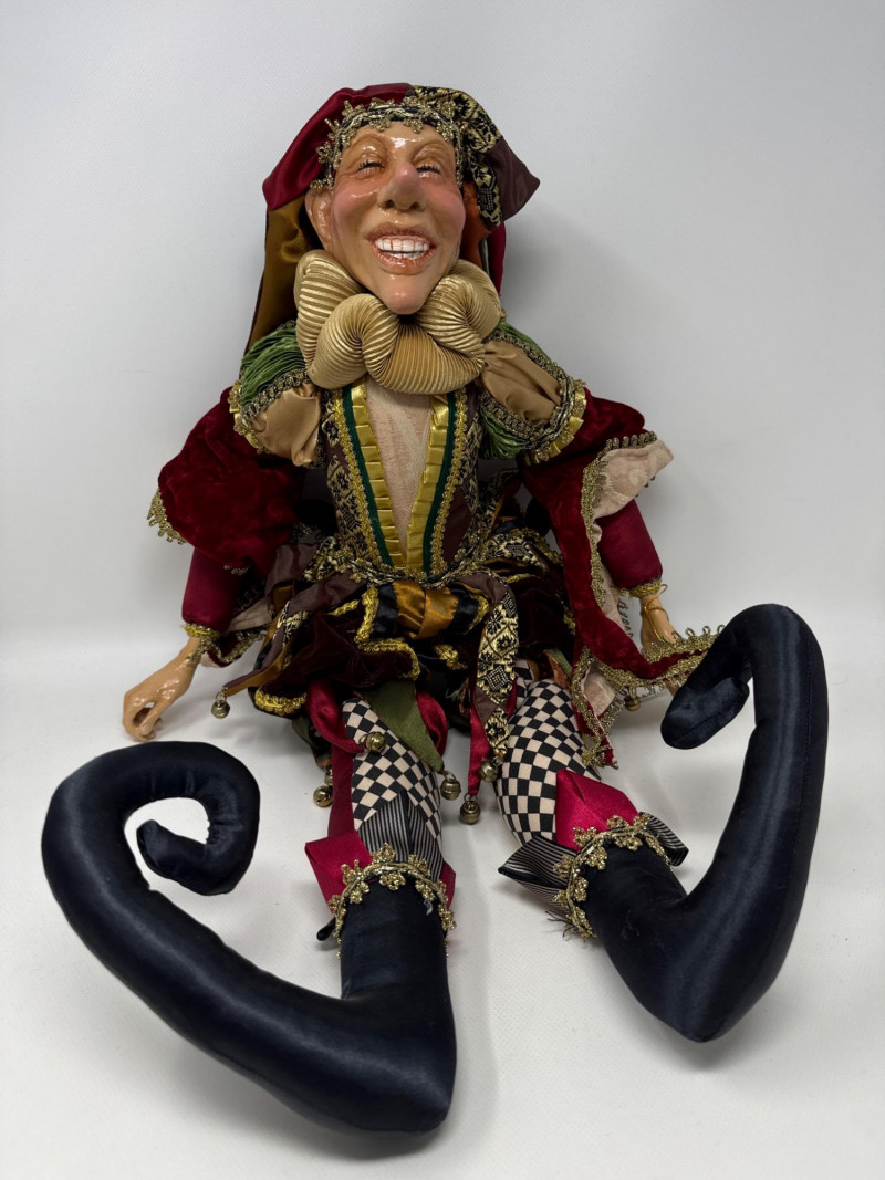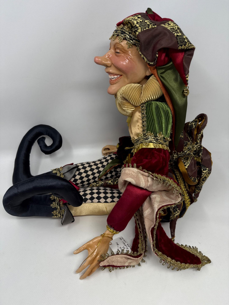 Bring joy and whimsy to your space with Zeno, the Laughing Jester, a handcrafted collectible by renowned artist Wayne M. Kleski. Zeno features a cheerful, expressive face and wears an elaborate harlequin outfit made of rich velvet, brocade, and metallic trim in red, gold, green, and black. Features: Artist: Wayne M. Kleski Design: Cheerful, sculpted face with theatrical jester expression Costume: Detailed harlequin attire with curled-toe slippers, oversized bow tie, and signature pointed hat Embellishments: Gold jingle bells, hand-sewn trim, and multi-textured fabrics Size: 27 inches tall